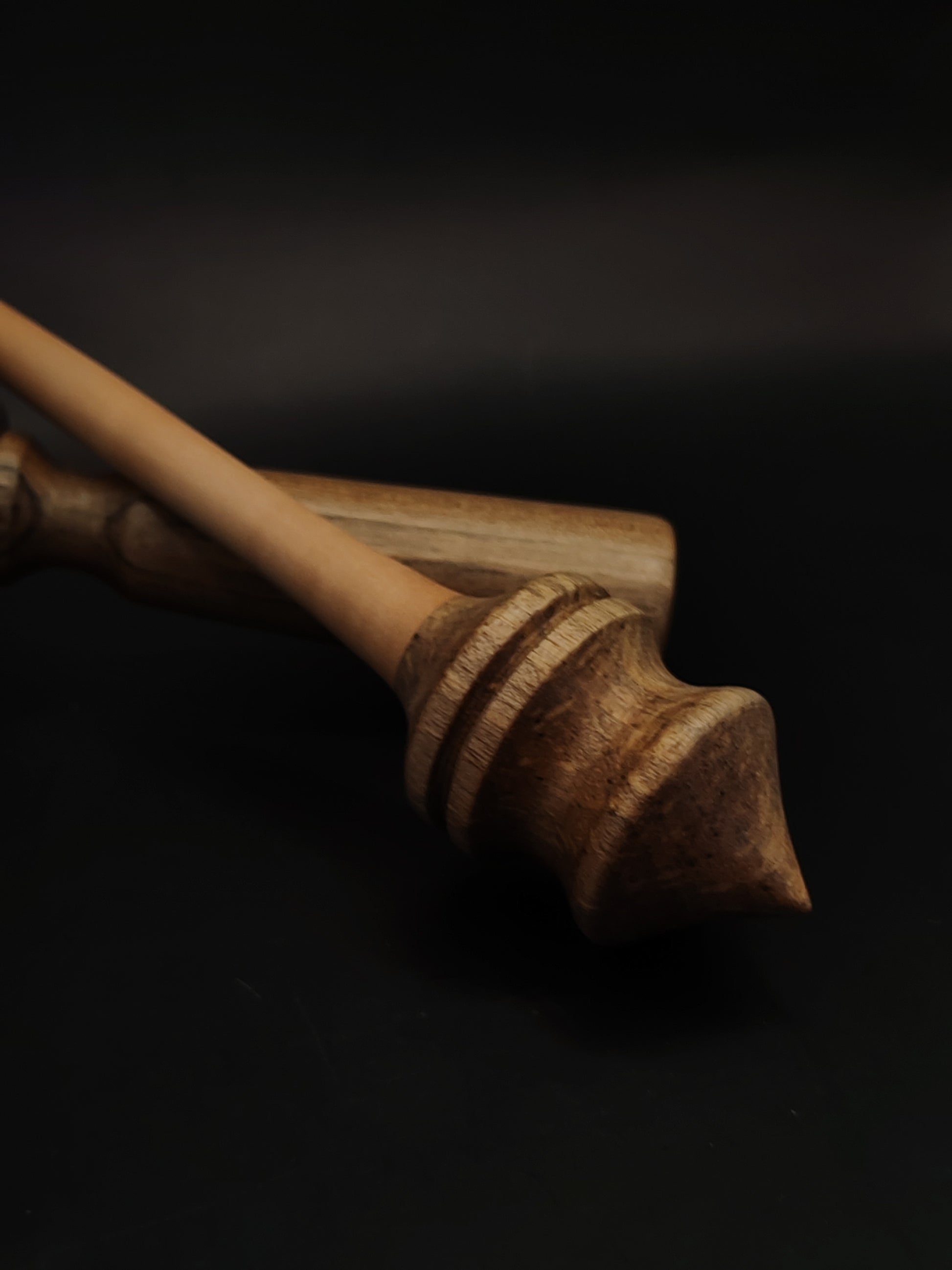 The aged walnut whorl brings depth of color, density, and smooth rotation, while apple wood adds warmth and responsiveness to the shaft. The walnut lap support bowl offers a wide, stable base that allows long spin times with minimal interruption.
