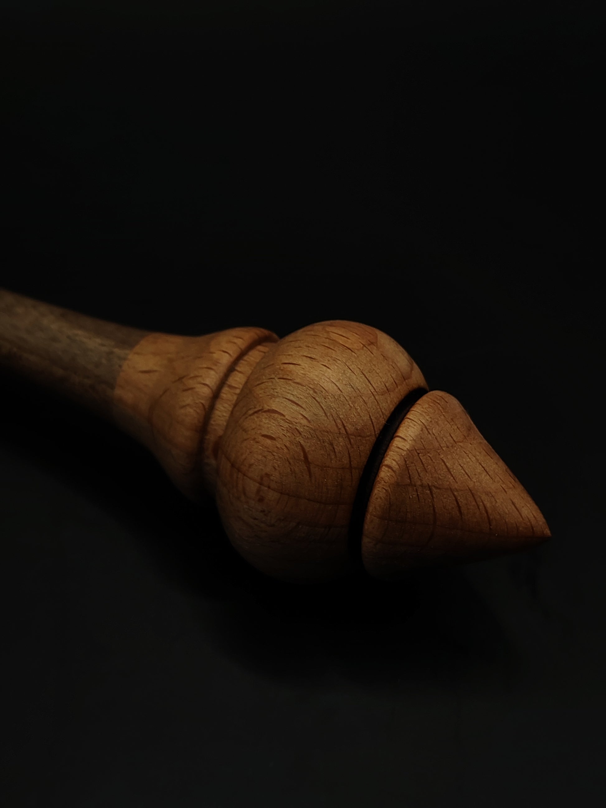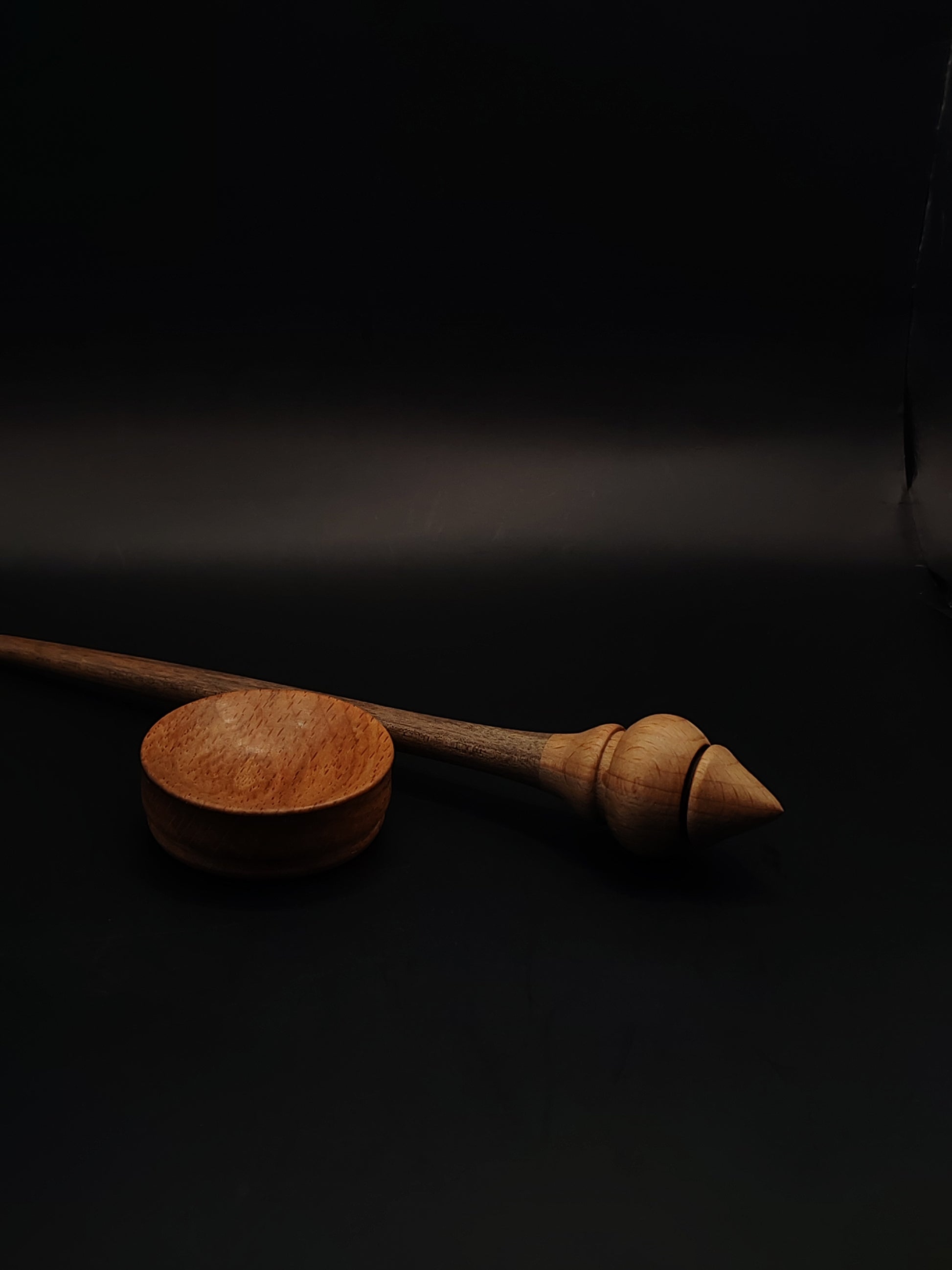 Beech offers reliability and even balance at the whorl, while walnut adds strength and a refined feel to the shaft. The matching beech bowl creates a cohesive set with a smooth spinning surface and neutral, elegant appearance.
