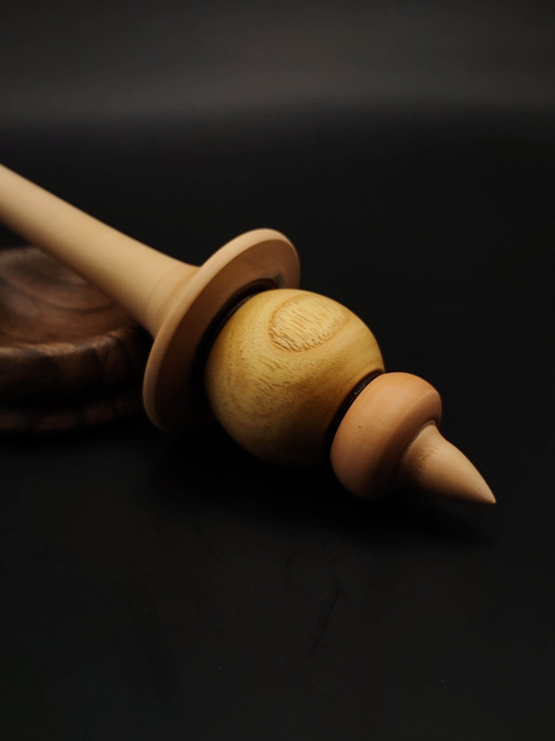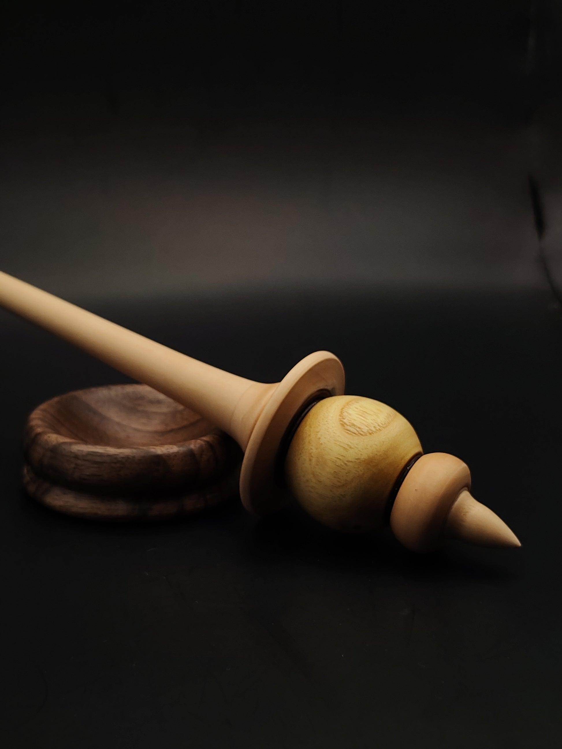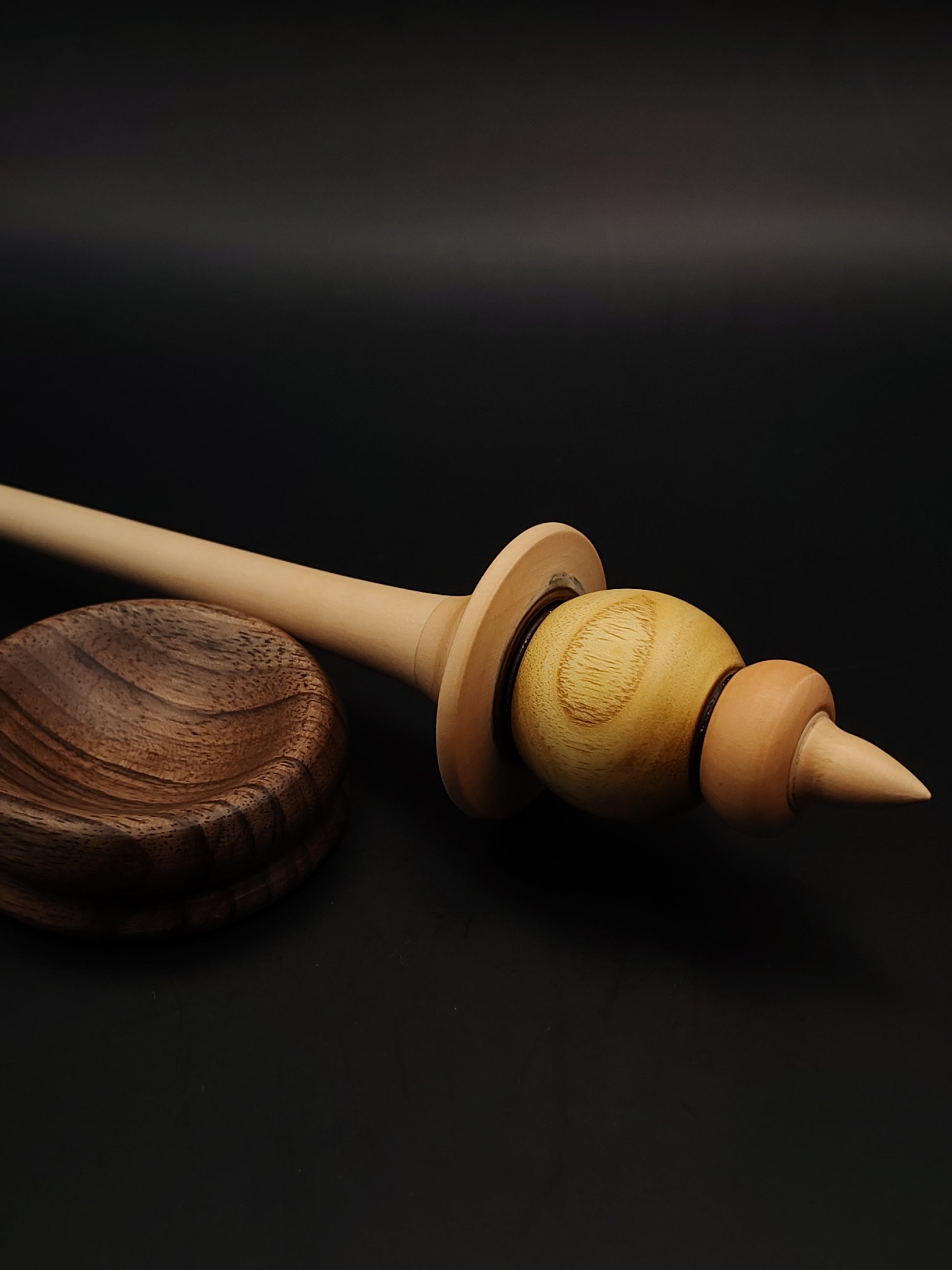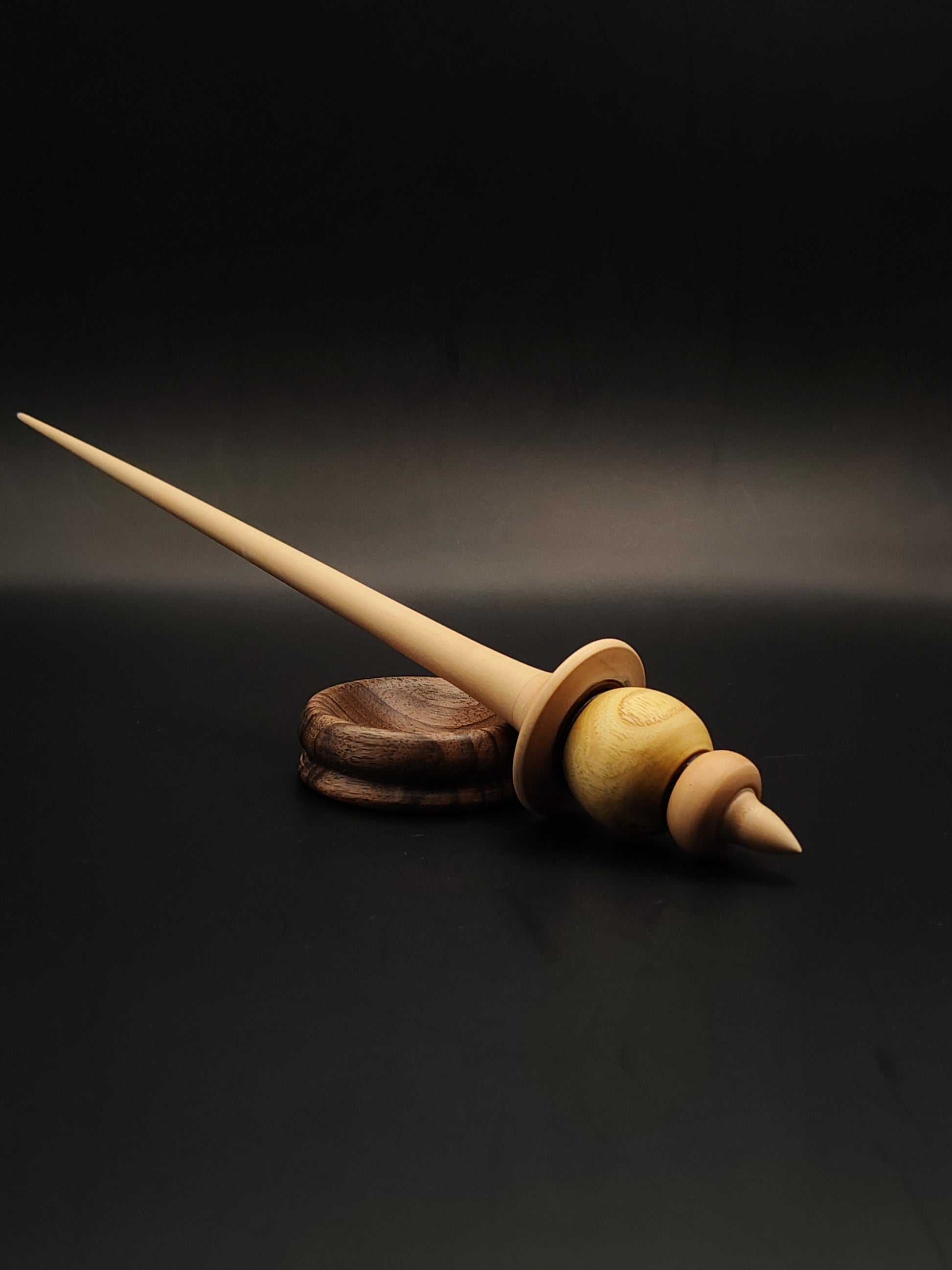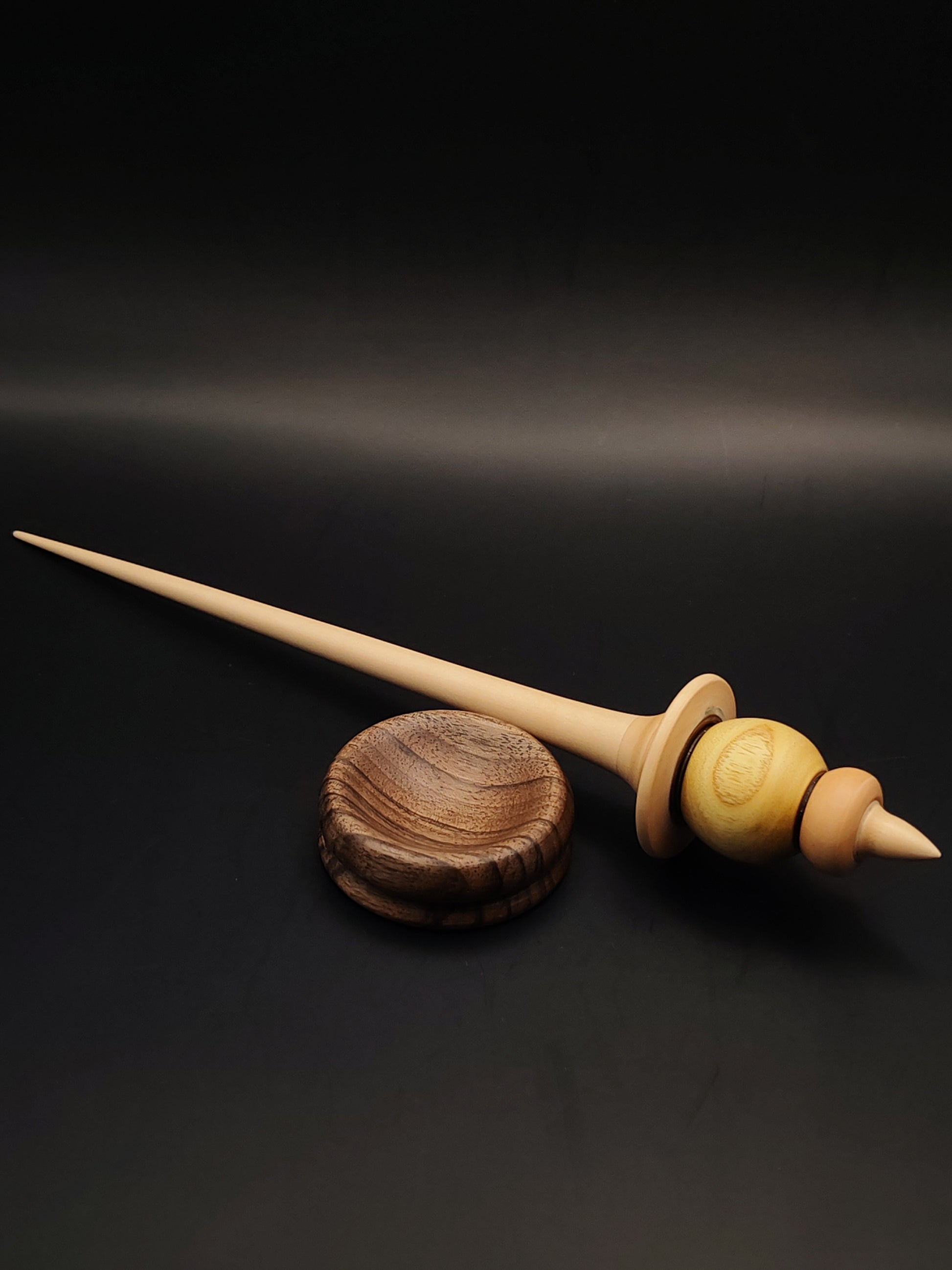 Support Spindle – Pear & Mulberry Wood – 25g / 0.88oz, 26.5cm / 10.43in – With Walnut Support Bowl | Balanced Spindle for Supported Spinning | Kravelli Spindles