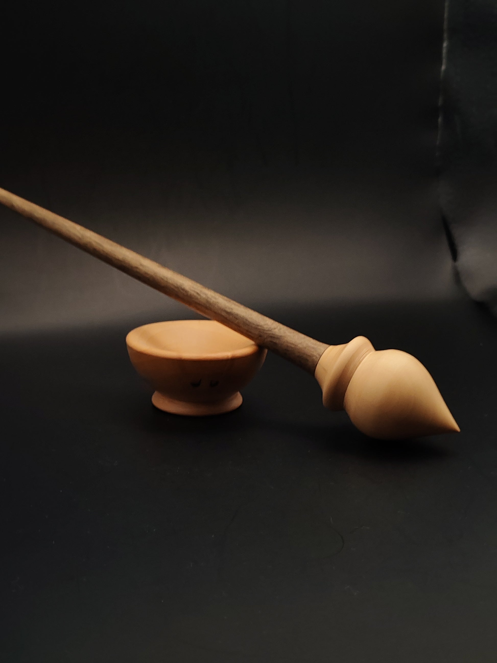 The set includes a pear wood support bowl, shaped for quiet, low-resistance motion and a cohesive match to the spindle’s natural tones. The slightly tapered shaft and balanced whorl deliver smooth acceleration and sustained spin time.