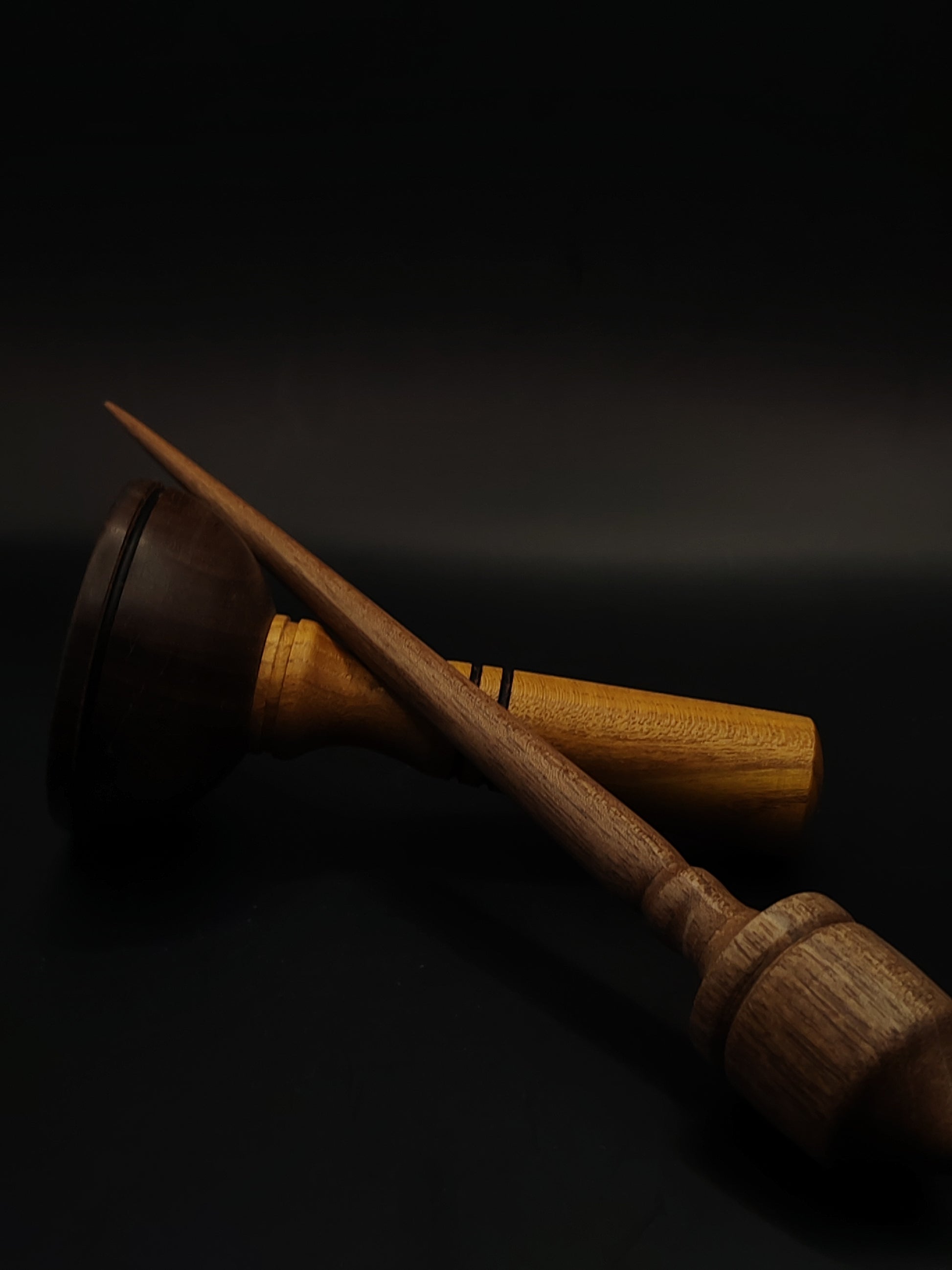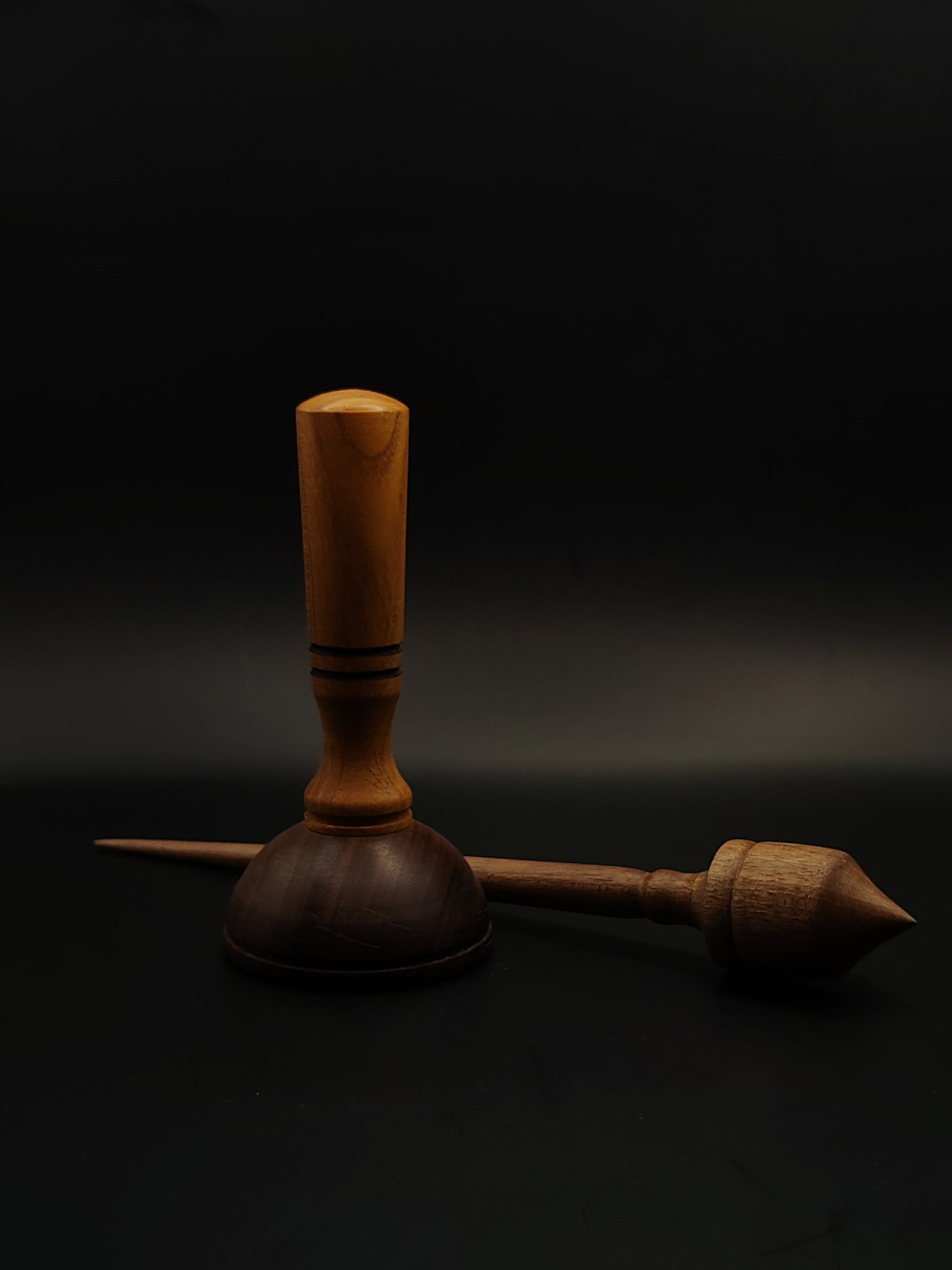 This refined support spindle set showcases the natural beauty of walnut wood paired with the warmth of mulberry. The spindle, crafted from walnut, measures 24.5 cm (9.65 inches) in length and weighs 23 g (0.81 oz), offering smooth momentum and excellent balance for controlled, consistent spinning.