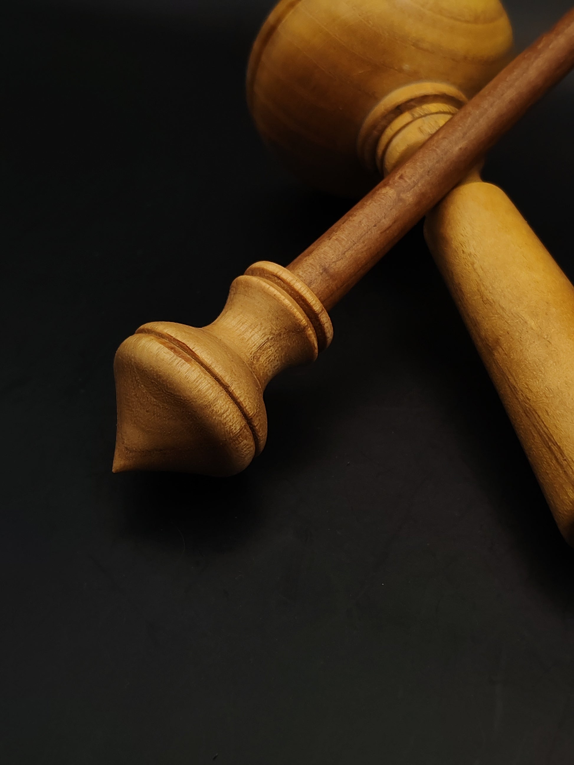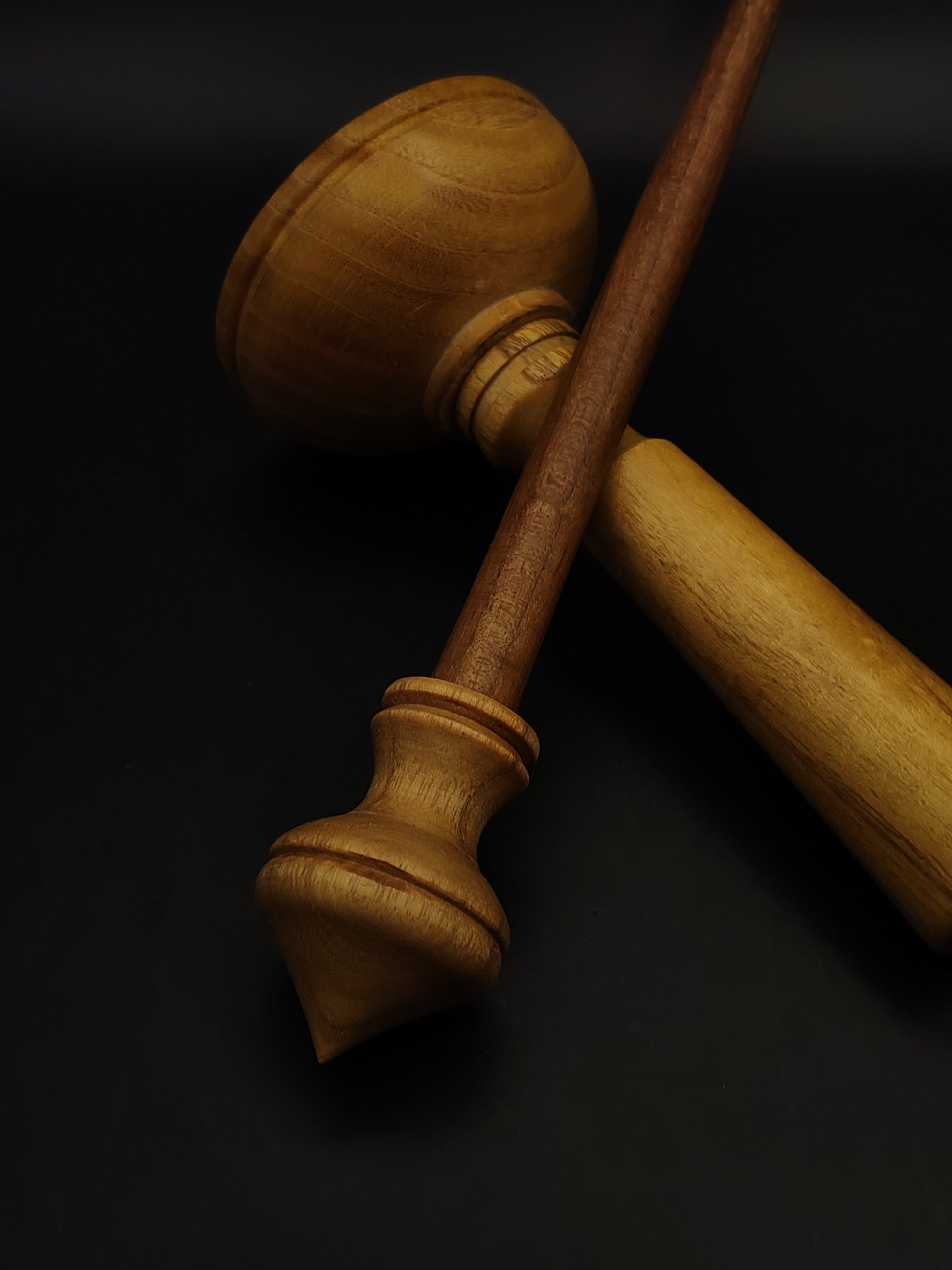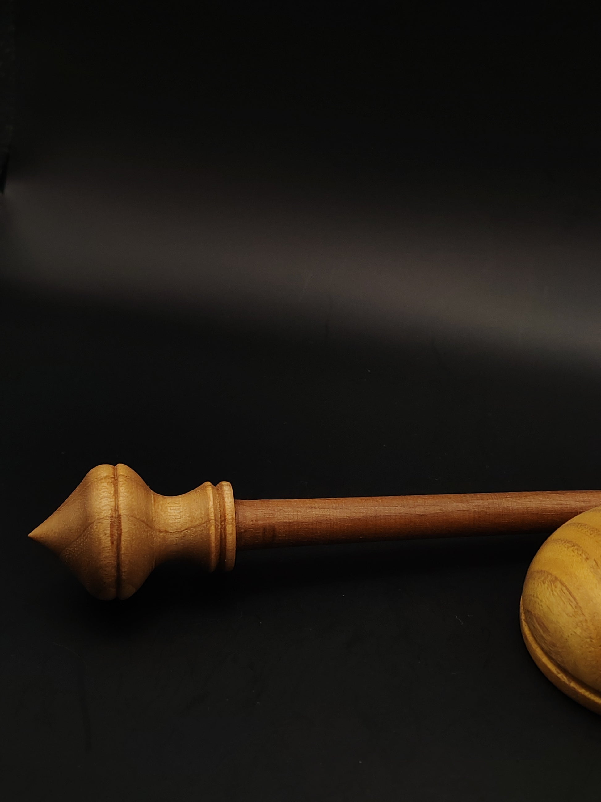 This support spindle set features a lively combination of a walnut shaft and mulberry whorl, blending strength and lightness into one graceful tool. The spindle weighs just 19 grams (0.67 oz) and measures 25 cm (9.84 inches), offering smooth, controlled spins for fine and medium fibers.
