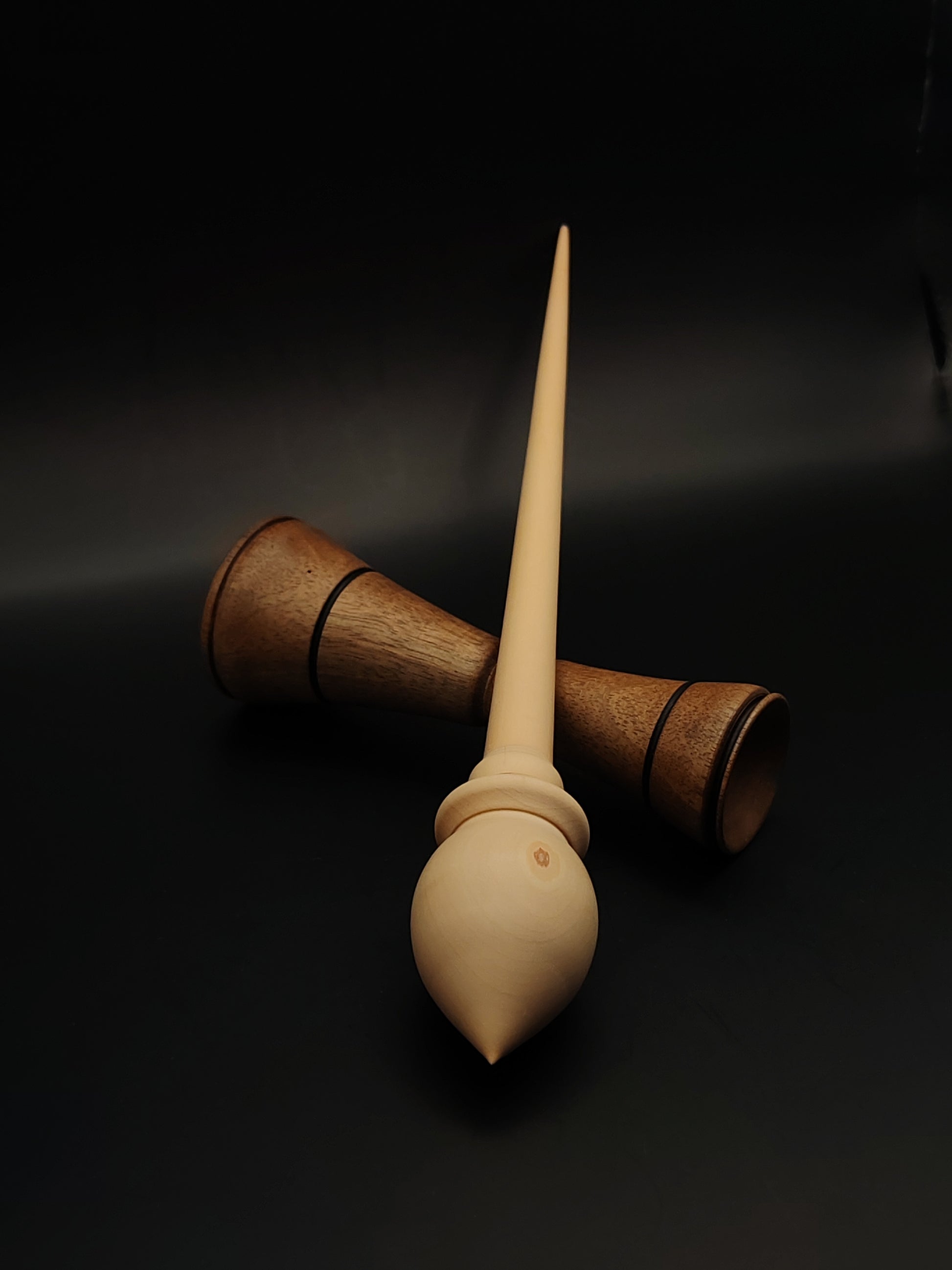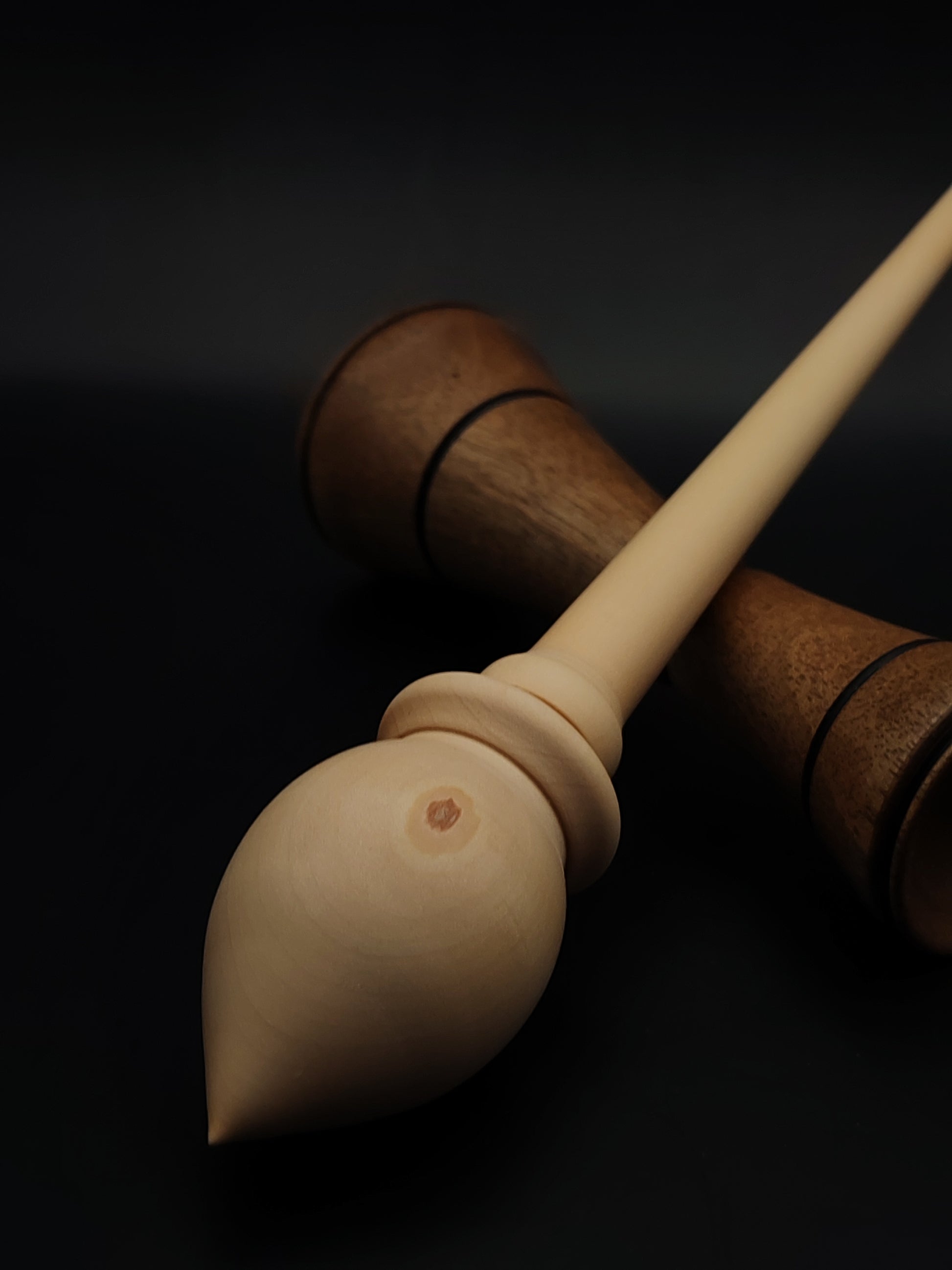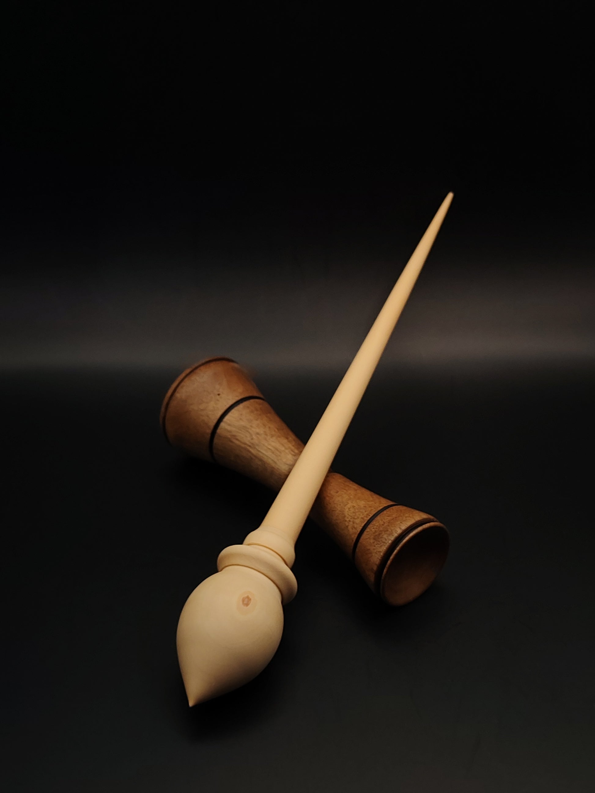 The set includes a walnut lap support bowl, designed for ergonomic spinning with a stable, low-friction surface. The contrasting tones of white pear and walnut make this set visually distinctive, while the functional balance ensures excellent performance.