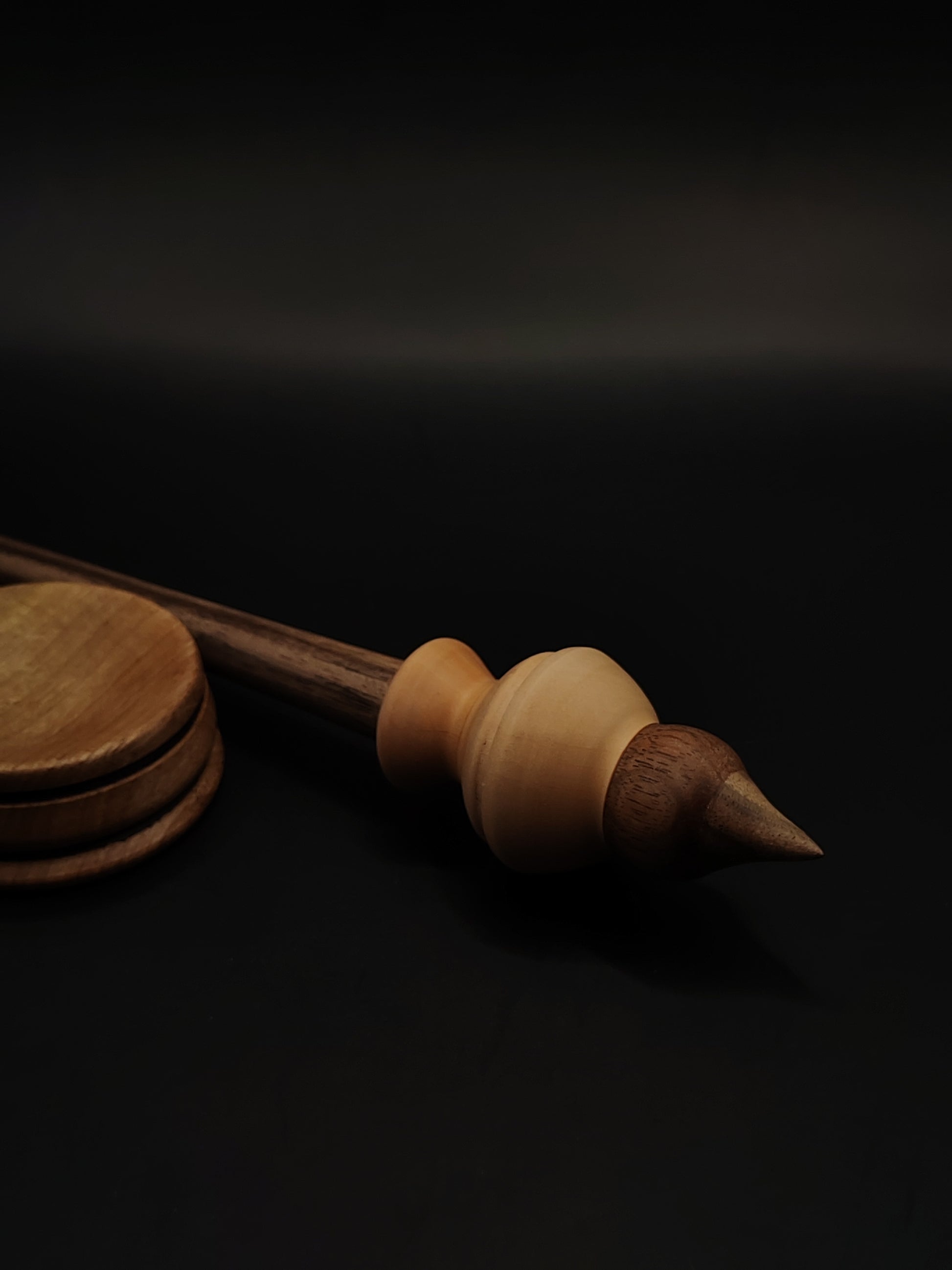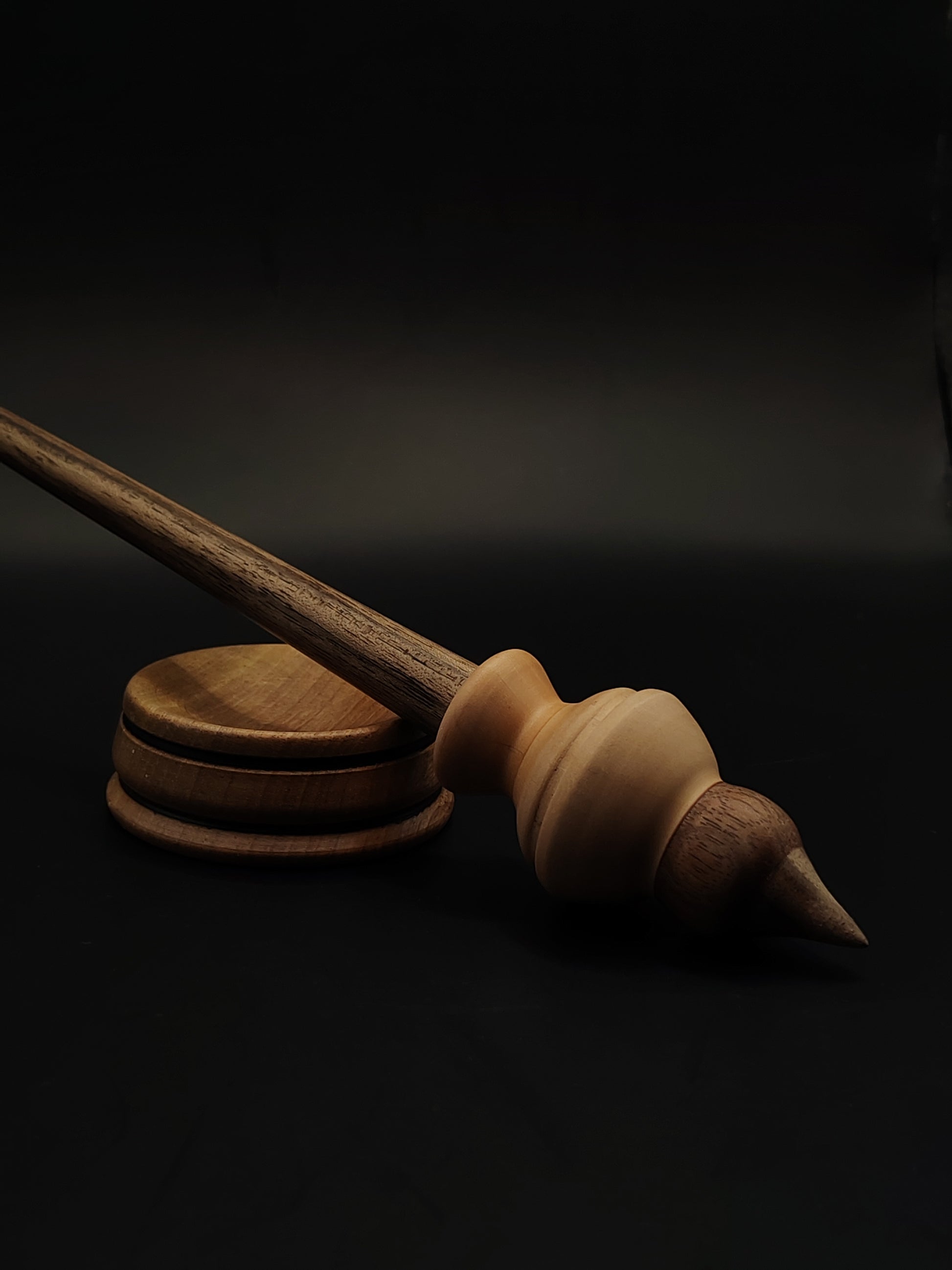 This elegant support spindle combines the strength of walnut wood with the warmth of apple wood for a unique spinning experience. Measuring 27 cm (10.6 in) in length and weighing 25 grams (0.88 oz), it offers a balanced feel ideal for drafting a wide variety of fibers.