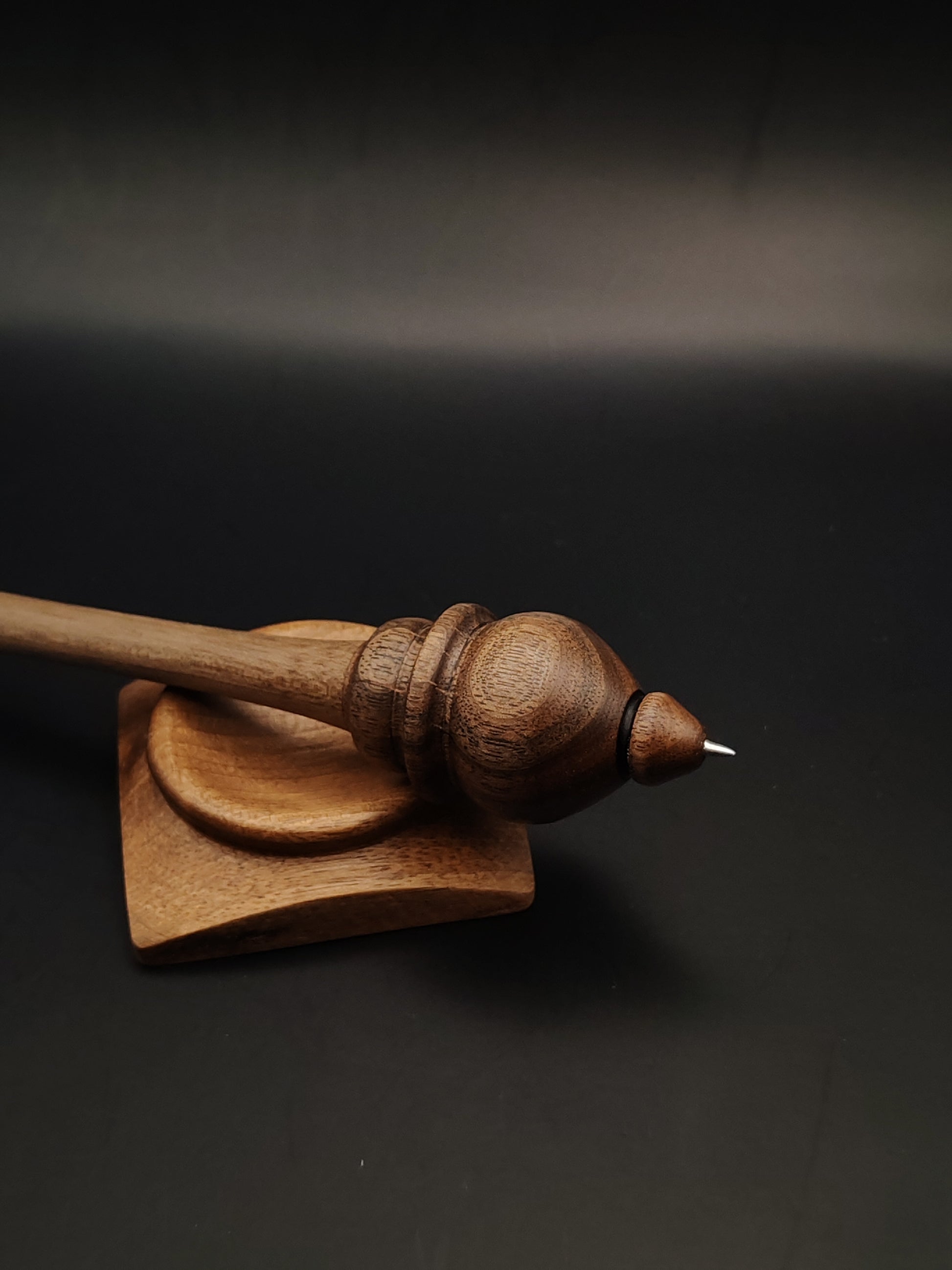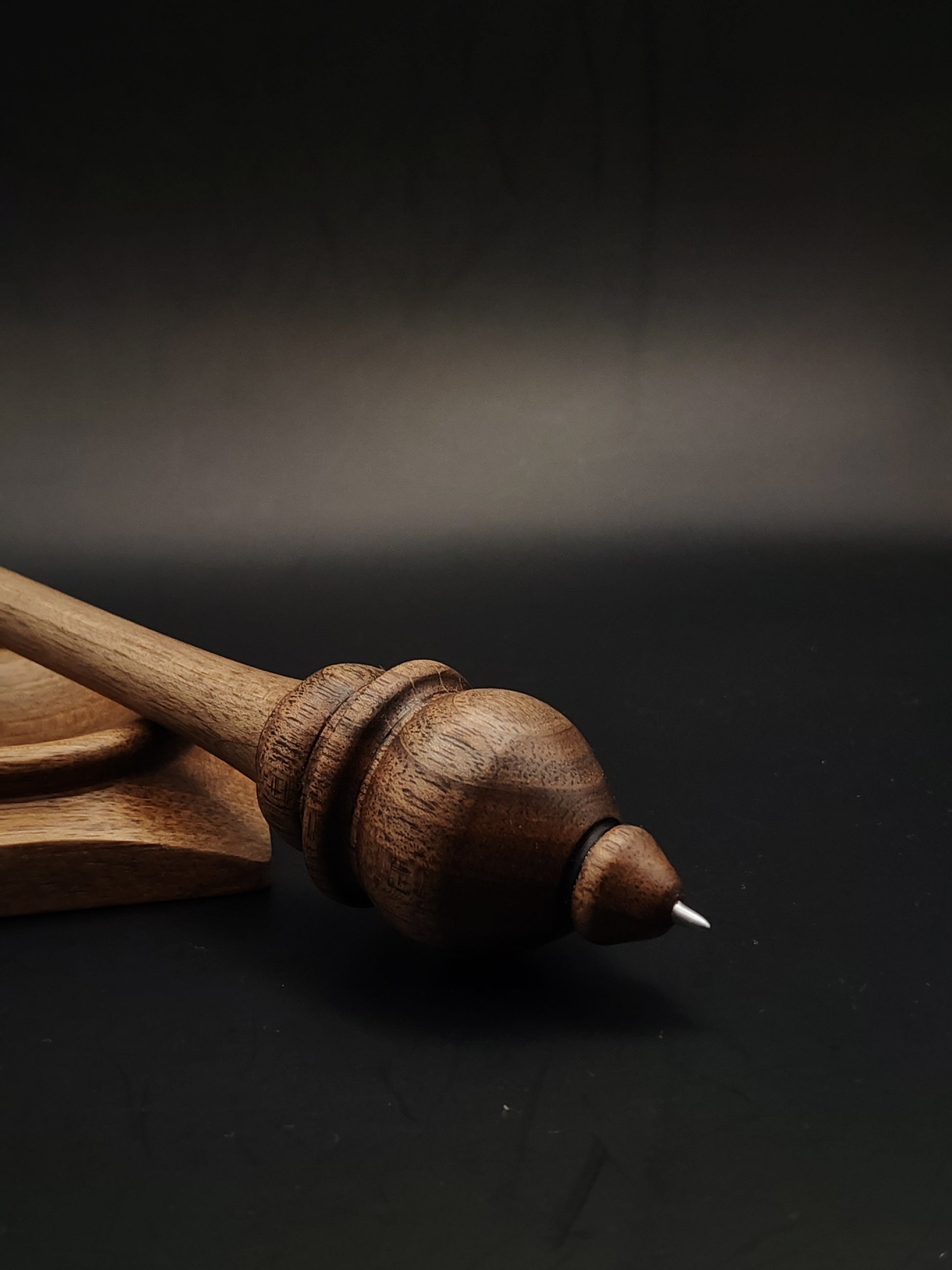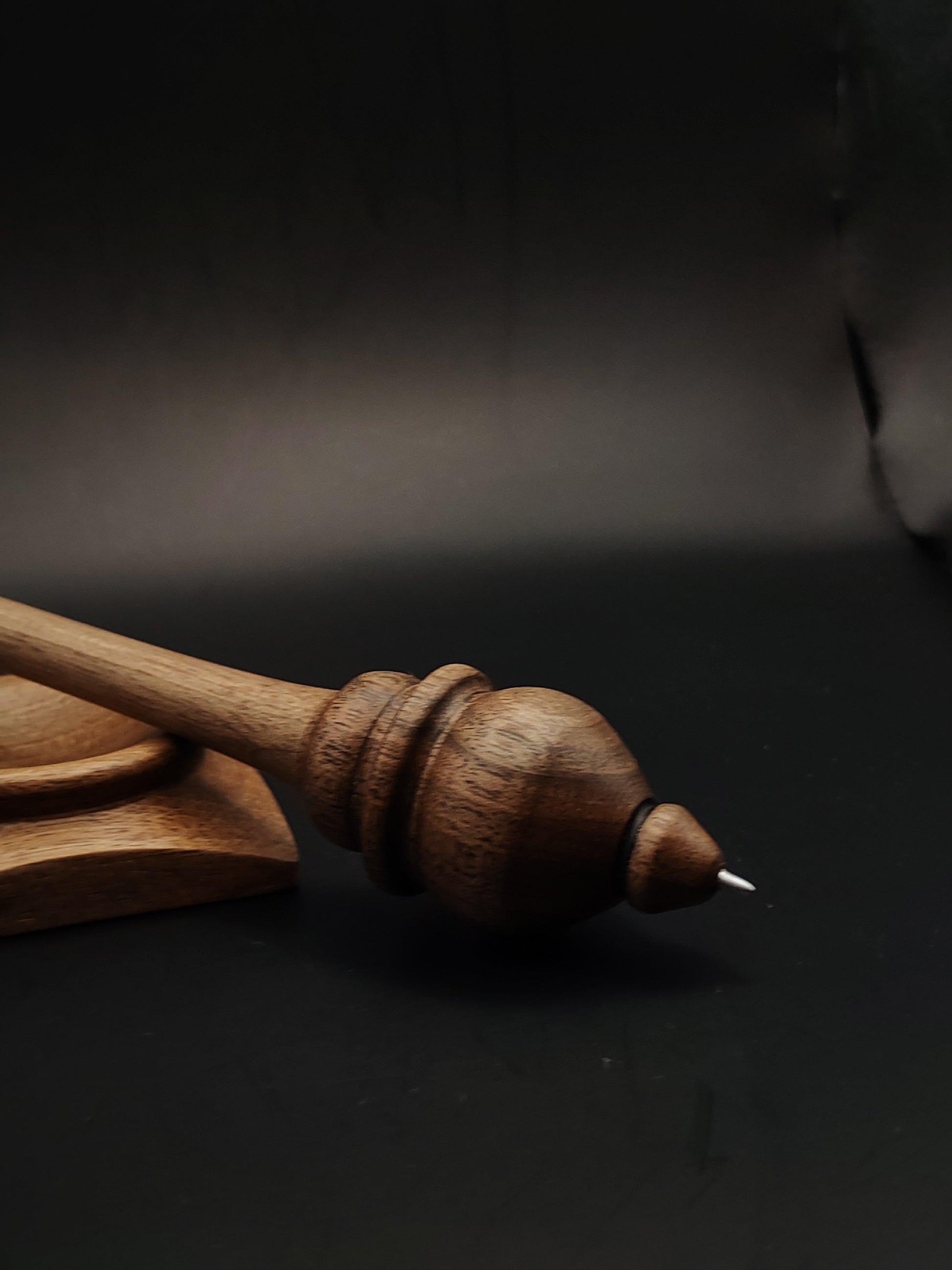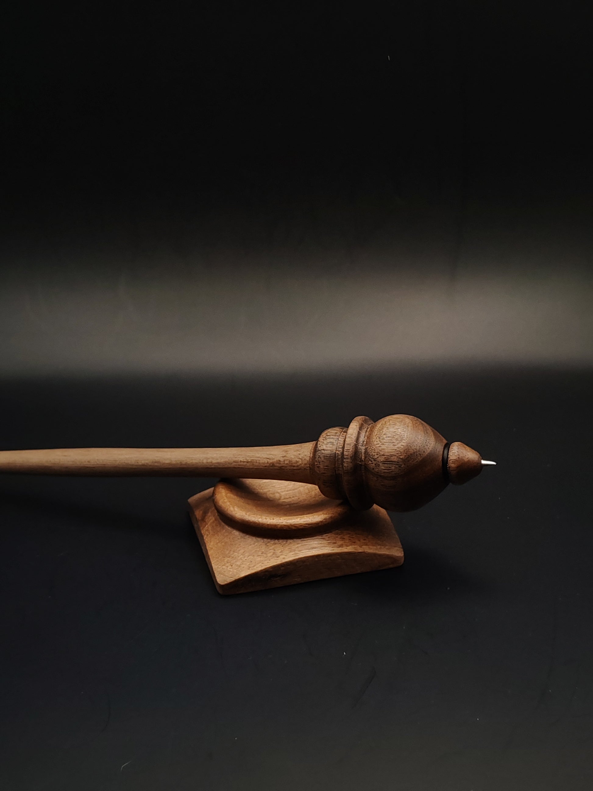 The set includes a walnut support bowl, shaped to provide a quiet, low-friction spinning surface. The seamless integration of natural materials with a precision metal tip makes this spindle a reliable and elegant addition to any fiber artist's toolkit.