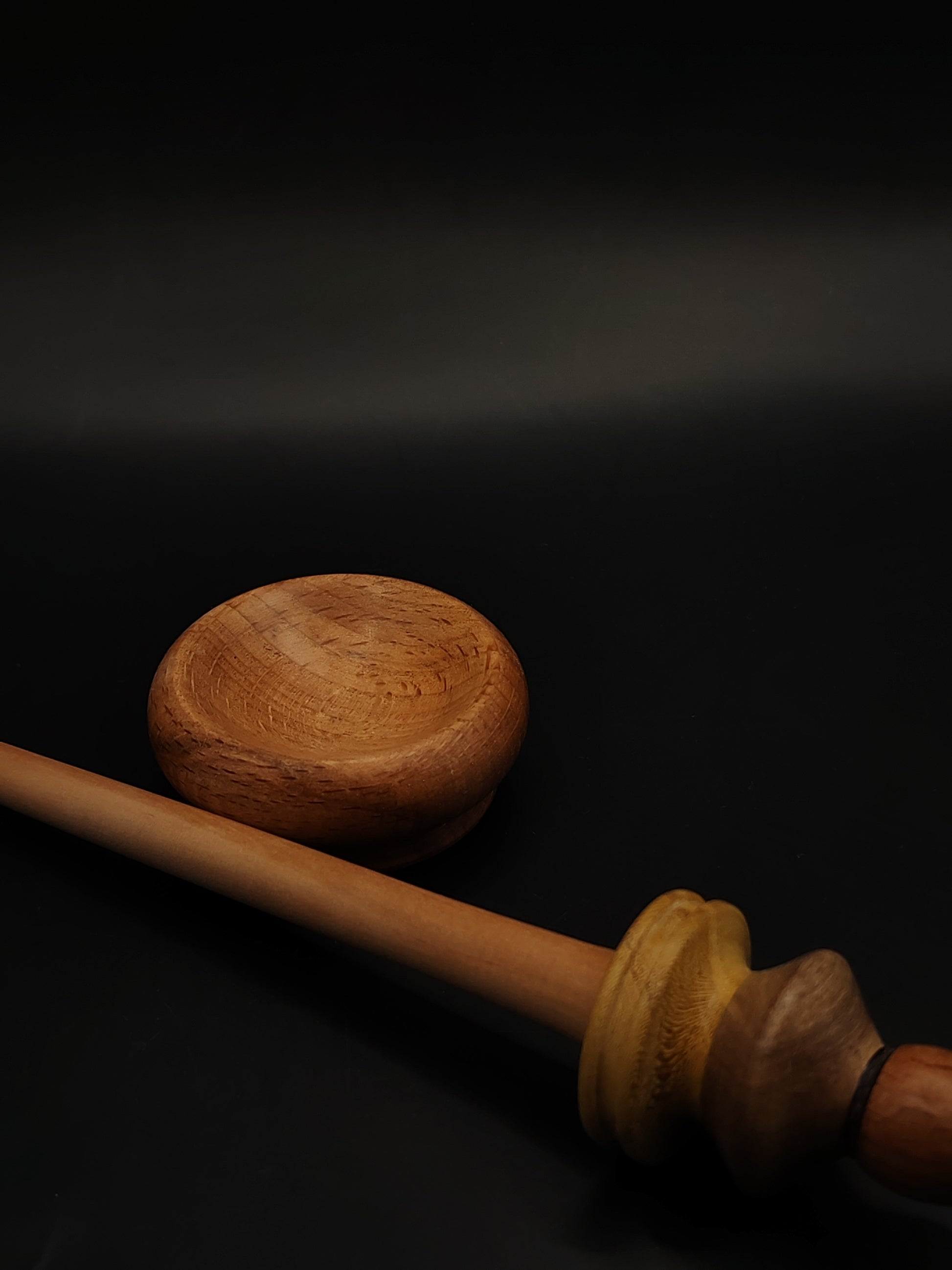 Bright, warm, and full of character — this artisan support spindle is crafted from a colorful trio of woods: beech, walnut, and mulberry, all brought together on a smooth apple wood shaft. The set is completed with a beautifully matched beech support bowl for clean, stable spinning.