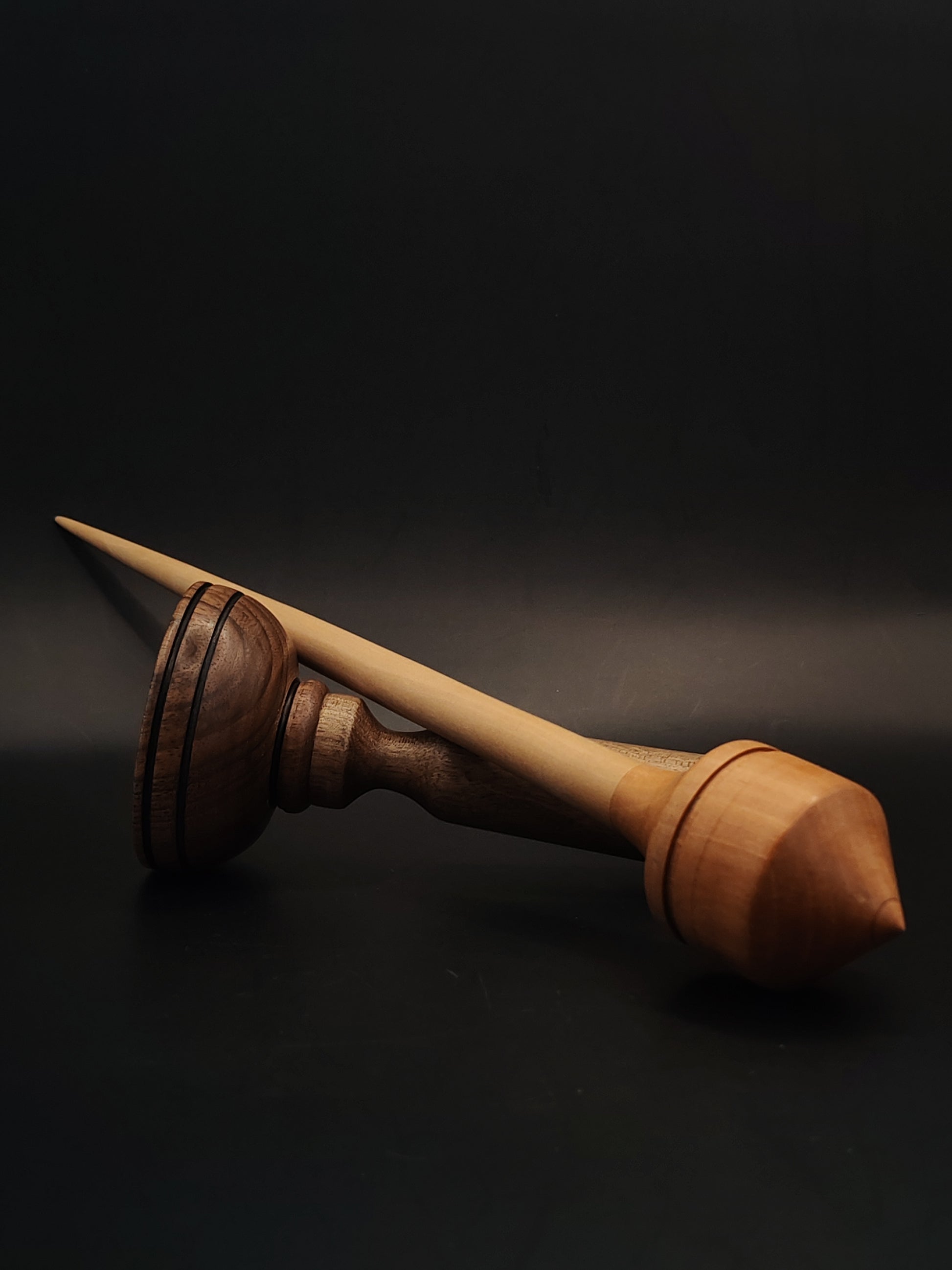 The lap support bowl offers a wide, stable base, allowing uninterrupted spinning with minimal effort. Walnut adds durability and weight to the bowl, while apple and pear combine warmth, smoothness, and balance in the spindle itself.