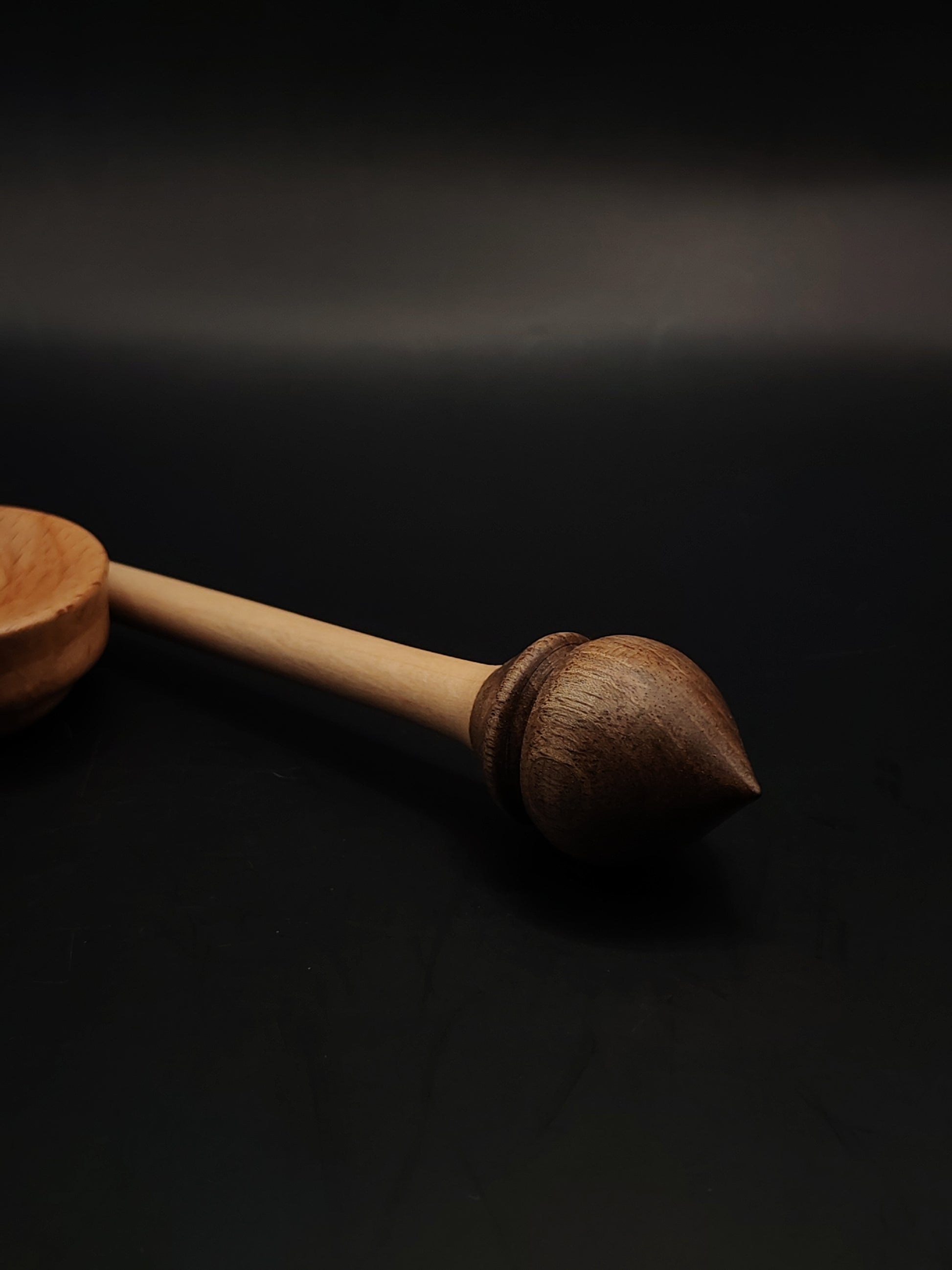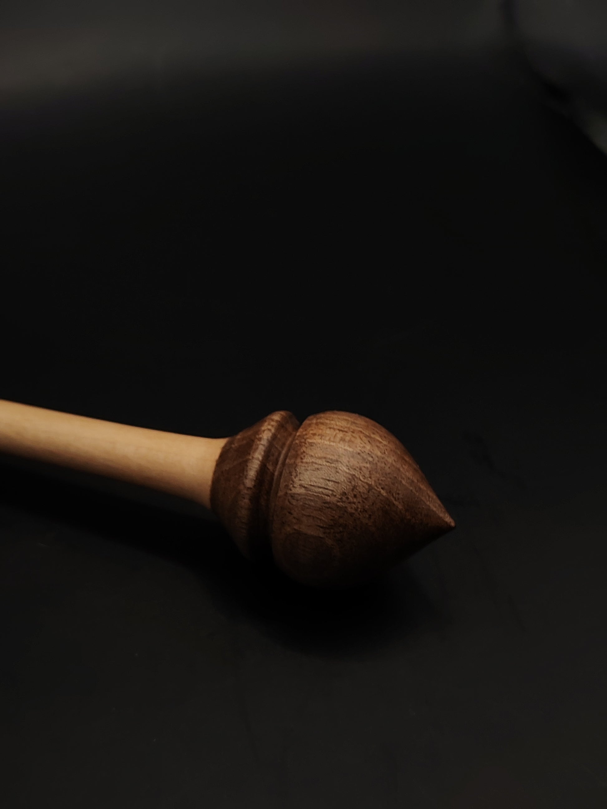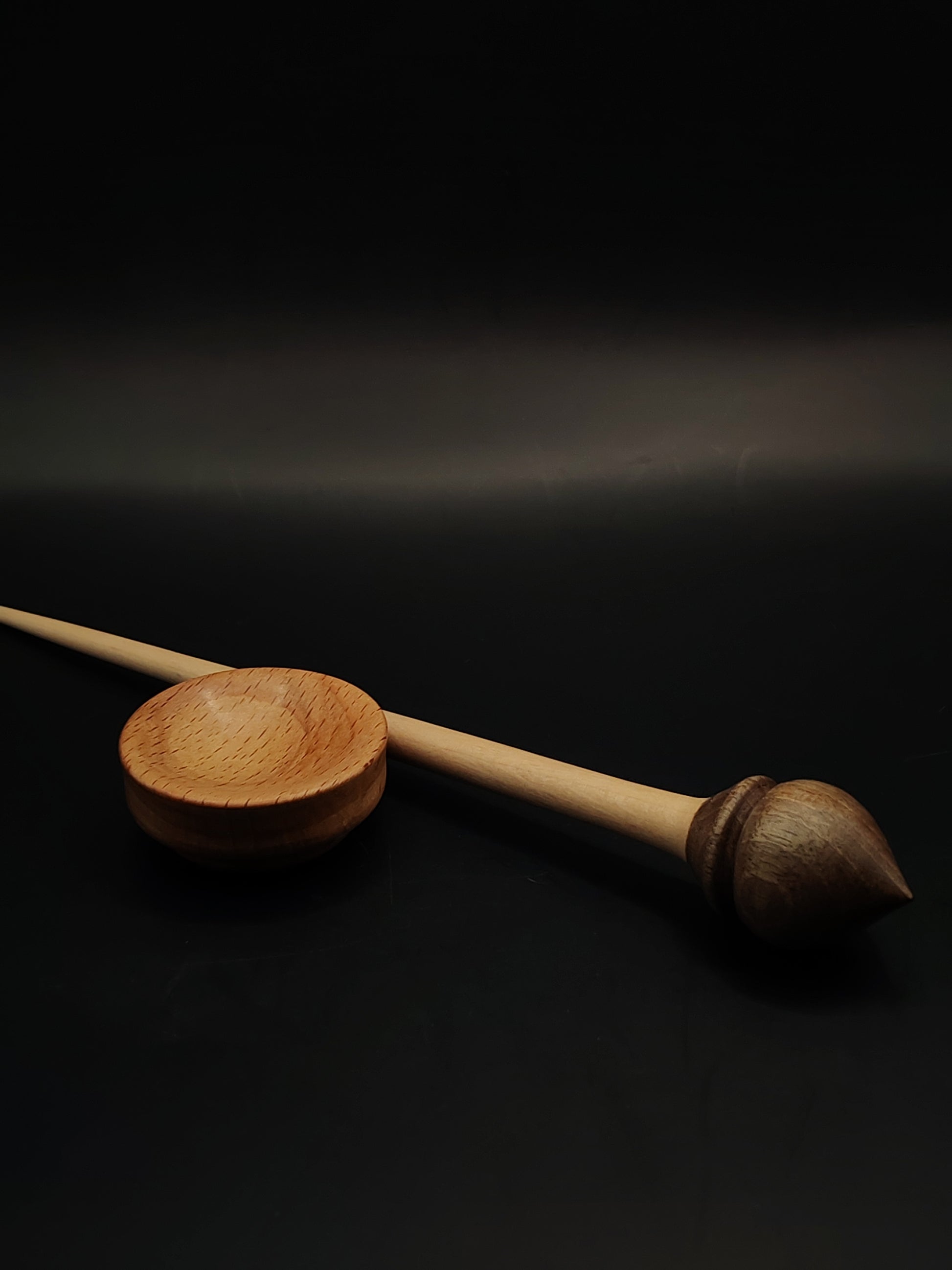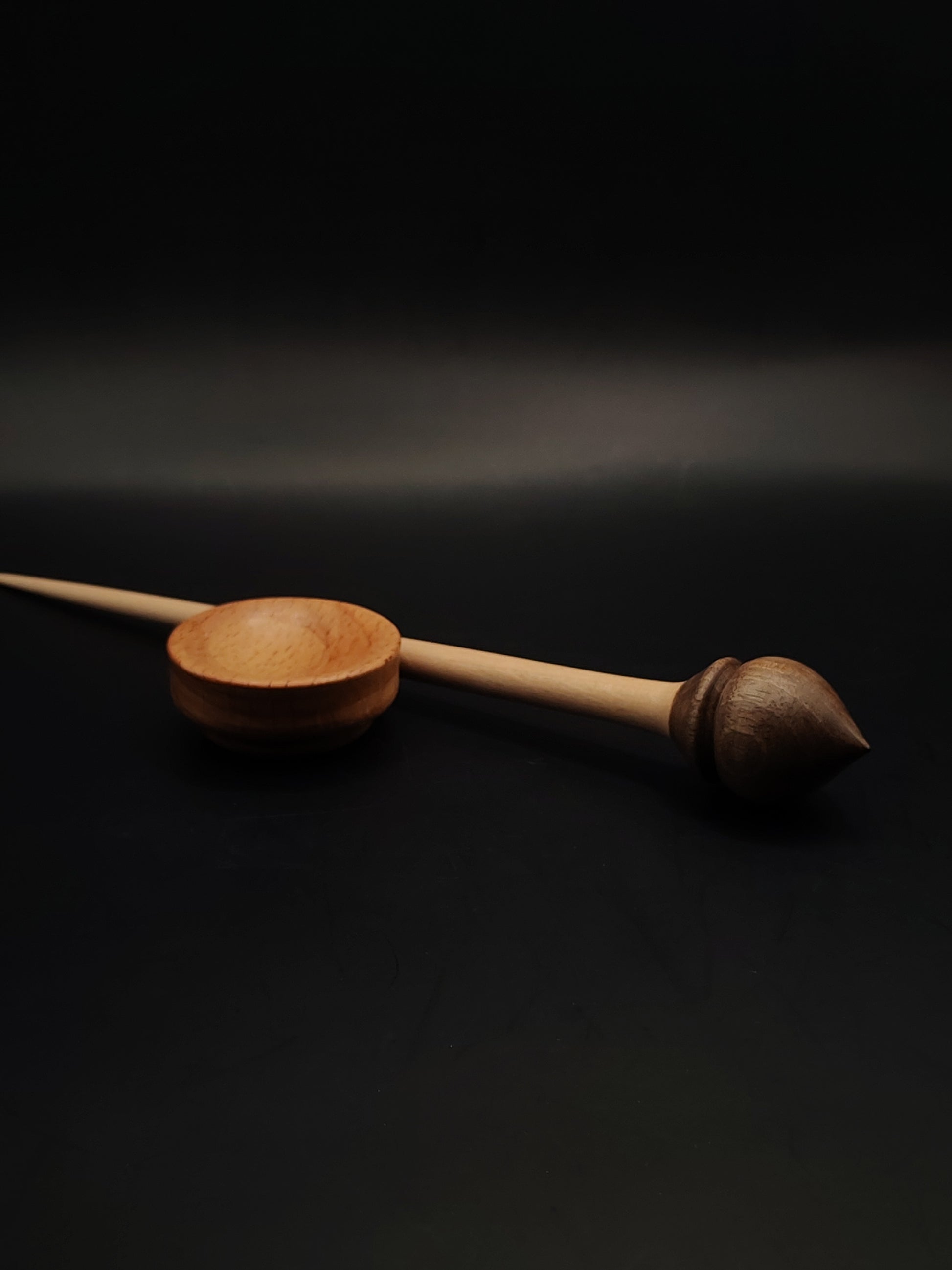 Apple wood brings lightness and a lively feel to the shaft, while walnut adds stability and balance at the whorl. The beech bowl offers a neutral, smooth spinning surface that complements the spindle without adding unnecessary weight.