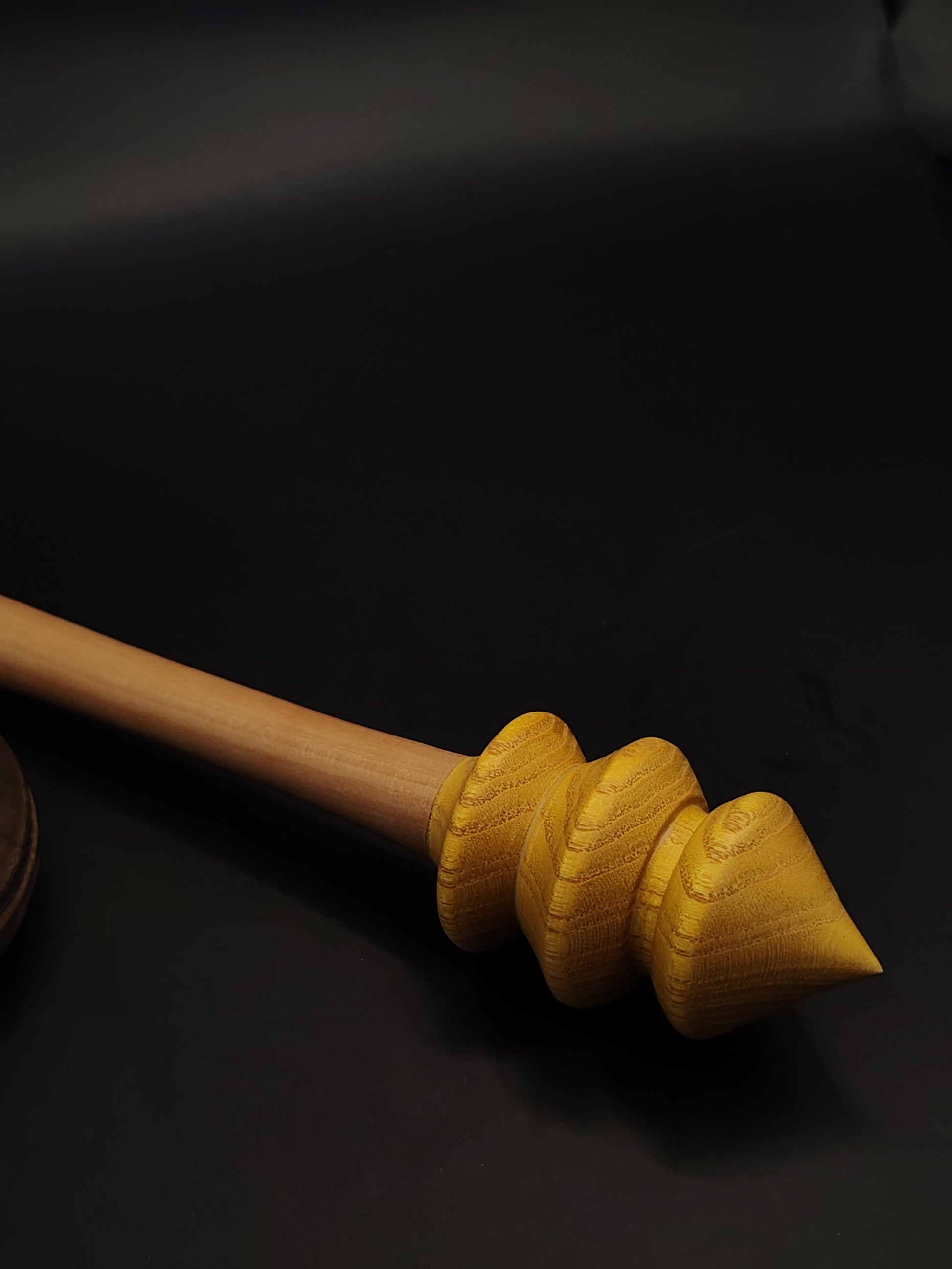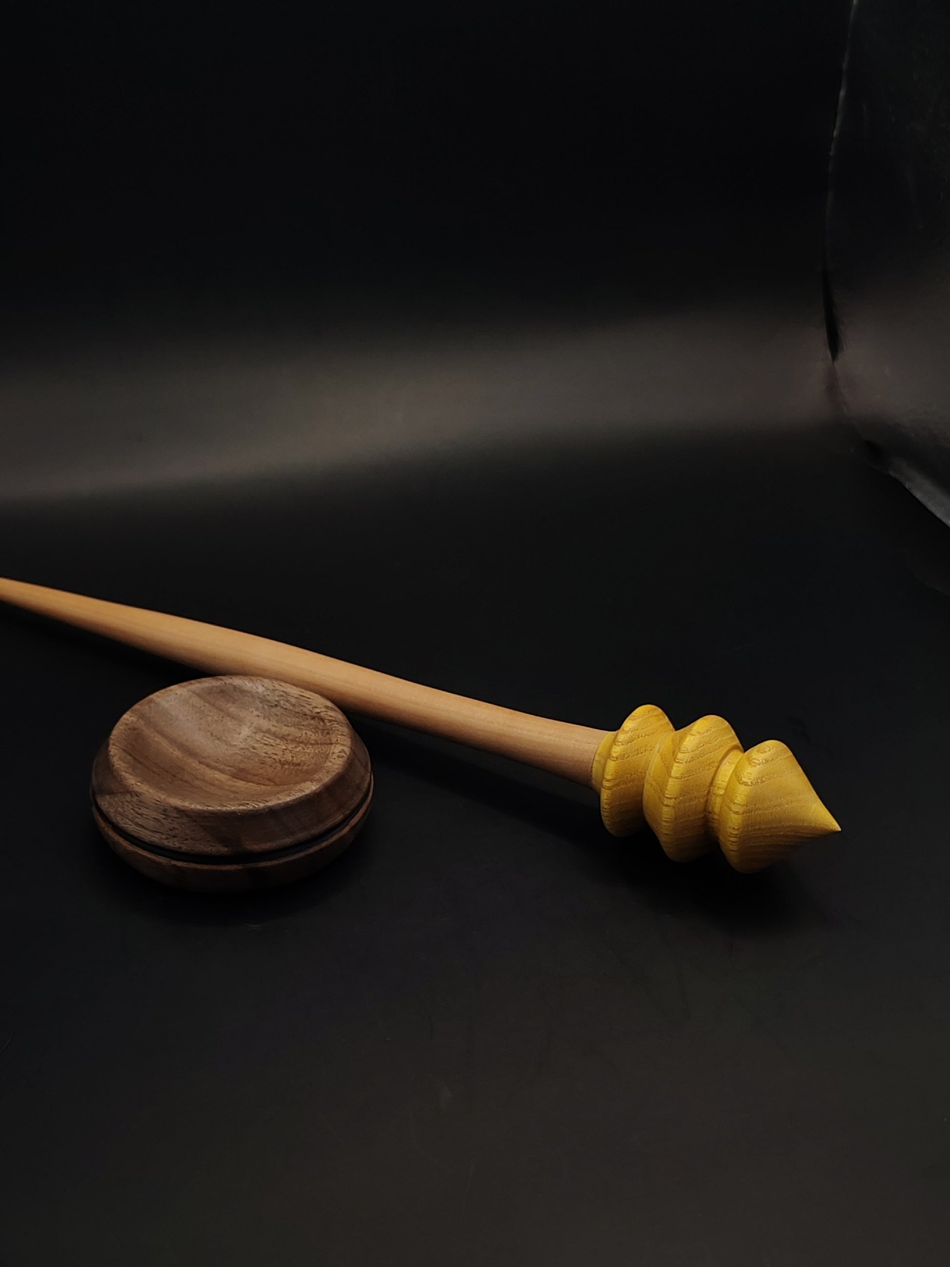 Warm, responsive, and beautifully balanced — this artisan support spindle set combines a golden mulberry wood whorl with a smooth pear wood shaft, finished with a handcrafted walnut support bowl for stable, consistent spinning.