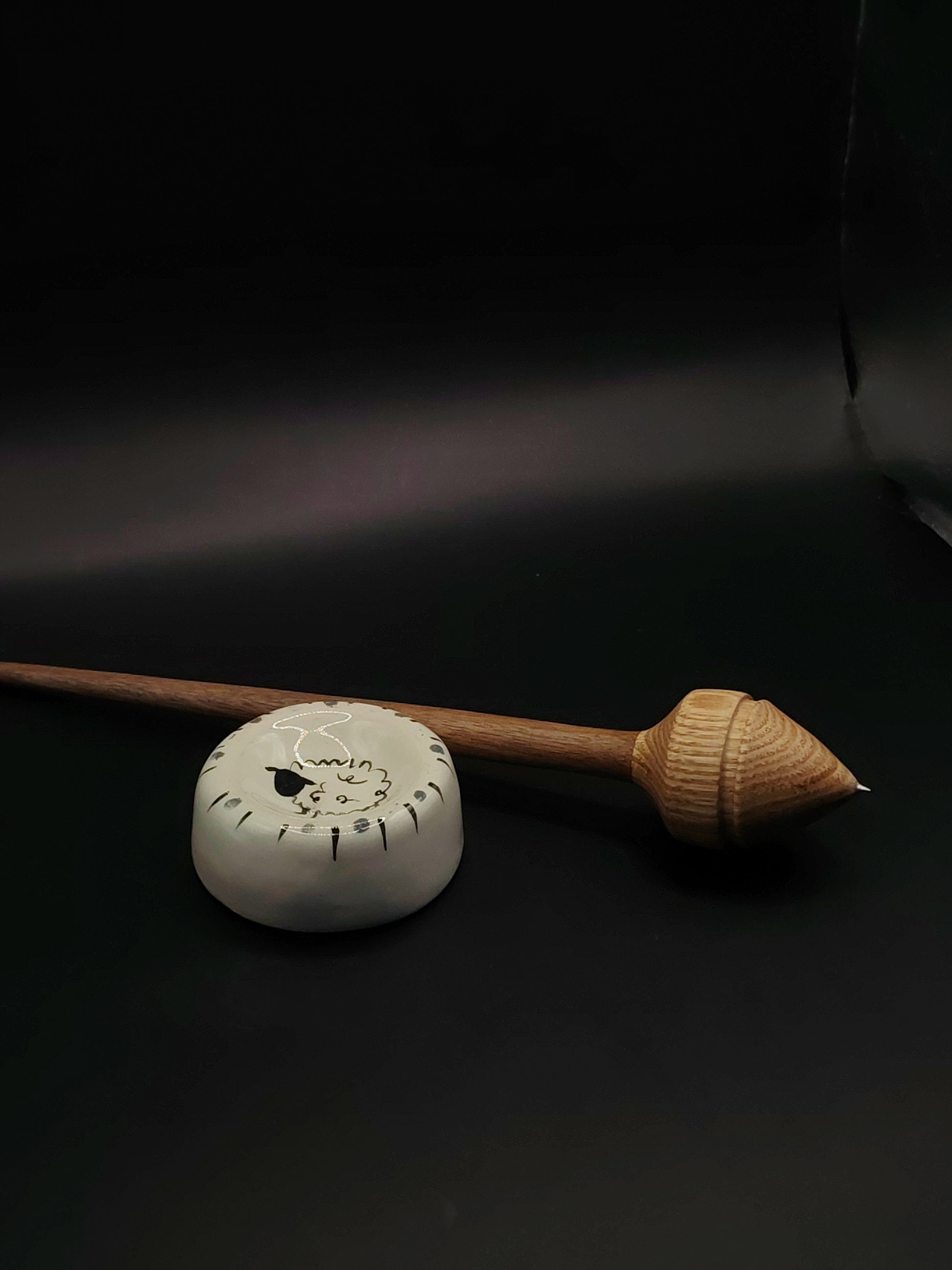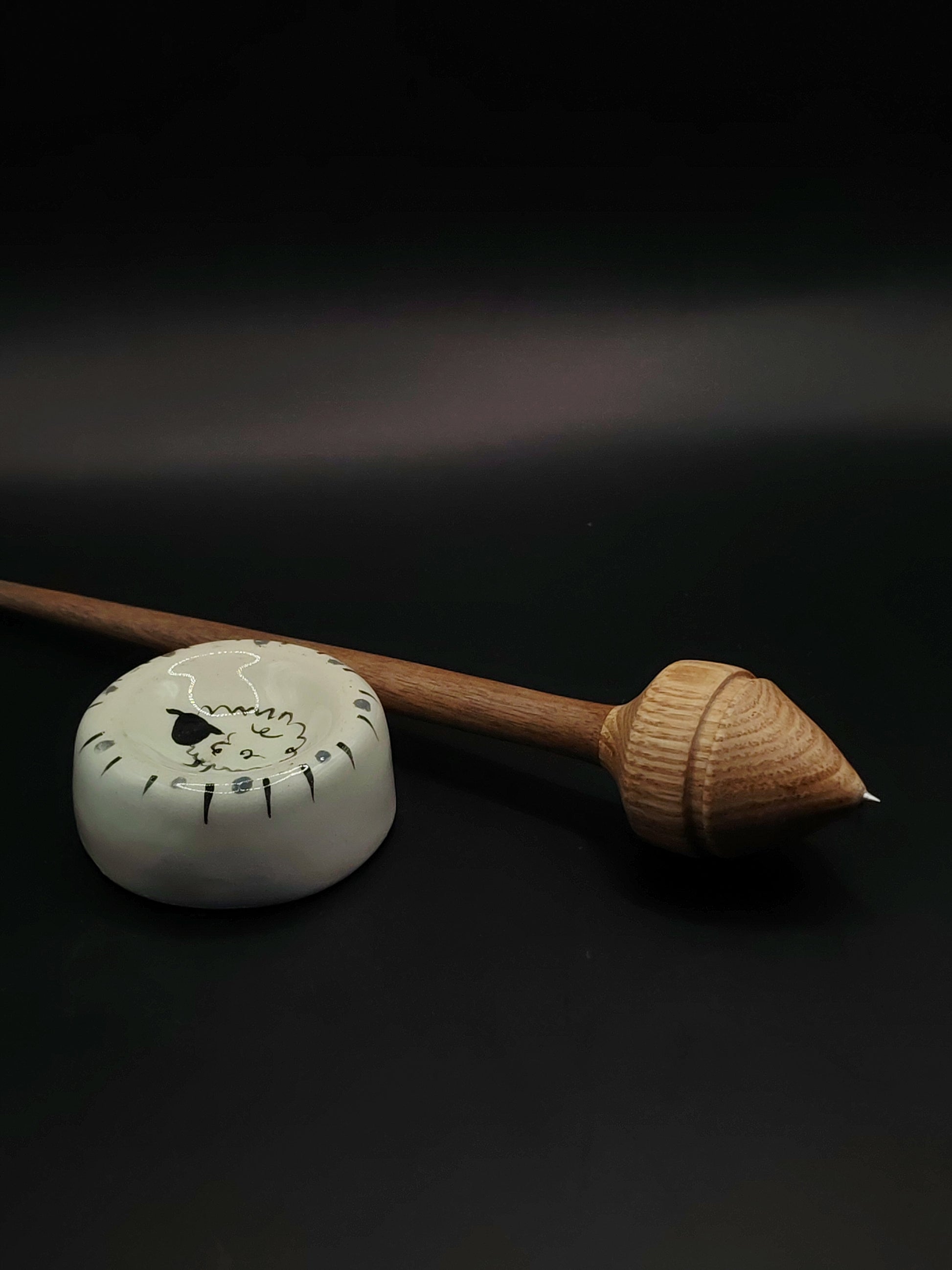 Support Spindle with Metal Tip – Oak Whorl & Walnut Shaft (25.5 cm / 22 g) + Ceramic Spinning Bowl | Handmade by Kravelli