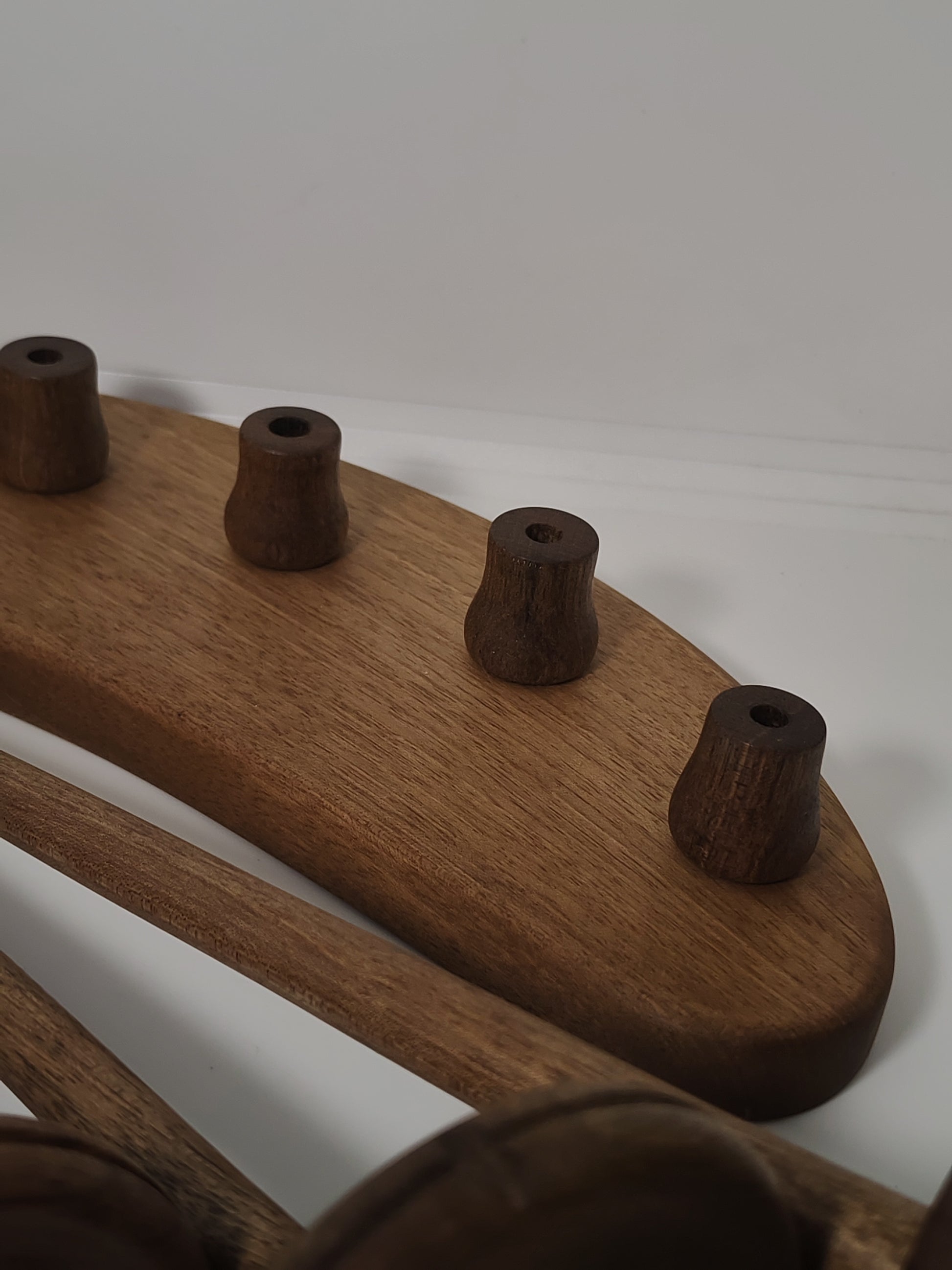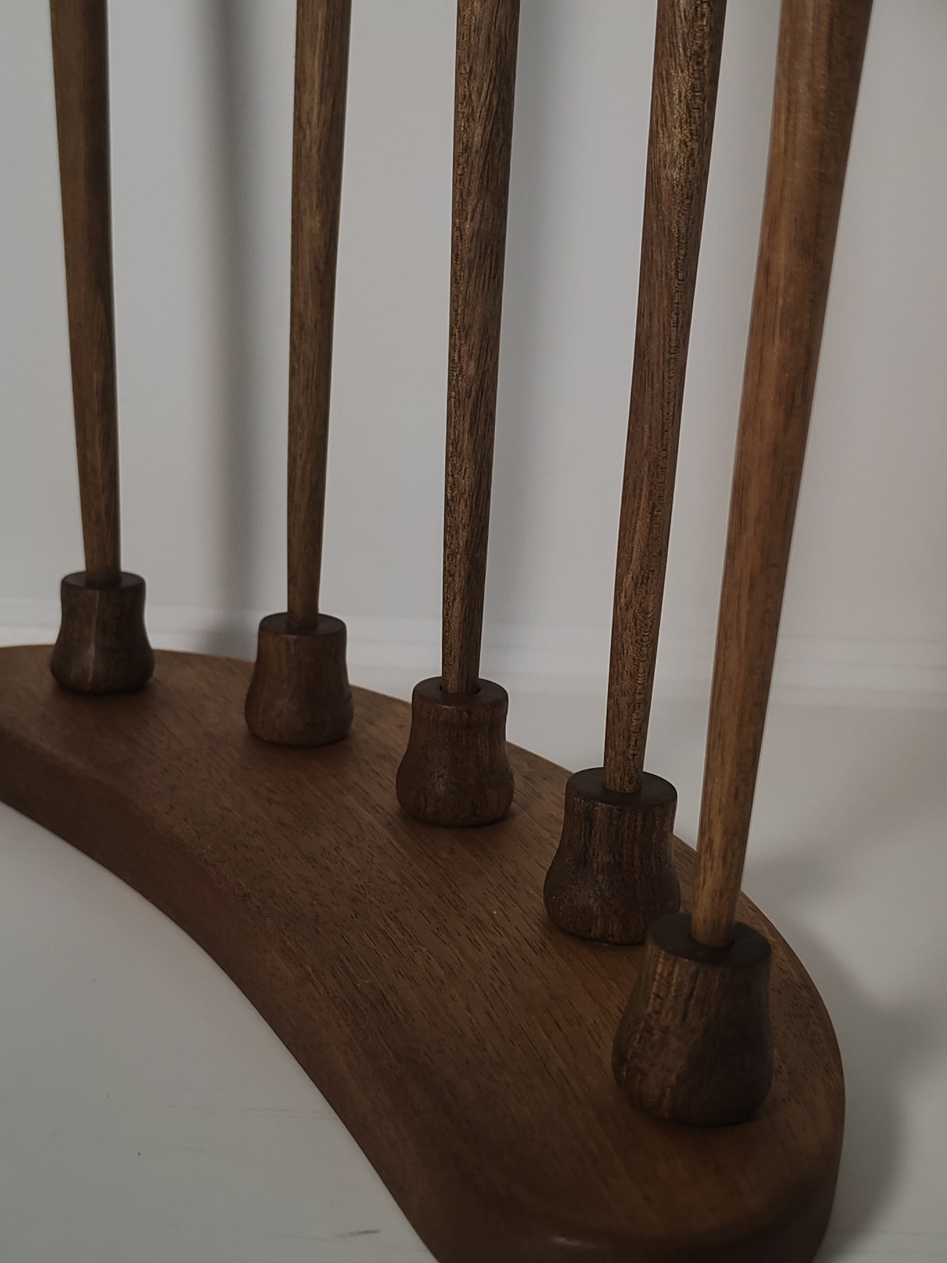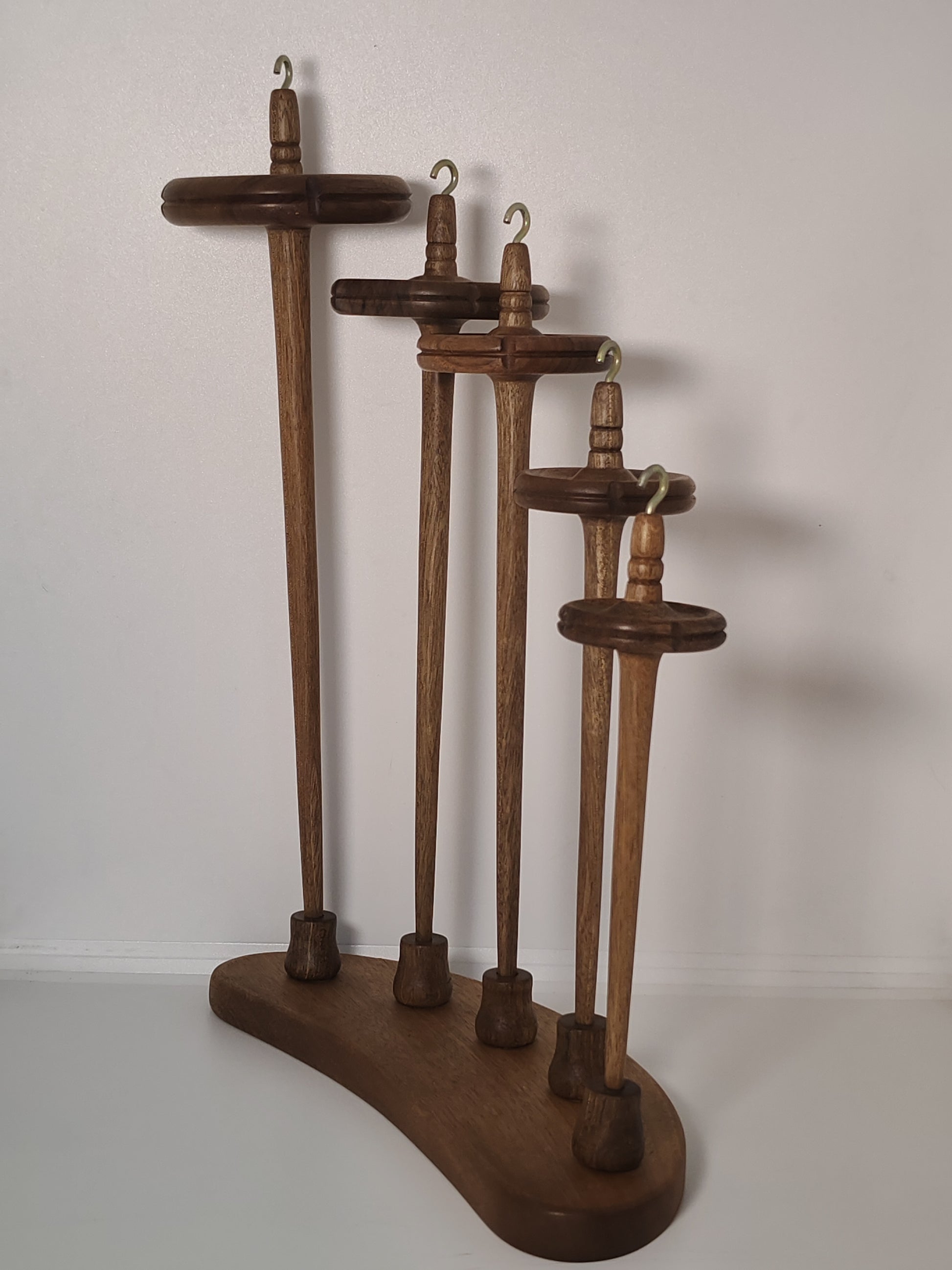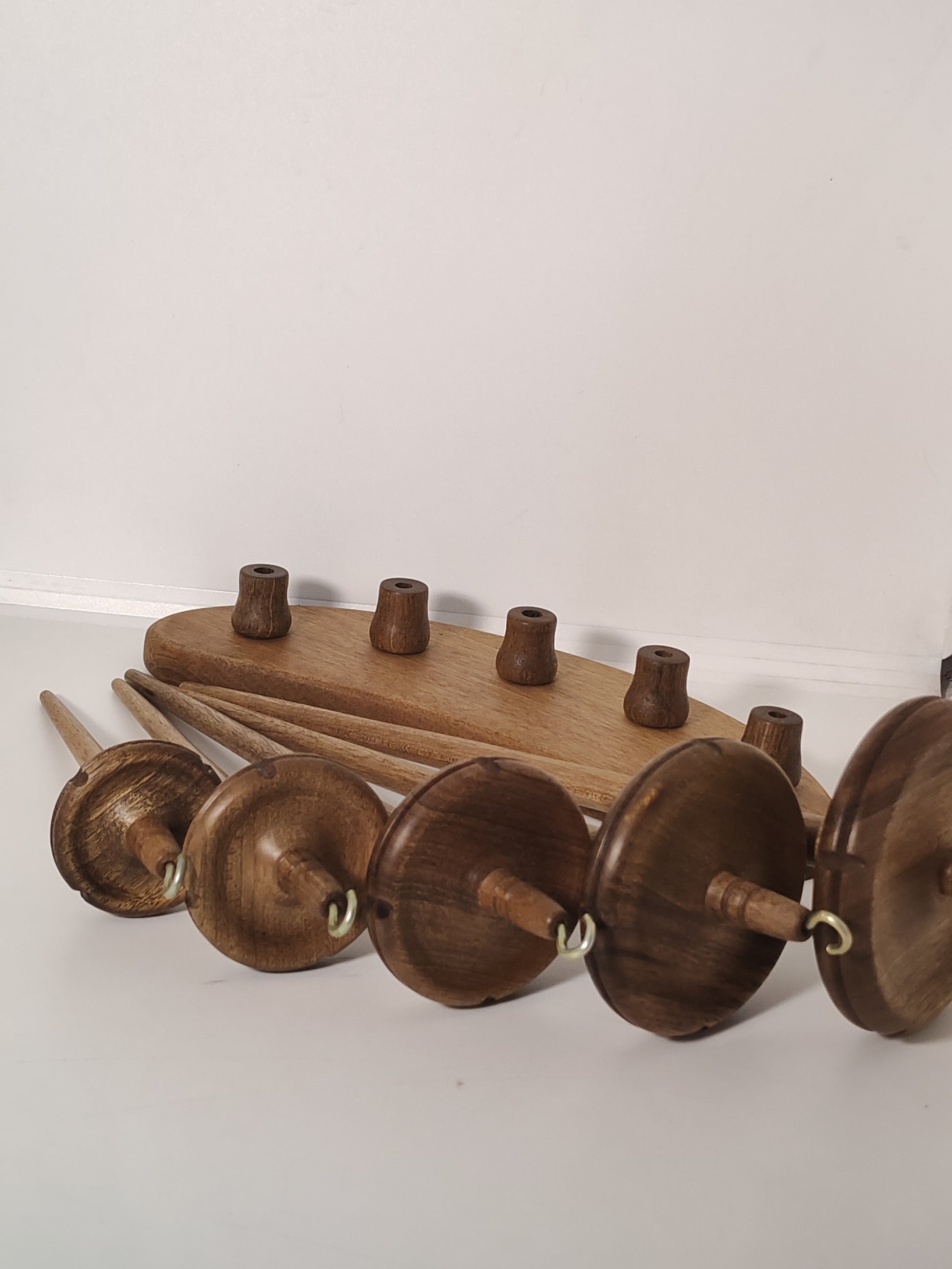 A handcrafted walnut stand completes the set, providing a clean and compact way to store and display your spindles when not in use.