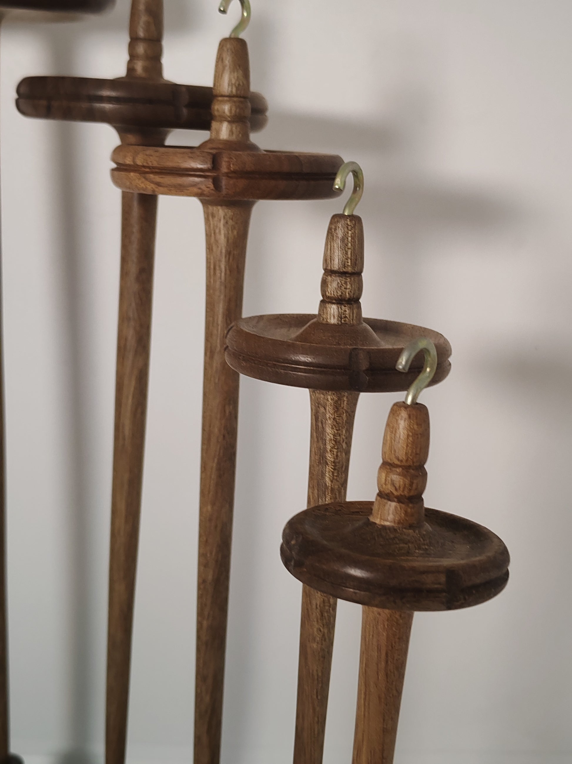 Designed for versatility and beauty, this 5-piece drop spindle collection is crafted from solid walnut wood and finished with organic wax for a smooth, effortless spin. The set includes spindles in five different weights and lengths, allowing you to move from fine singles to heavy plying — all with the same tactile joy and balance.