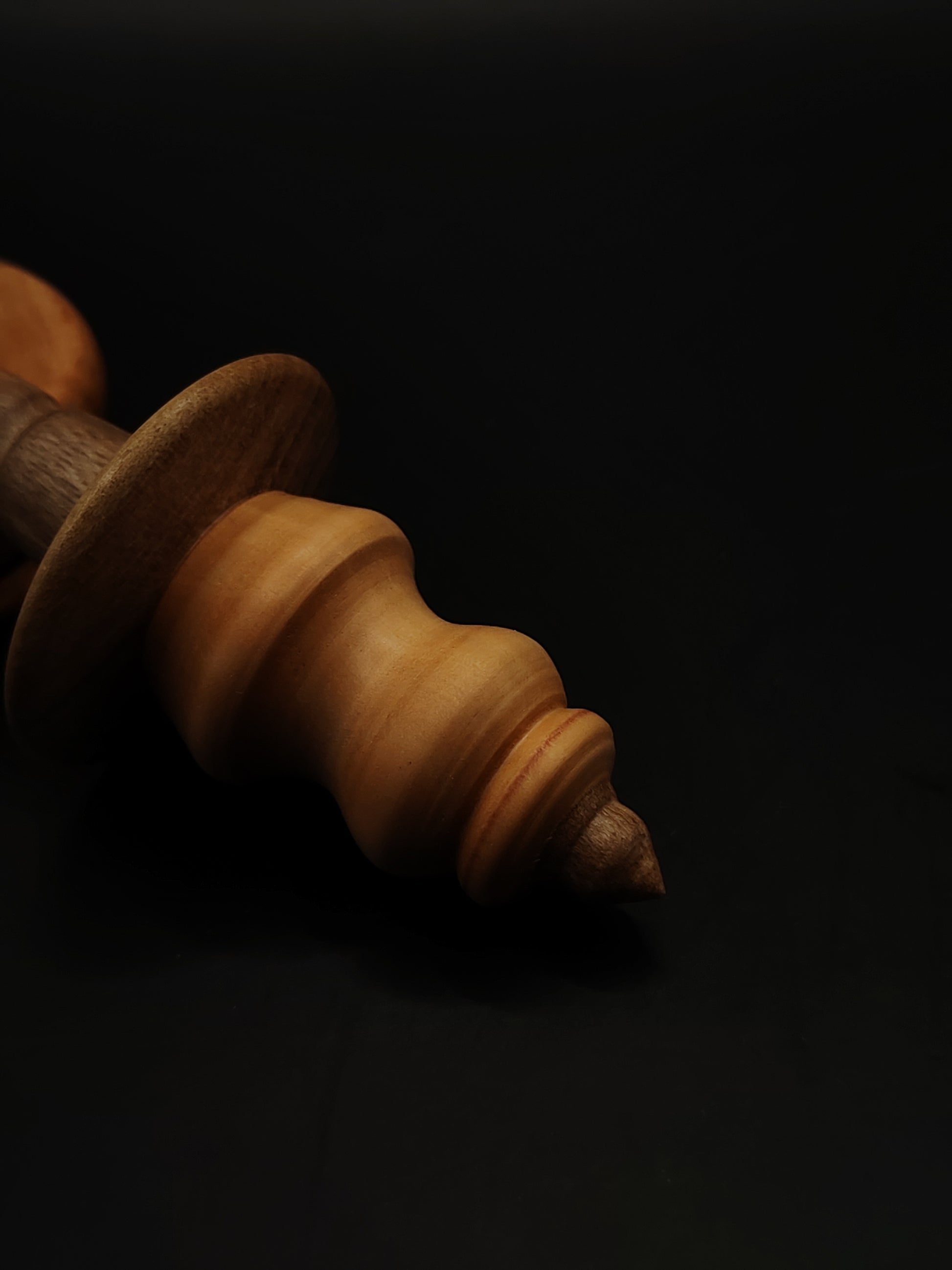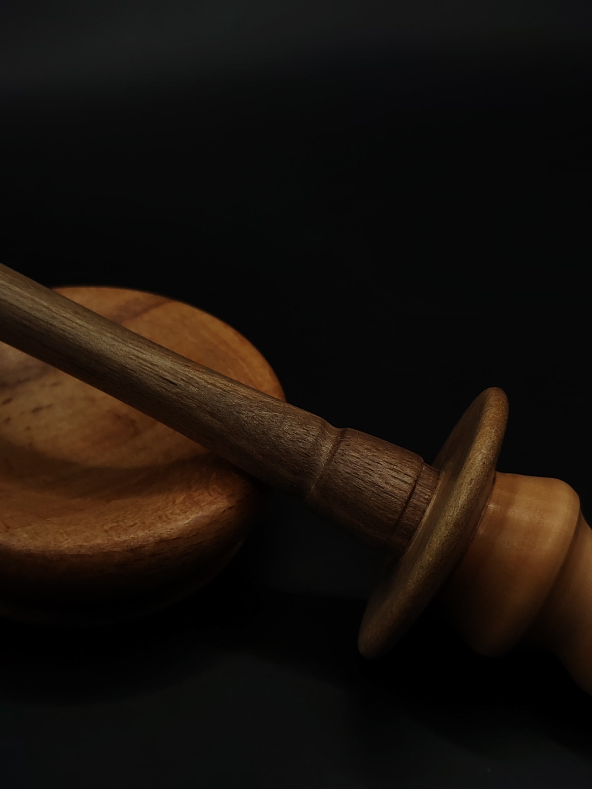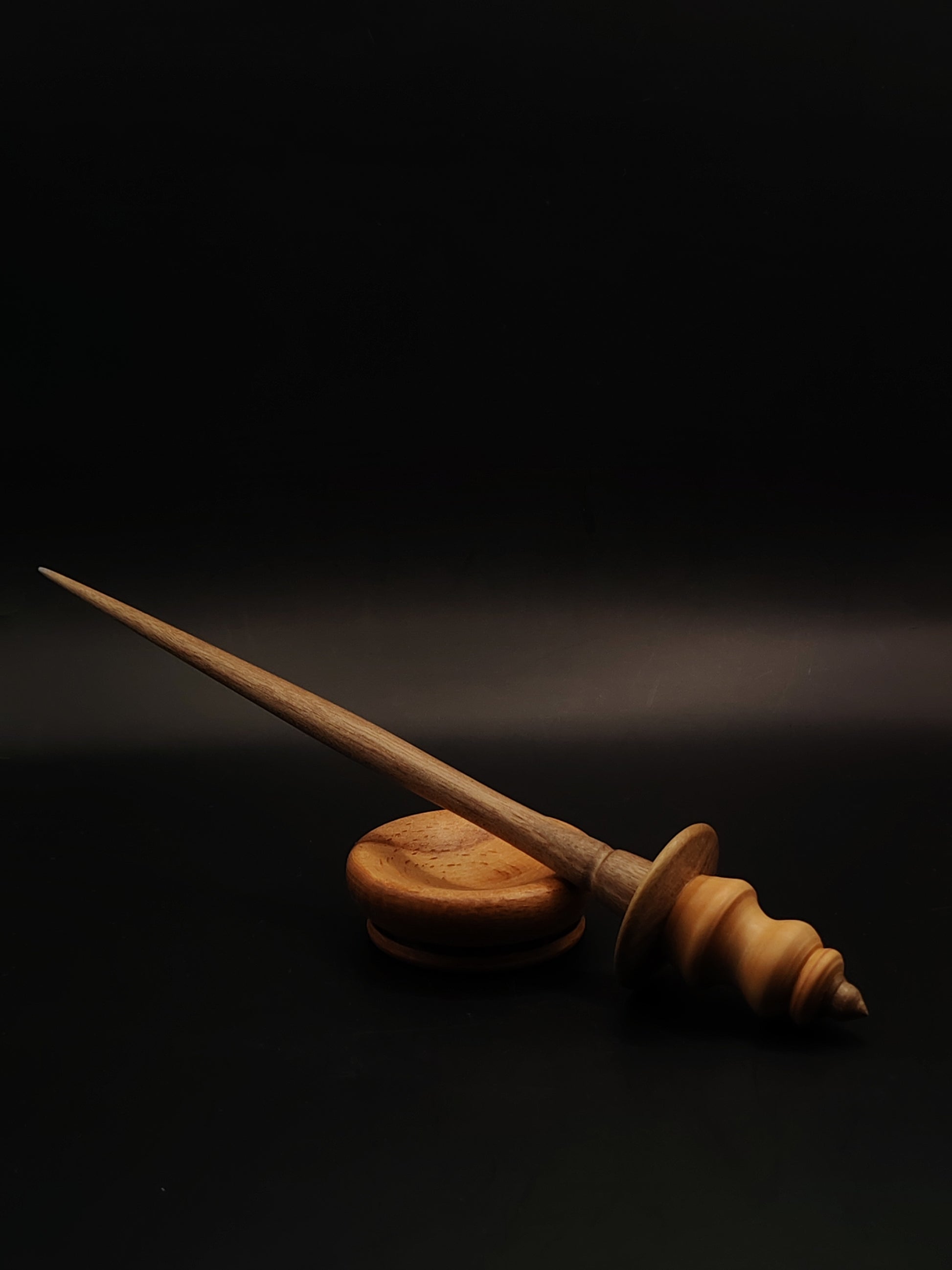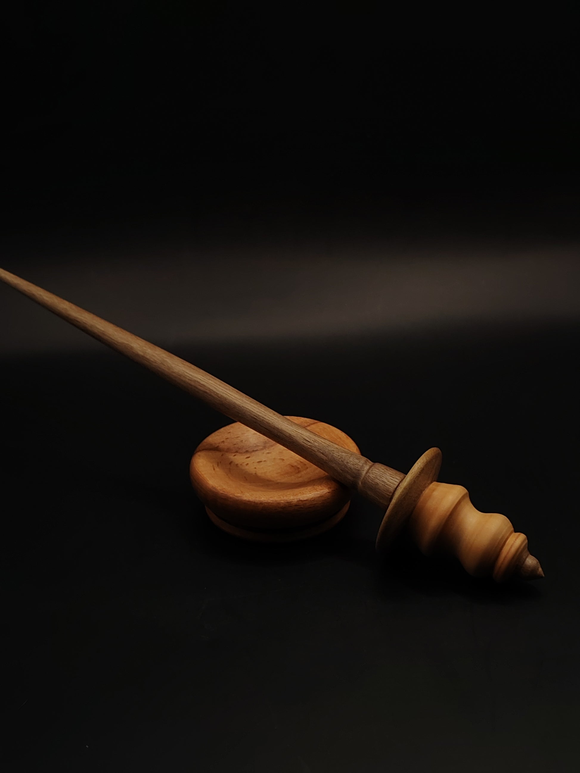 This artisan support spindle blends the warmth of pear wood with the depth of walnut, creating a tool that is not only beautiful to hold but wonderfully balanced in motion. The spindle is paired with a handcrafted beech support bowl, offering a light, stable base for smooth tip spinning.