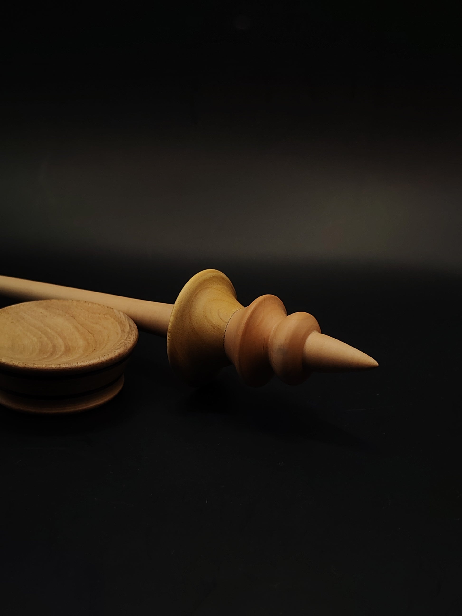 It comes in a set with an oak support bowl that adds both elegance and stability. Finished with organic wax, this spindle is as much a joy to use as it is to display—an exceptional tool for spinners who appreciate rare wood combinations and true craftsmanship.