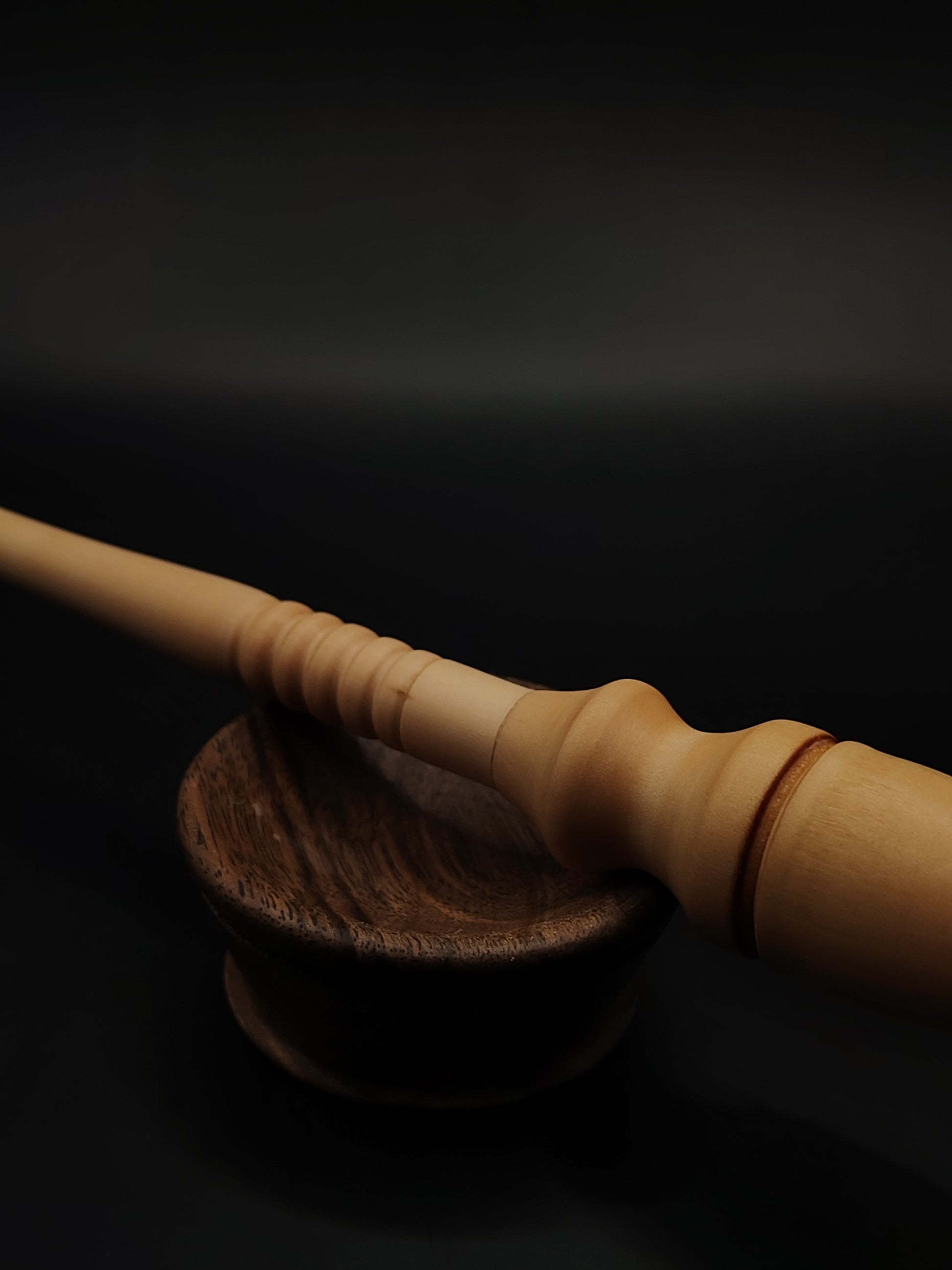 This artisan support spindle is hand-turned from warm-toned pear wood, offering a beautifully smooth and balanced spinning experience. Weighing 21 grams (0.74 oz) and measuring 26.5 cm (10.4 in), it’s ideal for spinners seeking a mid-weight tool with great control and flow.