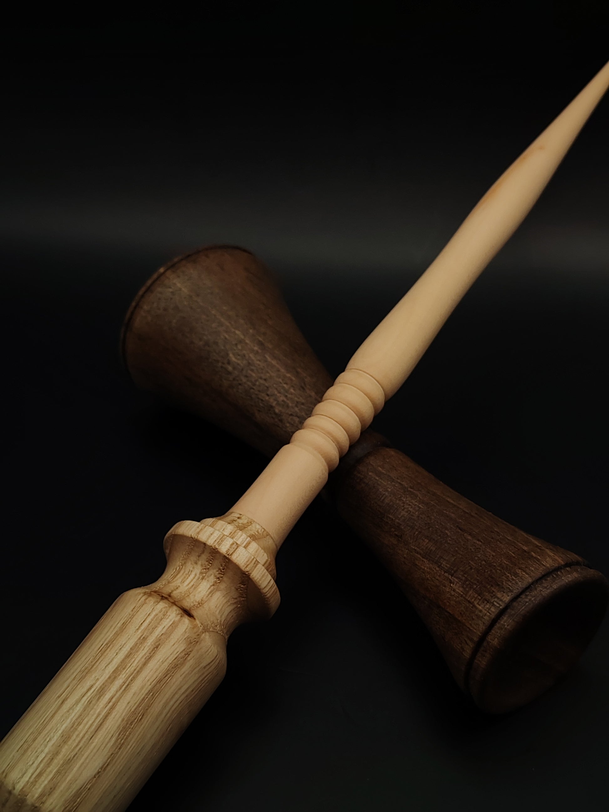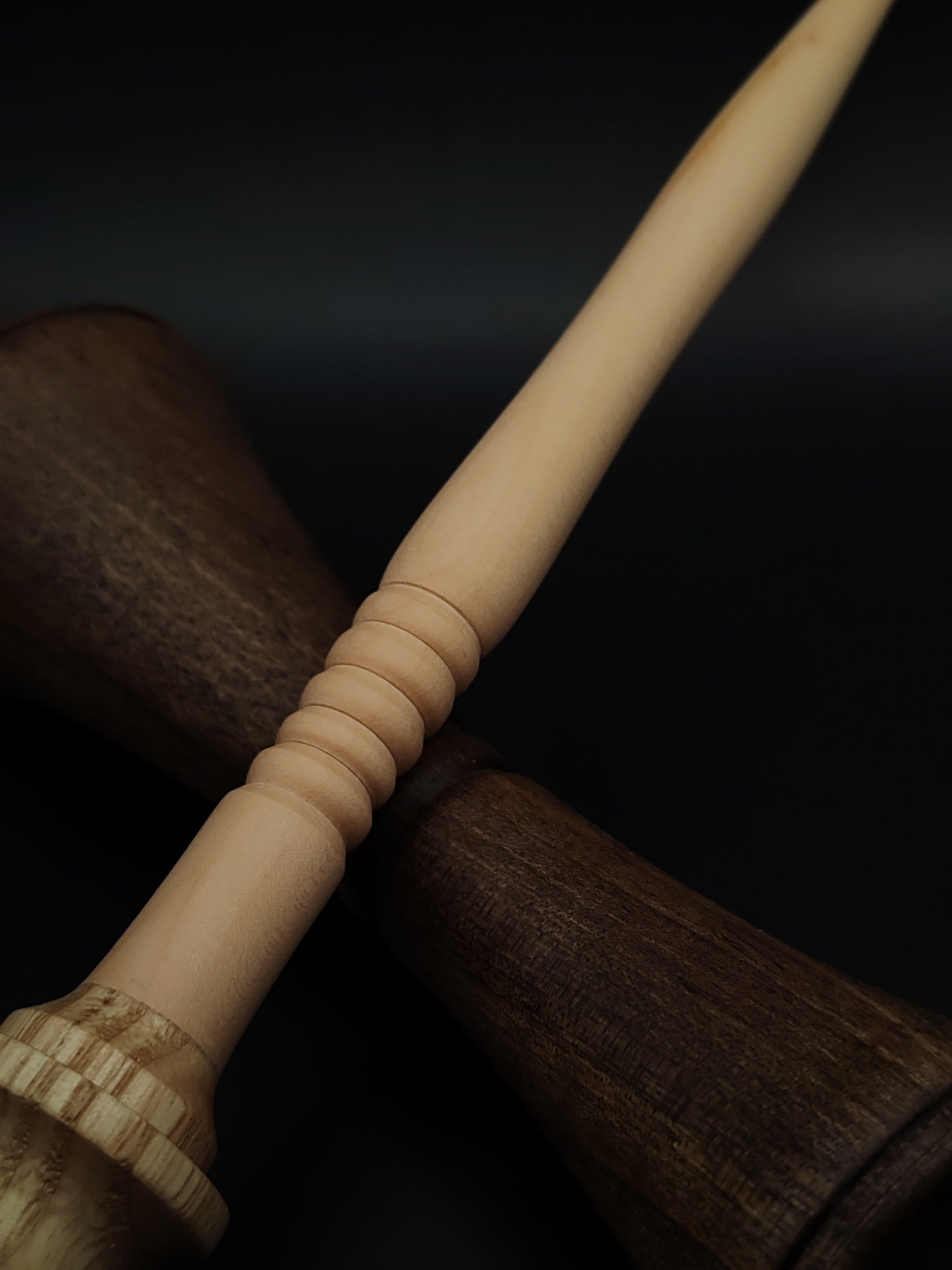 The included walnut lap support bowl provides a stable, polished base that enhances the spinning experience. The combination of contrasting woods gives this set both visual charm and tactile pleasure. Finished with natural wax, this spindle is ready to help you create beautiful yarn with rhythm and ease.