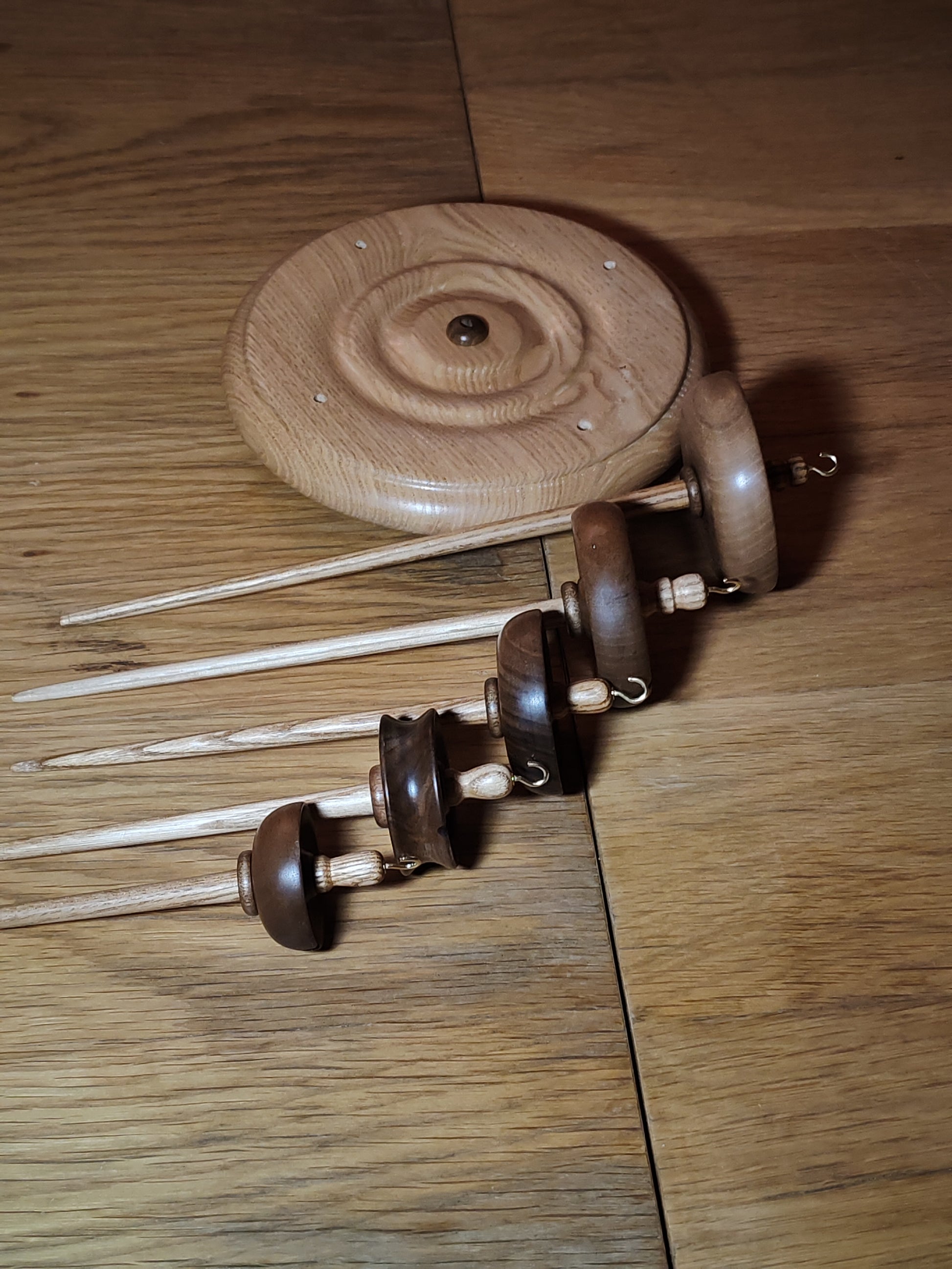 The set includes five spindles in a full range of sizes and weights, making it ideal for both beginners and experienced fiber artists. A 21 cm (8.26 in) diameter chestnut wood stand keeps your tools organized and beautifully displayed.