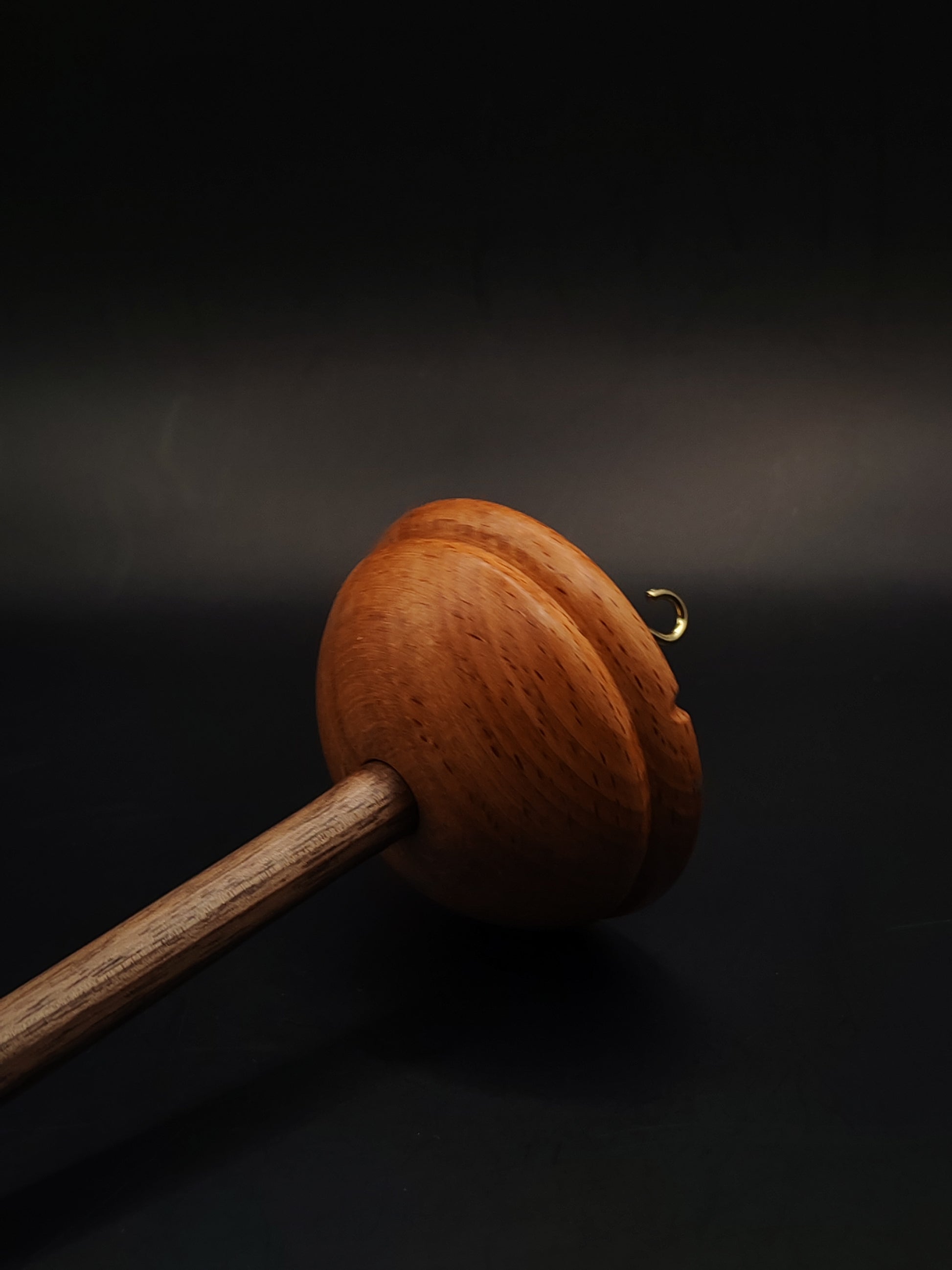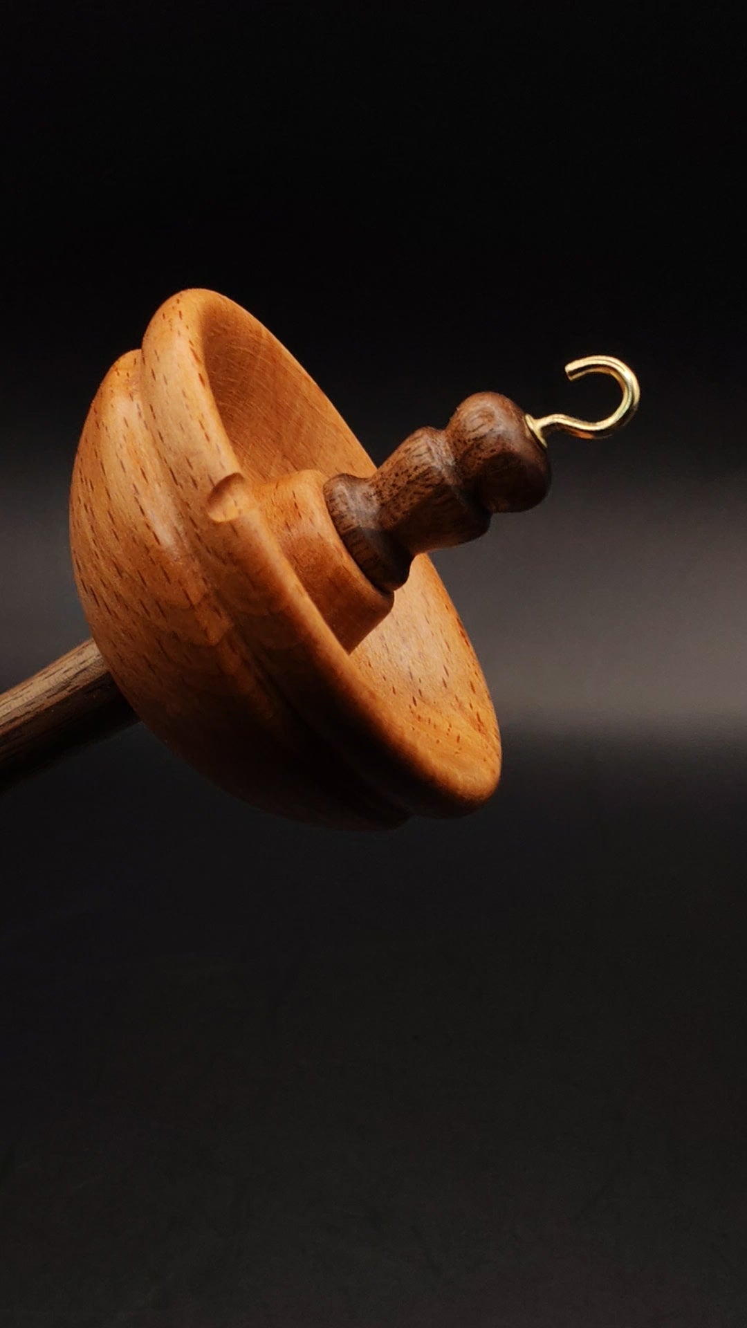This handcrafted drop spindle pairs the warm richness of a walnut wood shaft with the strength and contrast of a red beechwood whorl, resulting in a beautiful and durable spinning tool.