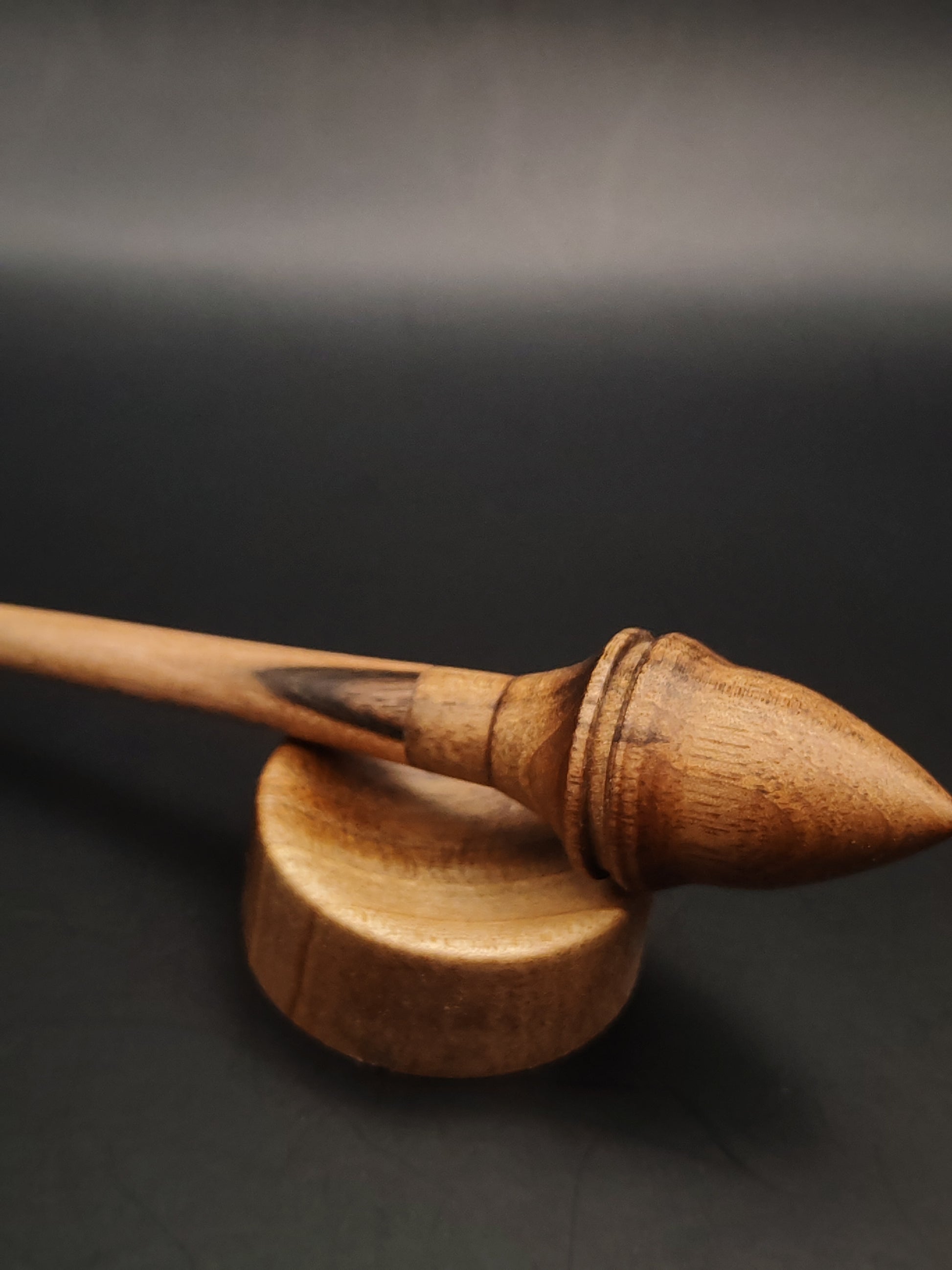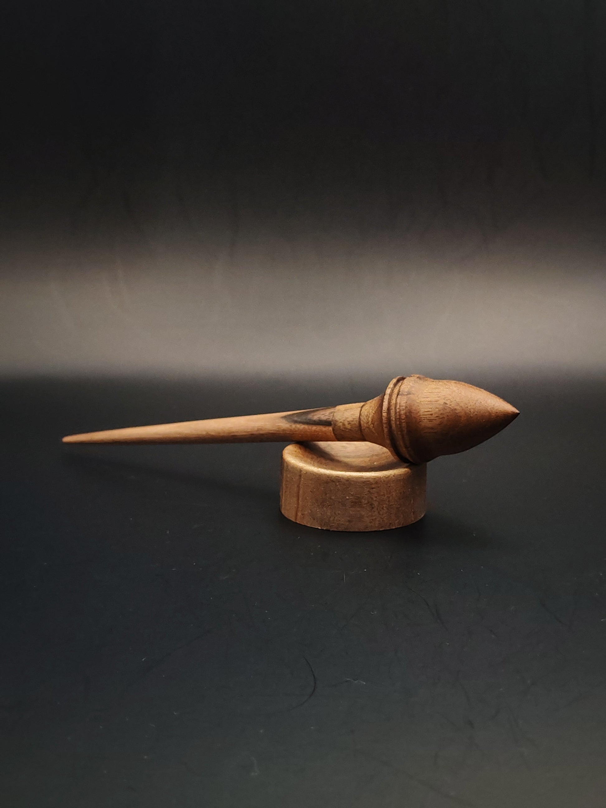 Light, elegant, and perfectly suited for detailed spinning work—this handcrafted mini support spindle is made entirely from walnut wood and weighs just 9 grams. Its small size and weight make it ideal for spinning lace-weight yarn or for those who prefer a delicate, responsive tool.