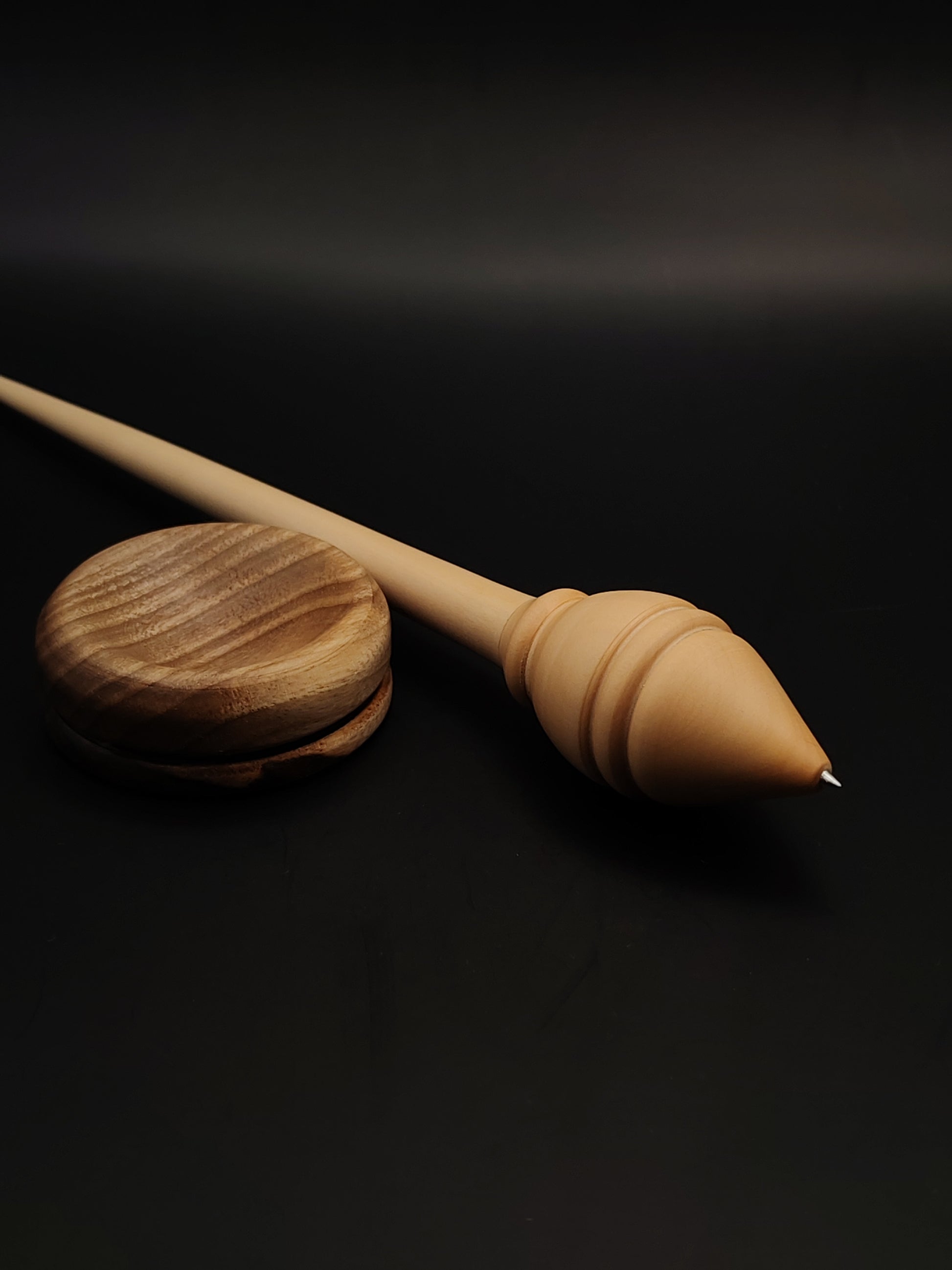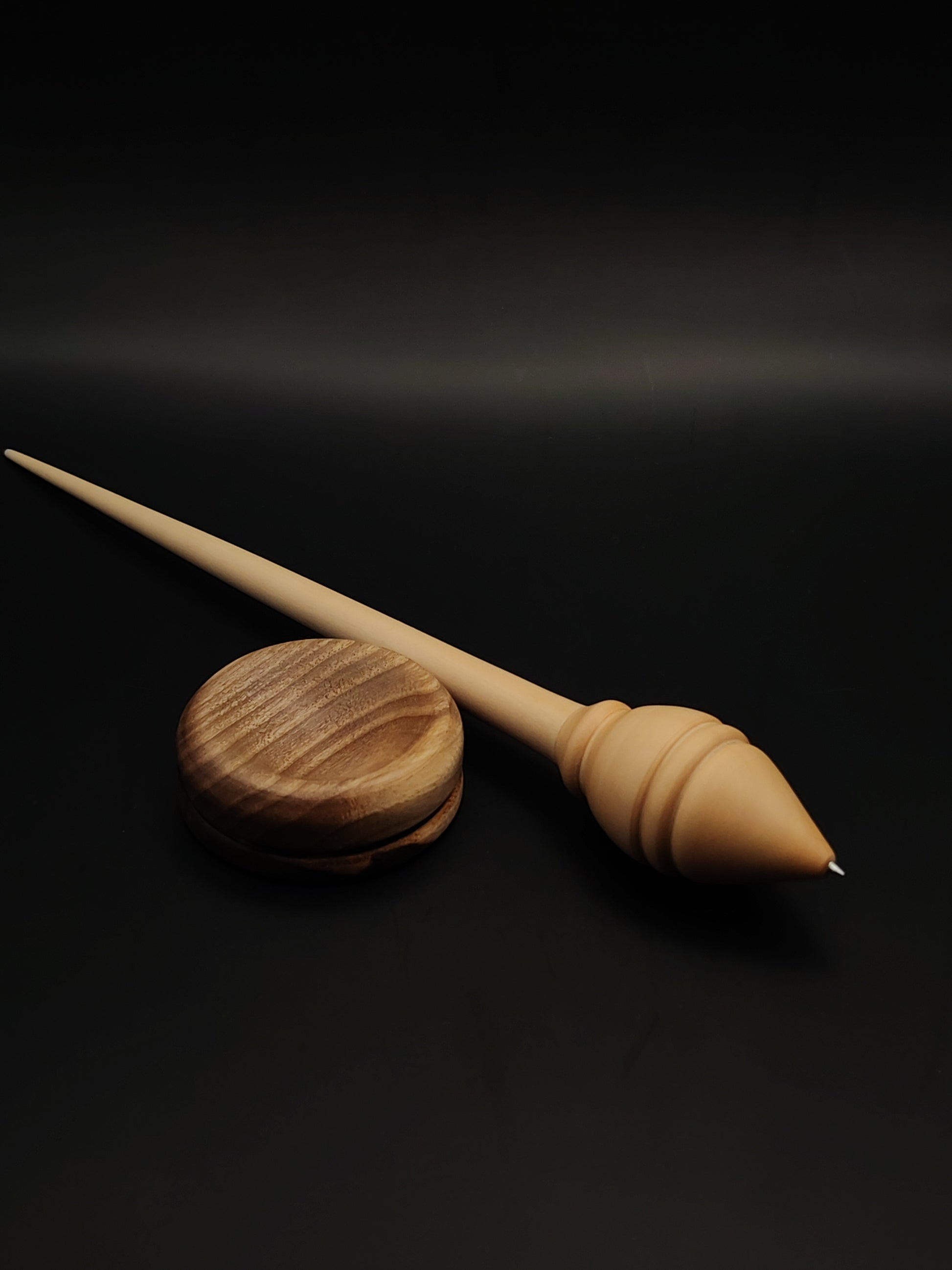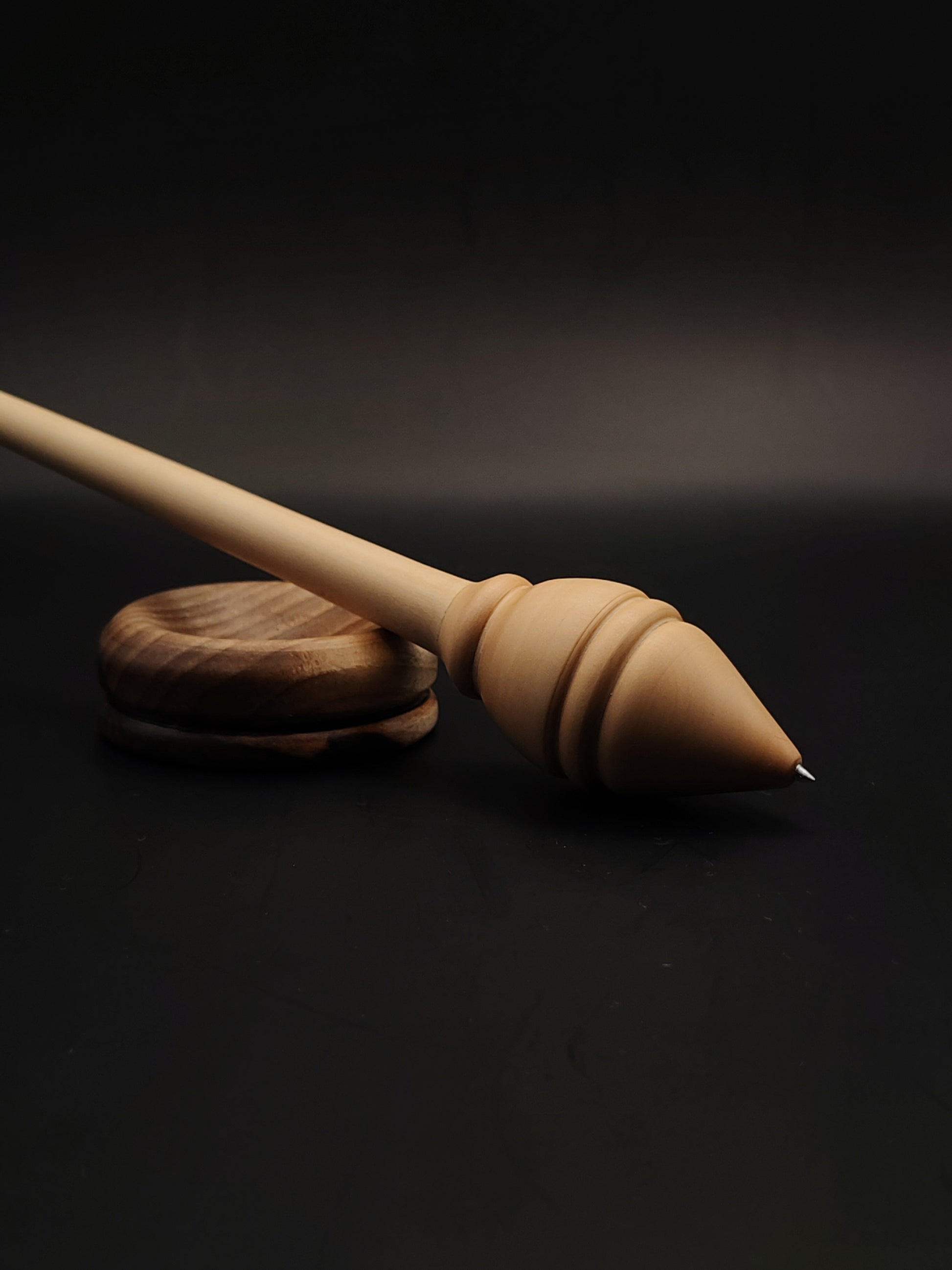 The included walnut support bowl adds a warm visual contrast and a stable spinning base. Both spindle and bowl are finished with organic, non-toxic wax, allowing the natural wood texture to remain breathable, tactile, and beautiful over time.