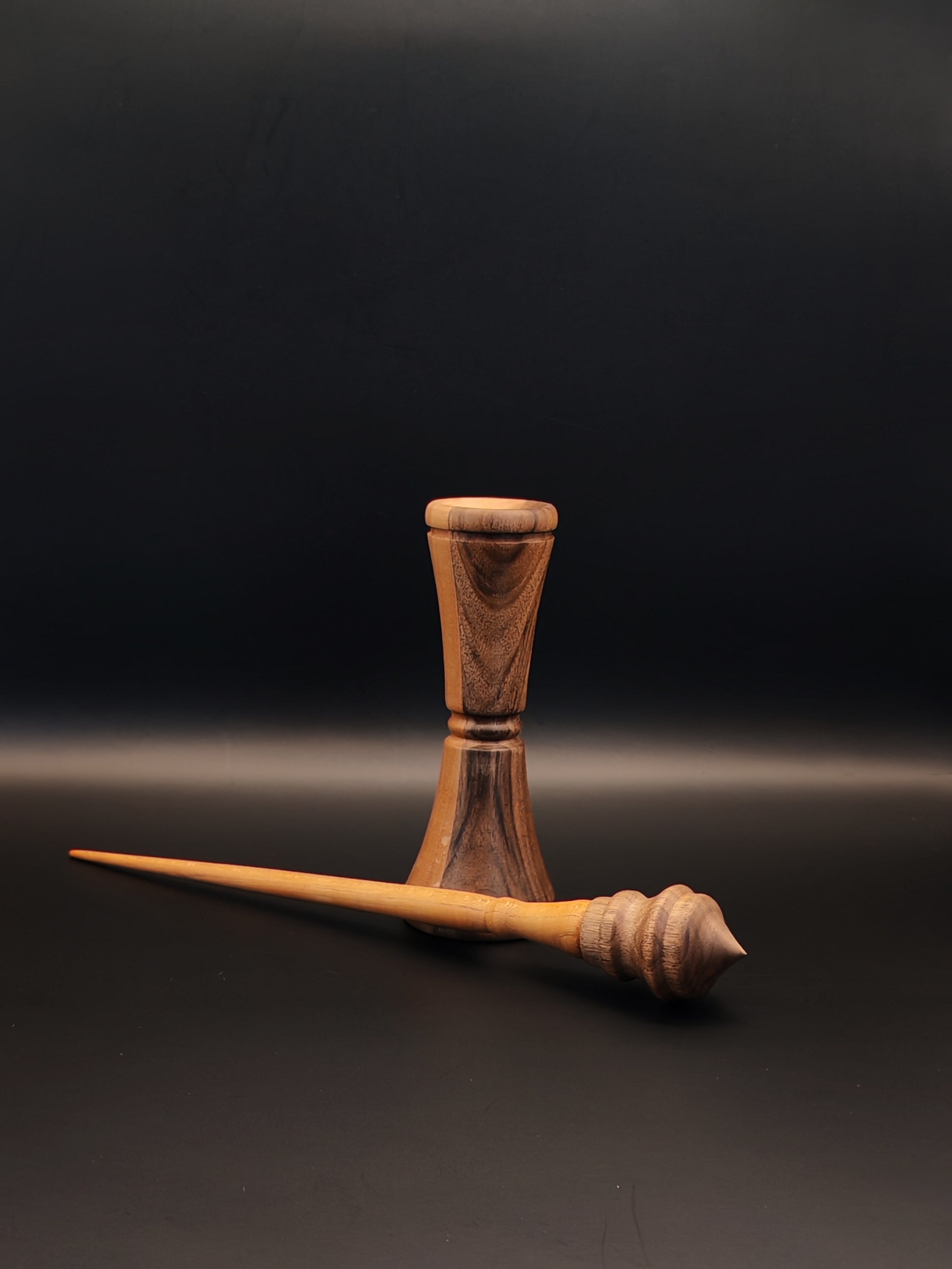 Experience the artistry of hand-spinning with this elegantly crafted Support Spindle Set. The spindle features a robust plum wood shaft crowned with a captivating walnut whorl. At 23.5 cm (9.25 inches) in length and weighing 19 grams (0.67 ounces), it offers a balanced and satisfying spinning experience.