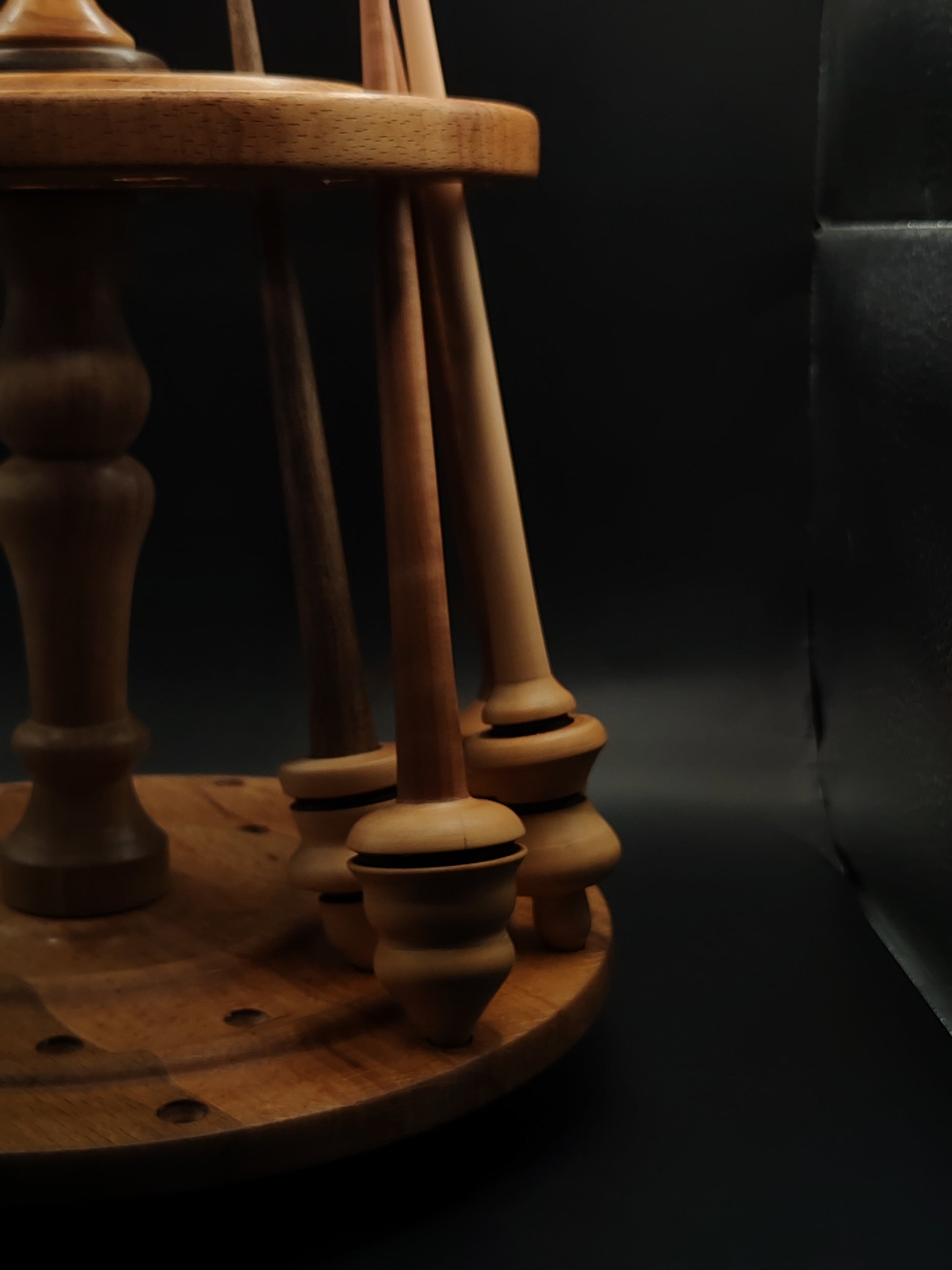 A beautifully handcrafted spindle stand designed to hold up to 24 support and drop spindles, this piece is perfect for keeping your spinning tools safe, upright, and elegantly displayed.