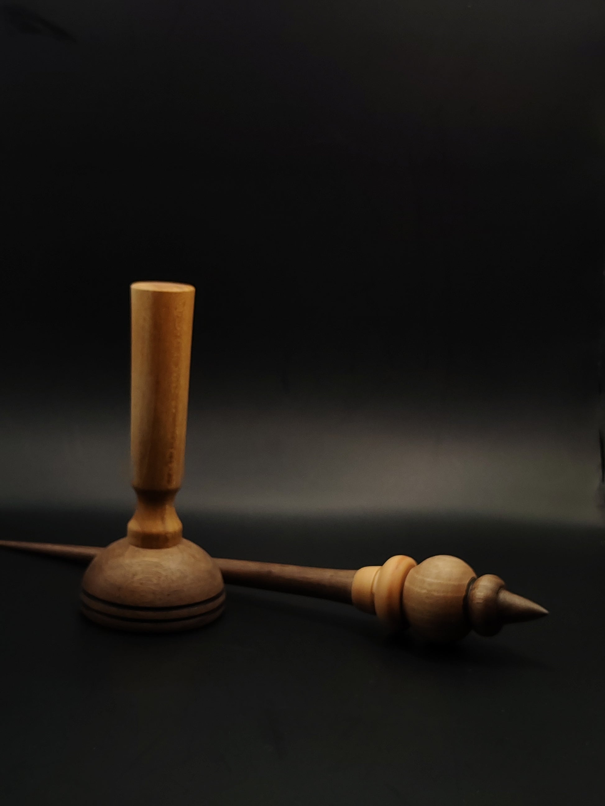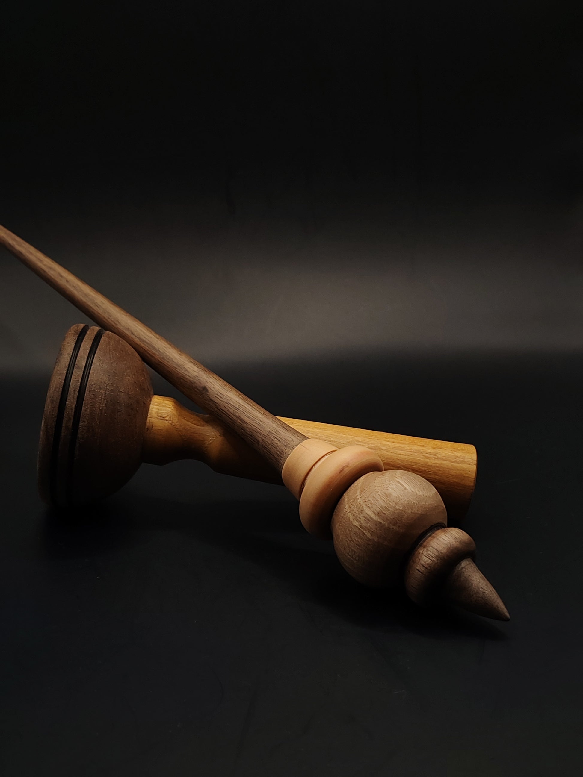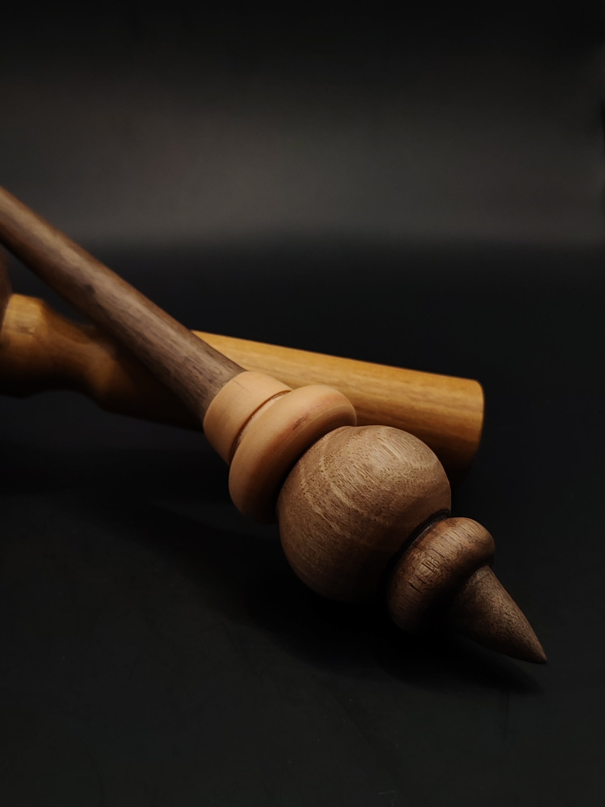 This elegant support spindle is crafted from a combination of walnut and apple wood, offering a beautiful balance between weight, control, and visual character. Weighing 33 grams (1.16 oz) and measuring 28 cm (11 in), it is well-suited for plying or spinning medium to heavier yarns.