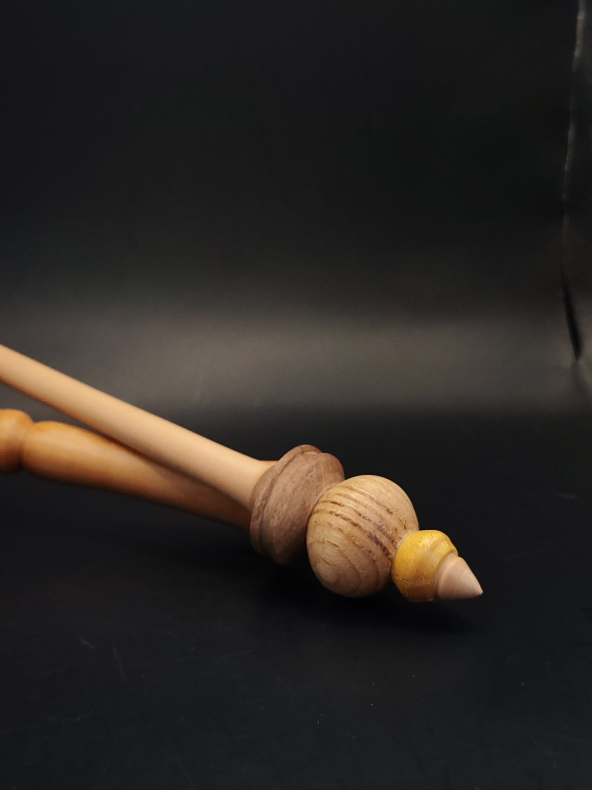 Rich in contrast and beautifully balanced, this artisan support spindle set features a smooth apple wood shaft paired with a distinctive multi-wood whorl crafted from walnut, chestnut, and mulberry. The set is completed with a pear and beechwood lap support bowl for stable, extended spinning sessions.