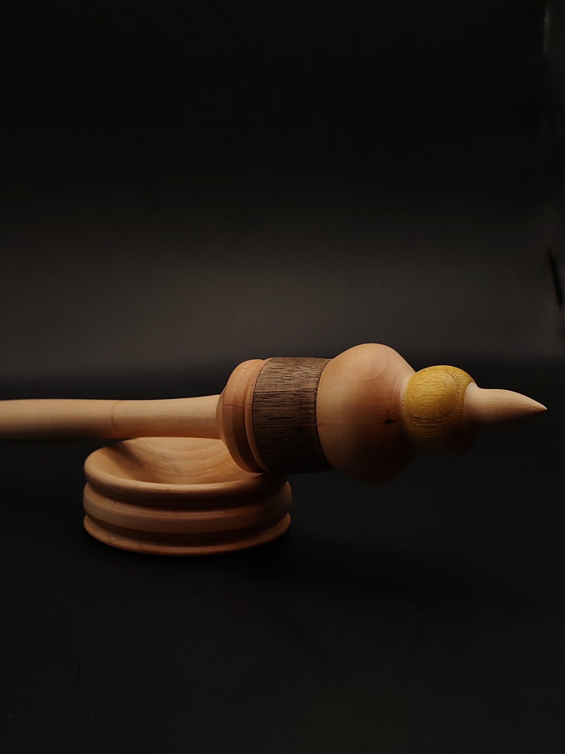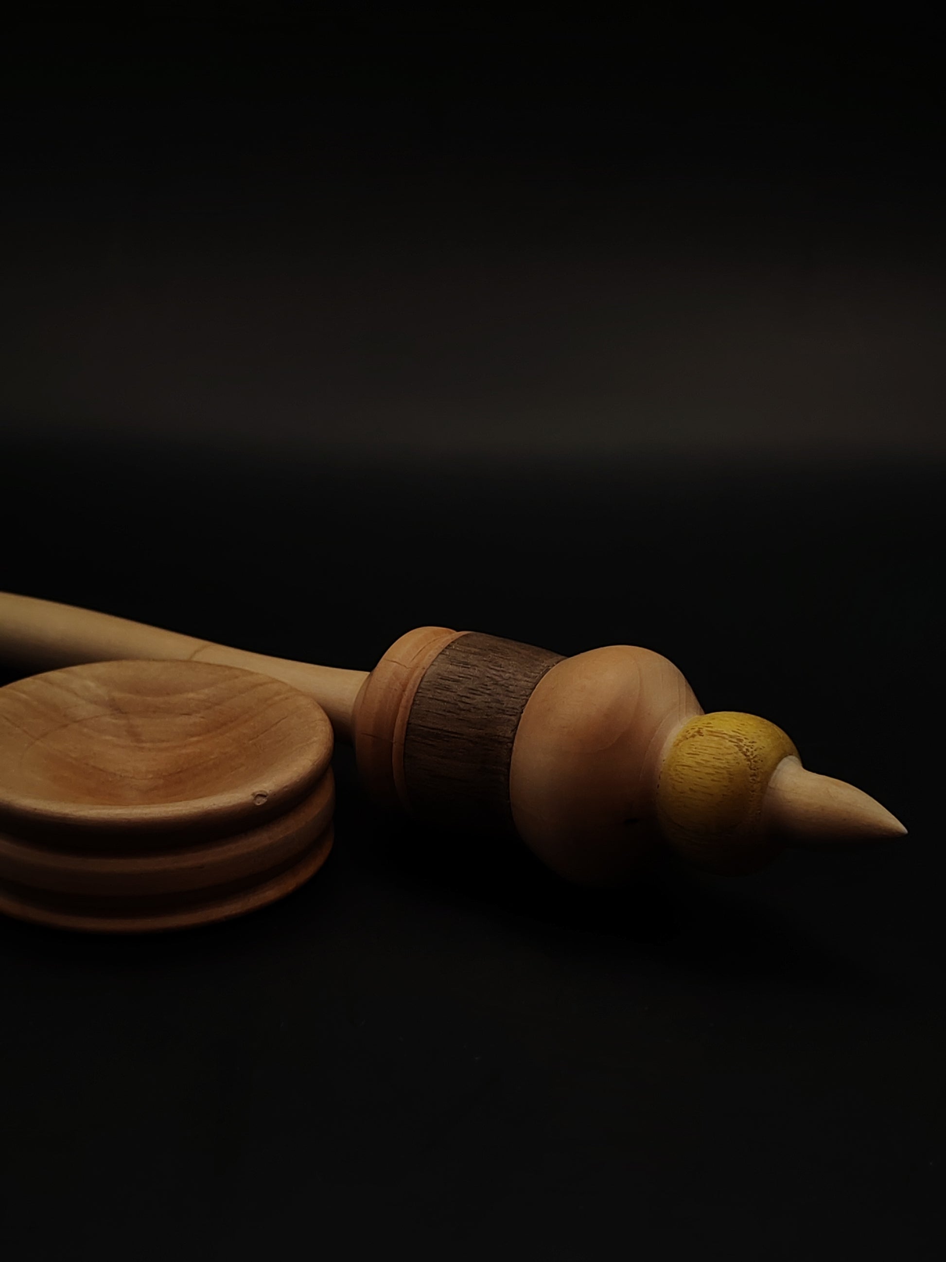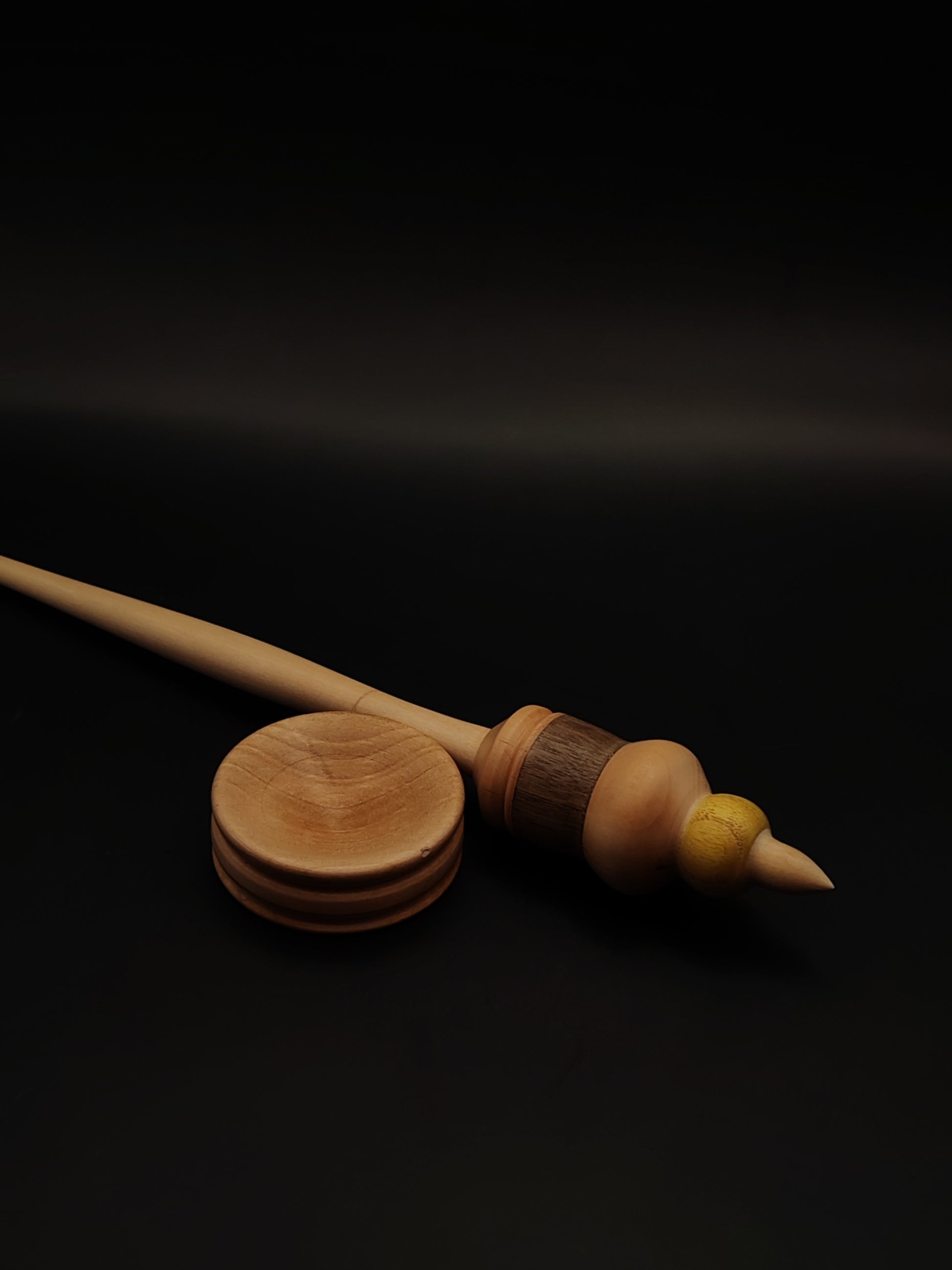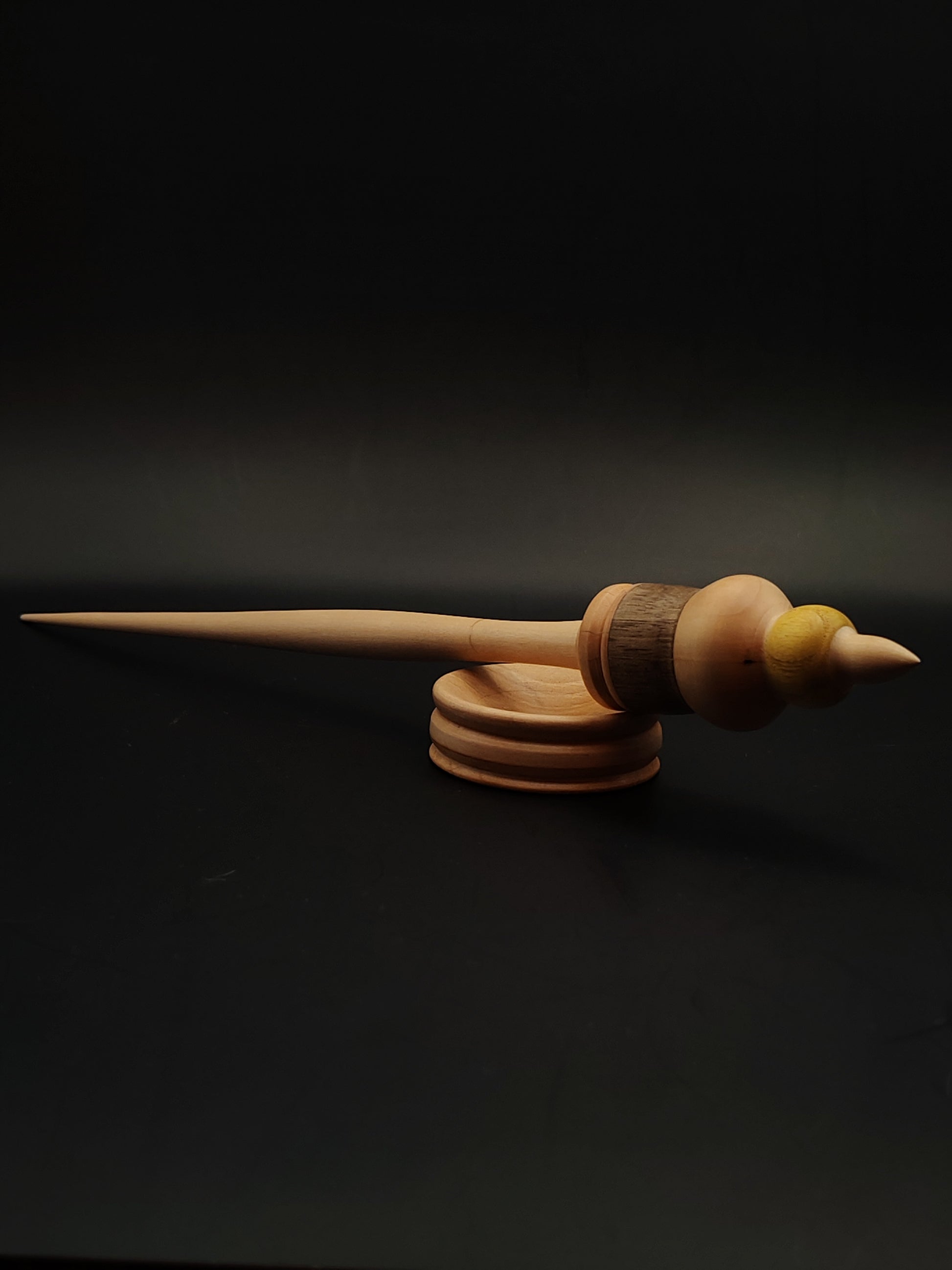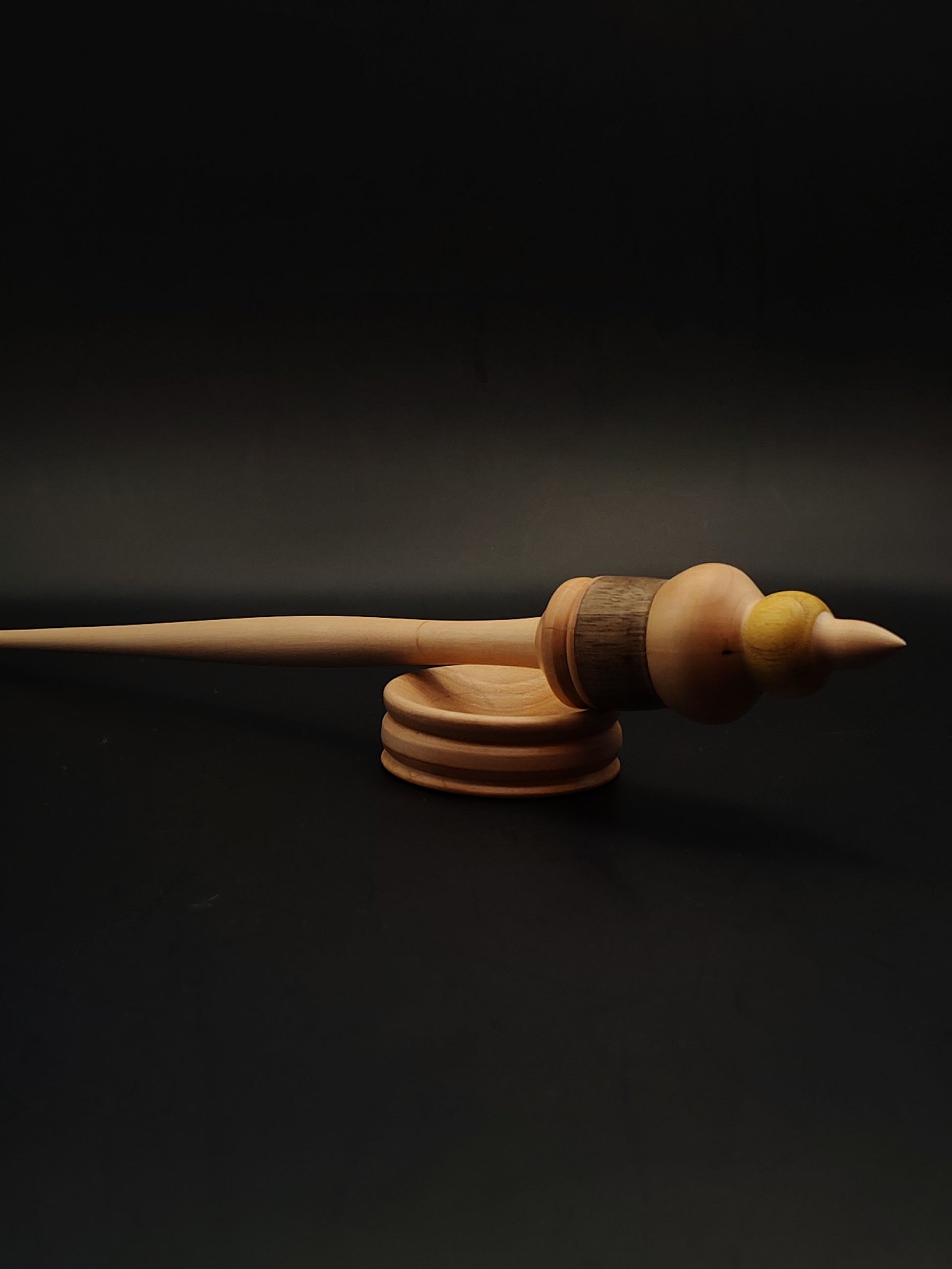 Support Spindle – Apple, Pear, Mulberry & Walnut Wood – 29g / 1.02oz, 30cm / 11.81in – With Pear Support Bowl | Mixed-Wood Spindle for Supported Spinning | Kravelli Spindles