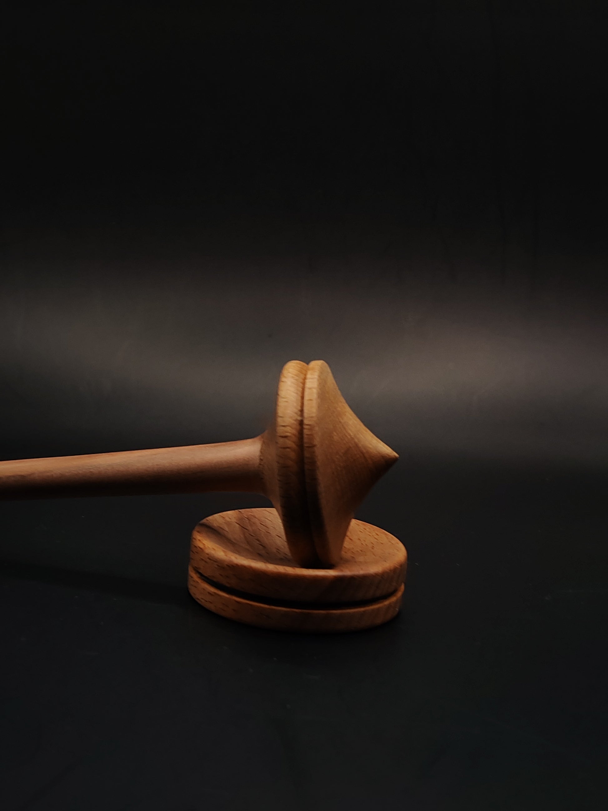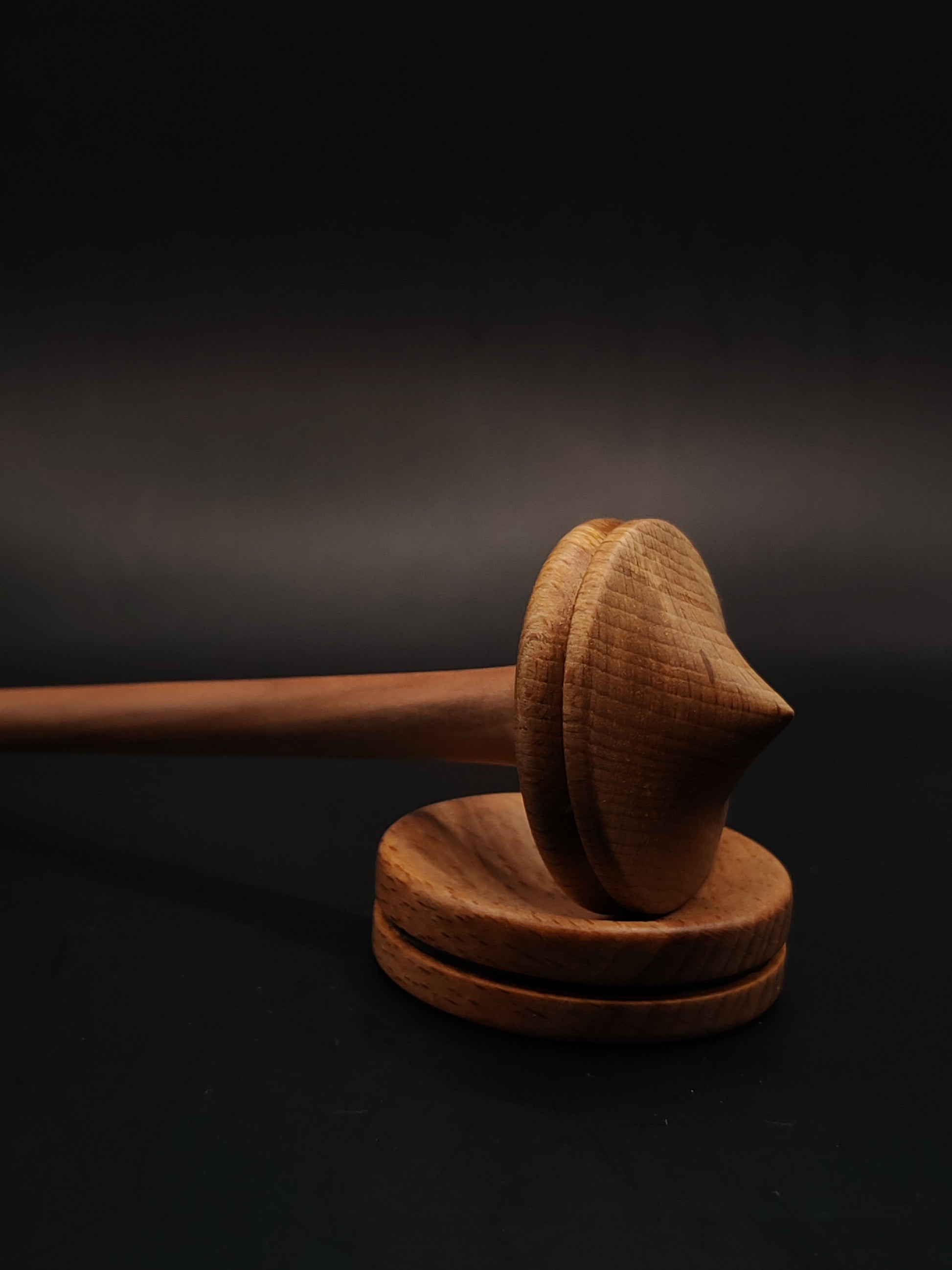 A uniquely crafted support spindle made from an elm wood shaft and beech wood whorl, thoughtfully balanced for smooth, consistent spinning. At 24 grams (0.85 oz) and 23 cm (9 in) long, this spindle offers a compact yet stable tool ideal for precision work and lace-weight yarns.