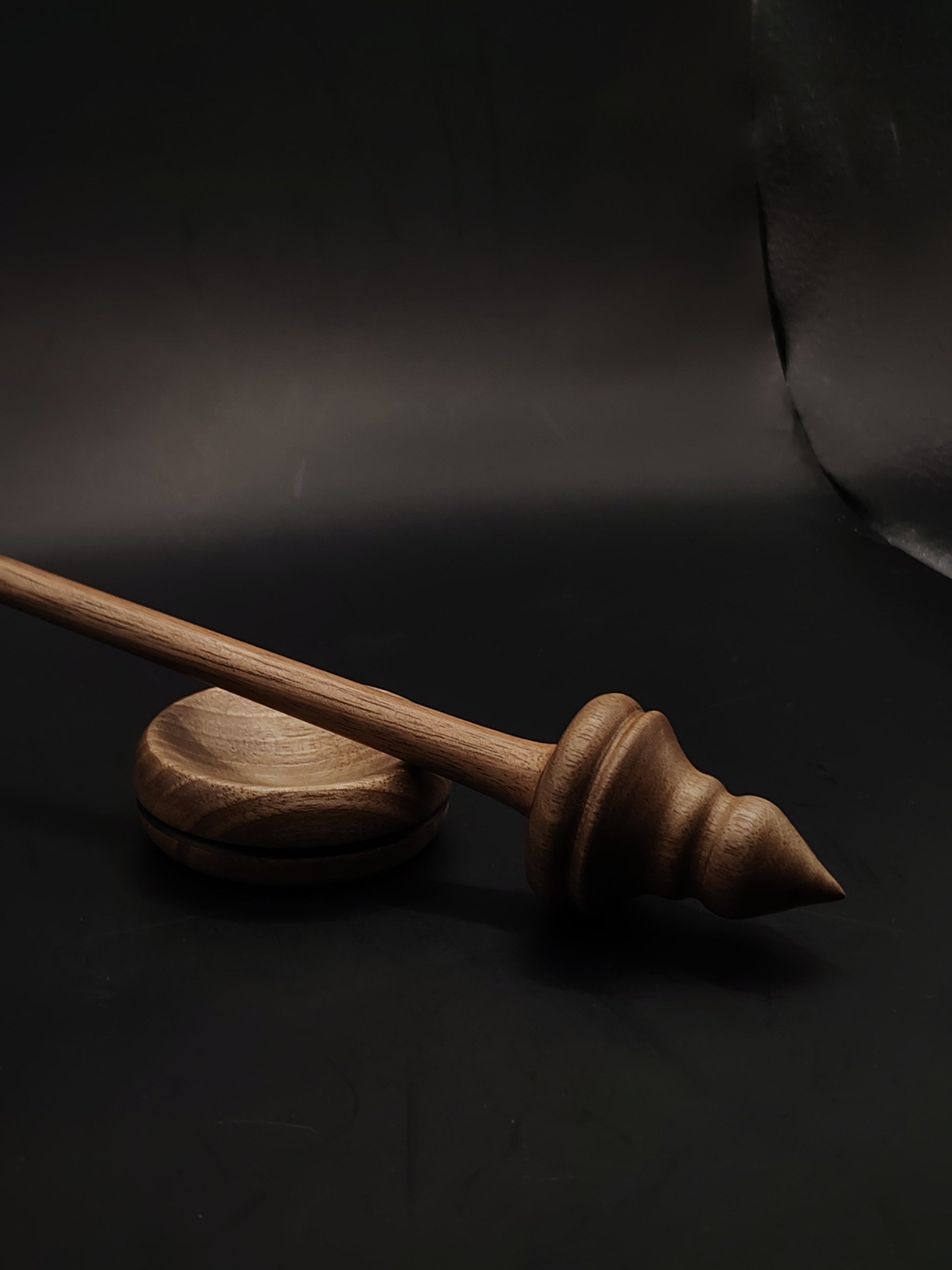 The set includes a matching walnut support bowl, offering a stable and elegant spinning surface — ideal for fiber artists who appreciate traditional tools with artisan craftsmanship.