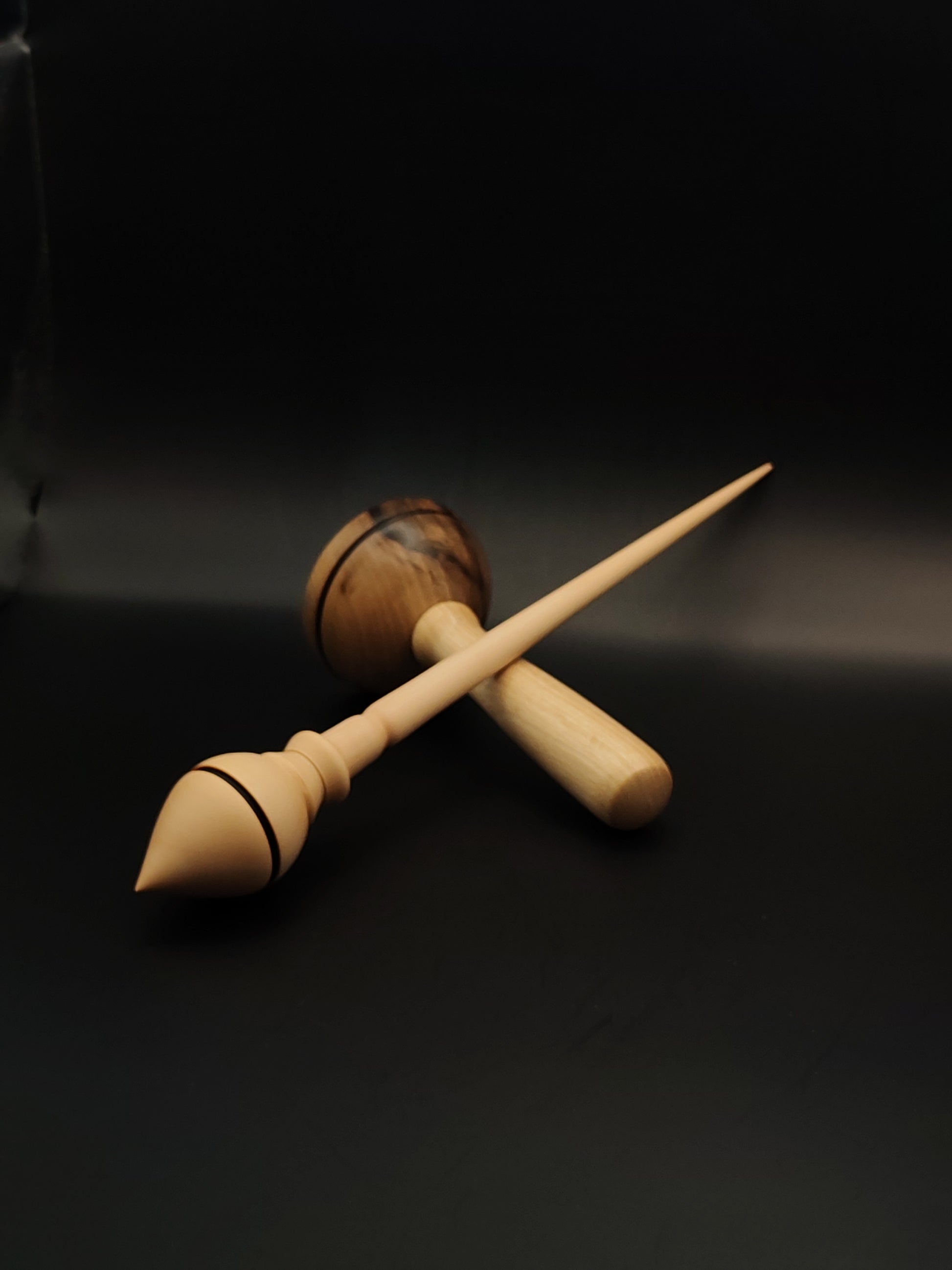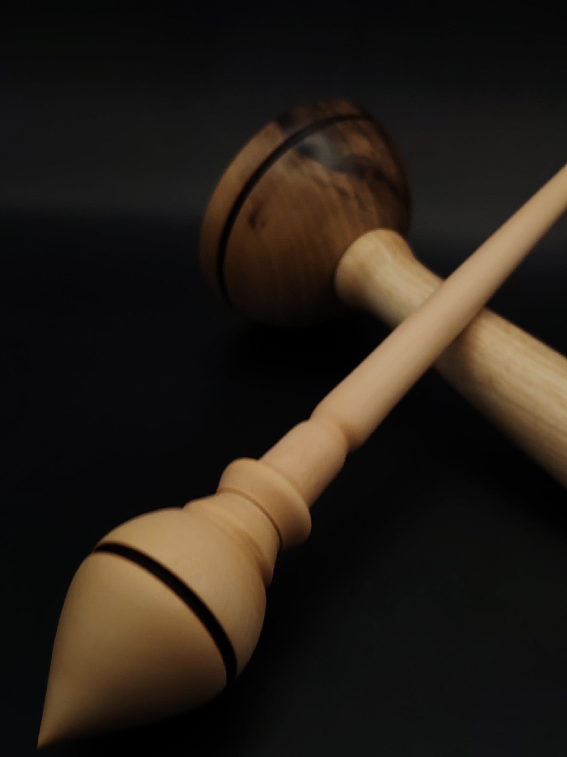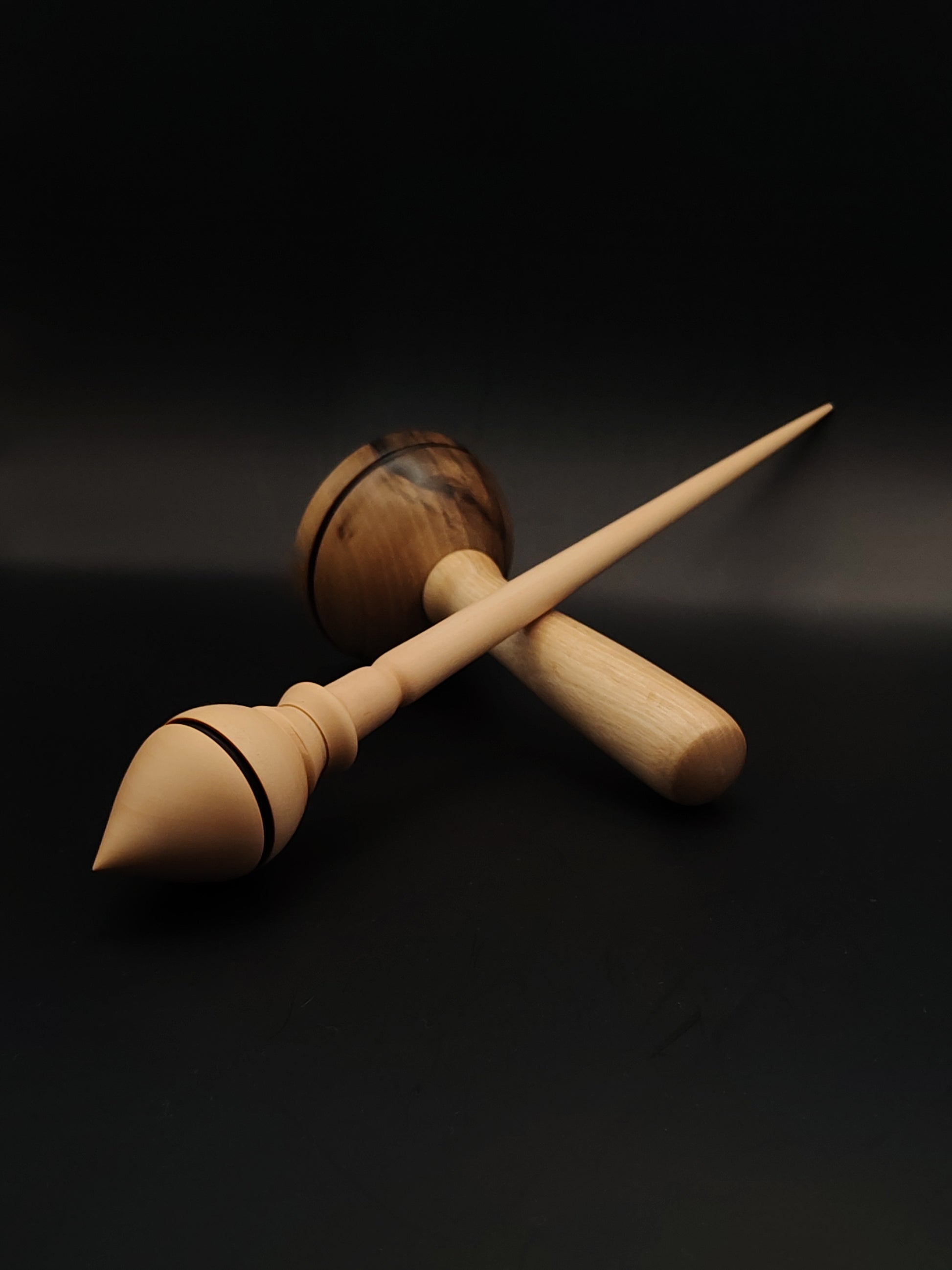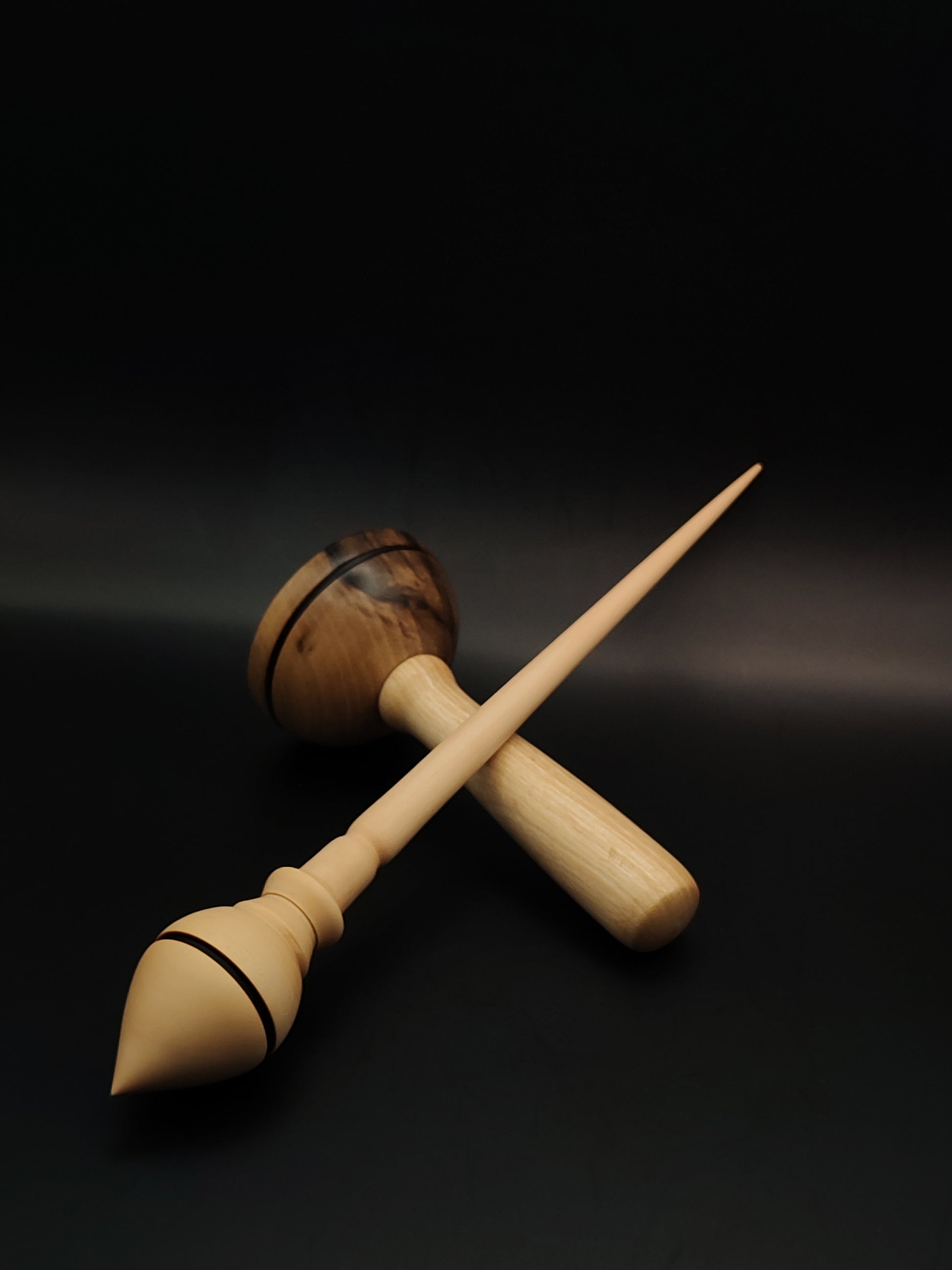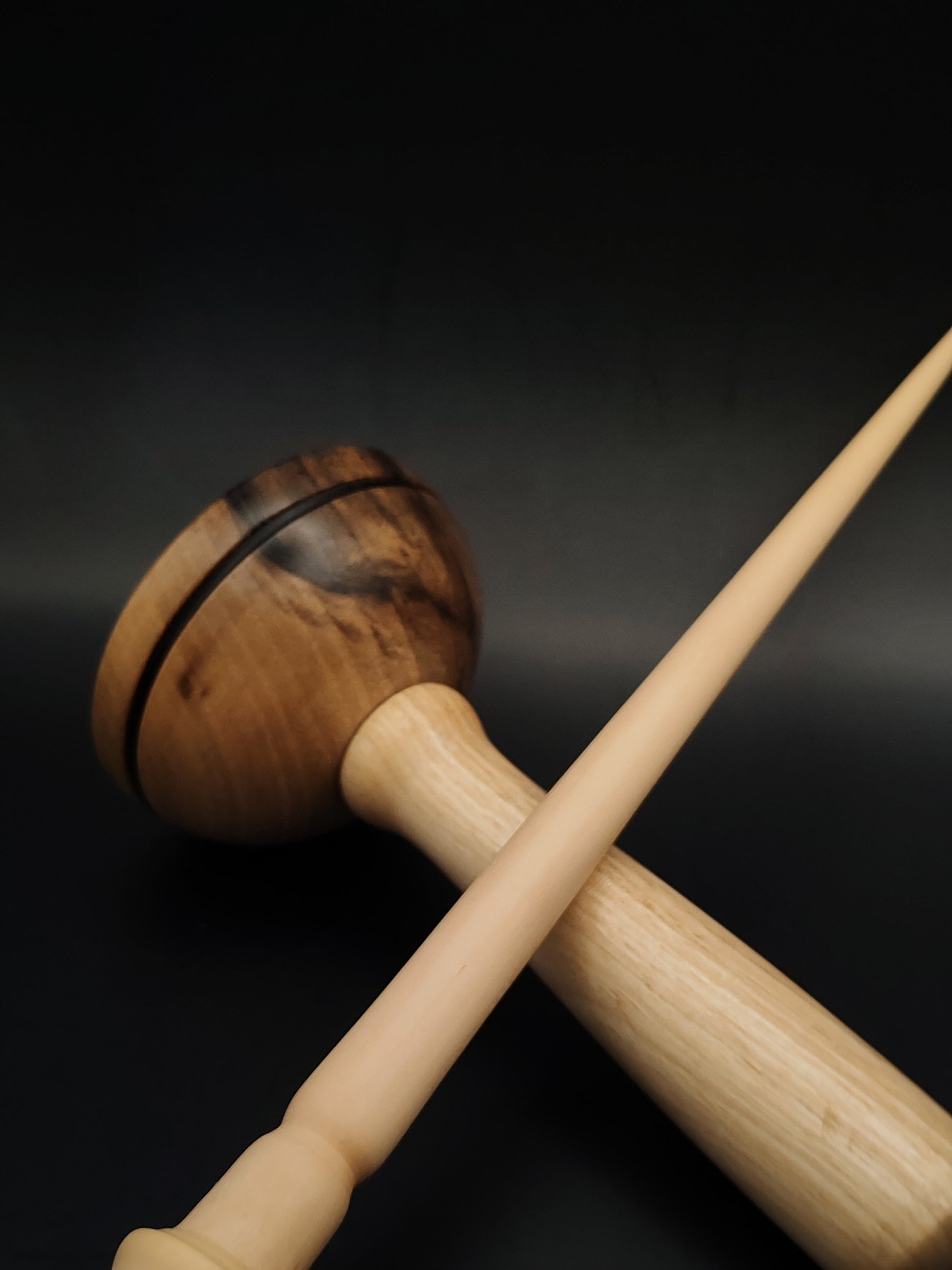 Paired with a walnut lap support bowl, this set combines function and form in a tool built for smooth, stable supported spinning. The white pear’s fine grain and light color contrast beautifully with the rich walnut tones of the bowl, creating a refined visual and tactile experience.